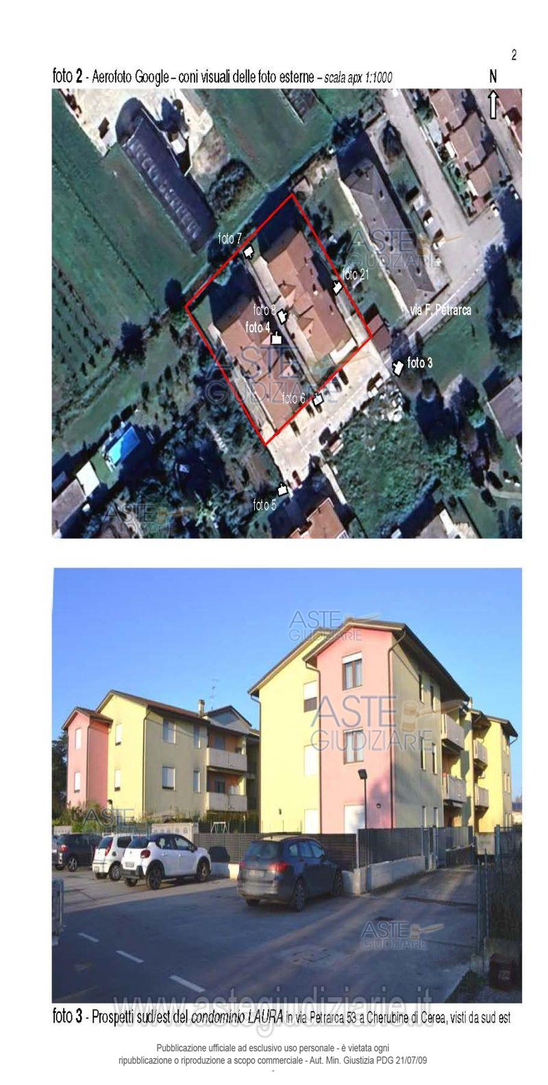 In Cerea (VR), frazione Cherubine, alla via Petrarca civ. n° 53, Piena proprietà dell’intero di appartamento al piano 2° di un complesso condominiale di due edifici a tre piani fuori terra con autorimessa al piano scantinato, superficie commerciale totale m² 80,68 oltre alla proporzionale quota di comproprietà ai sensi dell’art. 1117 c.c. sugli enti, spazi e servizi comuni dello stabile condominiale. Si invita a consultare documenti dell'asta. Per info: IVG Verona tel. 0454851352.