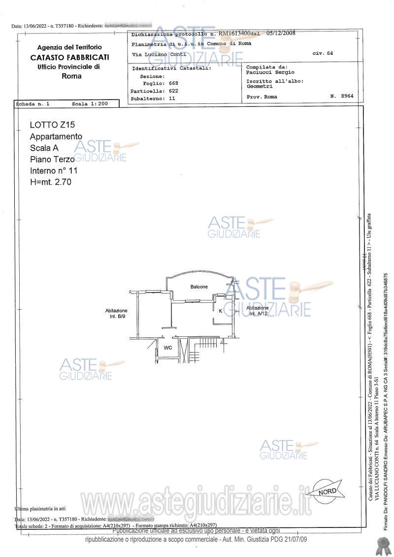 LOTTO 1 Quota pari a 1/1 del diritto di proprietà su appartamento per civile abitazione in Roma, Via Luciano Conti n. 64, Località Ponte di Nona, posto scala A, piano 3, interno 11
