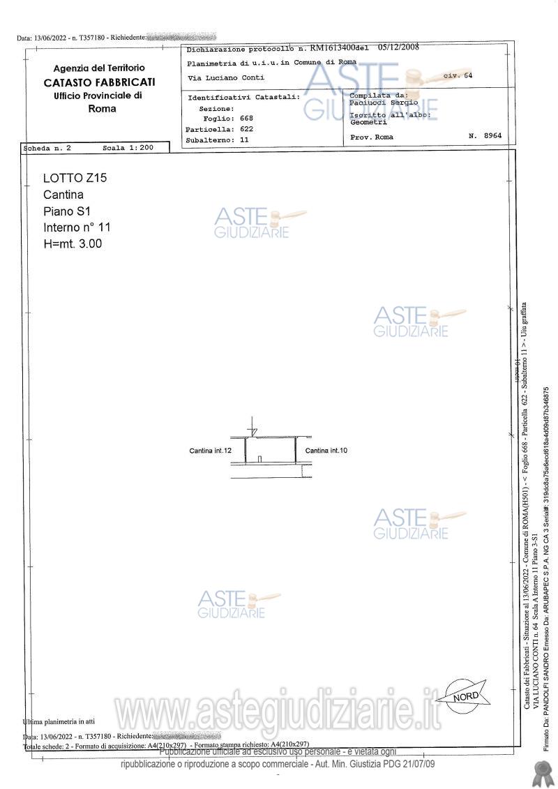 Quota pari a 1/1 del diritto di proprietà su appartamento per civile abitazione in Roma, Via Luciano Conti n. 64, Località Ponte di Nona, posto scala A, piano 3, interno 11, composto da ingresso, soggiorno/pranzo, camera, bagno (con affaccio su cavedio interno), cucina, ampio balcone accessibile sia dal soggiorno/pranzo che dalla cucina. L’appartamento dispone di un’unica esposizione (est), risulta comunque sufficientemente luminoso e ben areato naturalmente. Tutti gli ambienti presentano una forma regolare e risultano sufficientemente ampi, oltre una cantina posta al piano interrato scala A interno 11 e box auto, con accesso da Via Luciano Conti n. 60, scala A, piano interrato interno 53.Identificato al Catasto Fabbricati del Comune di Roma al foglio n. 668, particella 622:-sub 11, categoria A/2, classe 5, z.c. 6, vani 4,5, mq 65, rendita catastale € 627,50 graffato, l’appartamento; -sub 219, la cantina, piano S1, graffato;-sub 173, categoria C/6, classe 12, consistenza mq 13, superficie catastale mq 14, rendita catastale € 52,37, piano S1, il box auto.ConfiniL’appartamento – scala A / piano 3° / interno 11 -, nel suo insieme, confina con: vano scala, appartamento interno 9 della scala B, appartamento interno 12 della scala A, distacchi, salvo se altri e/o diversi confini. Locale cantina – scala A / piano S1 / n. 11 -, nel suo insieme, confina con: locale cantina n. 10, locale cantina n. 12, distacchi condominiali, salvo se altri e/o diversi confini. Box auto – piano S1 / n. 53 -, nel suo insieme, confina con: spazio comune di manovra, box auto n. 35, box auto n. 54, salvo se altri e/o diversi confini. La costruzione dell’immobile, di cui la porzione in esame è parte (appartamento/cantina/box auto), è avvenuta a seguito del rilascio da parte del Comune di Roma delle seguenti autorizzazioni (come anche rilevasi dall’atto di provenienza): PERMESSO DI COSTRUIRE 30.05.2007 427 PERMESSO DI COSTRUIRE 10.09.2008 769 D.I.A. 27.01.2009 7422 PERMESSO DI COSTRUIRE (RIFERITO ALLA SCALA “E”) 06.05.2009 349 COMUNICAZIONE DI “FINE LAVORI” 19.02.2009 15232 RICHIESTA AGIBILITA’ – IMMOBILE IN VIA L. CONTI, 60/76 - 05.05.2011 QI/2011/35381 RICHIESTA AGIBILITA’ – IMMOBILE IN VIA L. CONTI, 72 - 05.05.2011 QI/2011/35389 RICHIESTA AGIBILITA’ – IMMOBILE IN VIA L. CONTI, 74 - 05.05.2011 QI/2011/35395 Formalità pregiudizievoli non cancellabili dalla procedura: Sequestro Conservativo del Tribunale di Roma del 26.11.2013 trascritto al n. 87356 in data 18.12.2013 fino alla concorrenza di euro 230.000,00. Contro *********per la quota intera, tra l’altro, dell’immobile in oggetto. A favore di ****** nata a *******e di ******* nato a ********.Stato di occupazione: l’immobile risulta occupato, in forza di un contratto di locazione abitativa, ex art. 2 co 3 L. 431/98, della durata di anni 3+2, registrato presso l’Agenzia delle Entrate in data 17/11/2015 al n. 12421 Serie 3T; nominato legale per incardinare la procedura di sfratto per morosità.