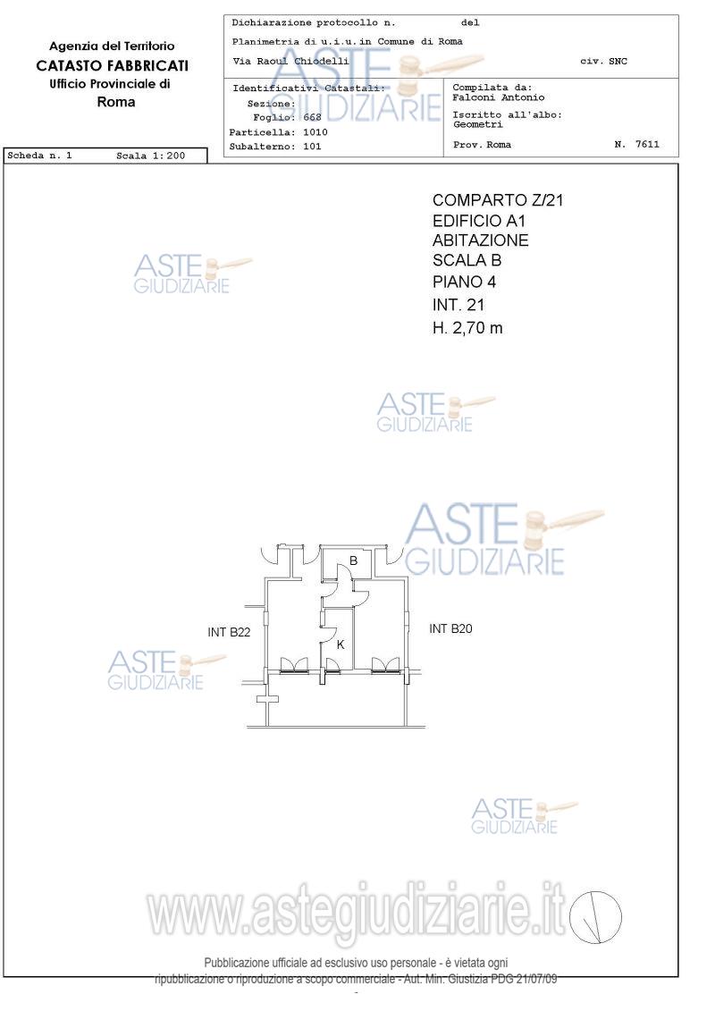 1/1 Propr. in Roma via Raoul Chiodelli, 63-65, Ed. A1: appart. Sc. B, int. 21, P4, ingresso, sogg. cucina, camera, bagno, disimp. mq lordi 57,00, balcone mq lordi 24,00. CF Comune di Roma foglio 668, part 1010, sub. 101 cat A/2.Posto auto PT int 25 mq lordi 12,50. CF Comune di Roma foglio 668, part 1010, sub. 30 cat C/6. Corrispondenza con planimetria catastale. Privo di certificato di agibilità. Immobile in corso di liberazione
