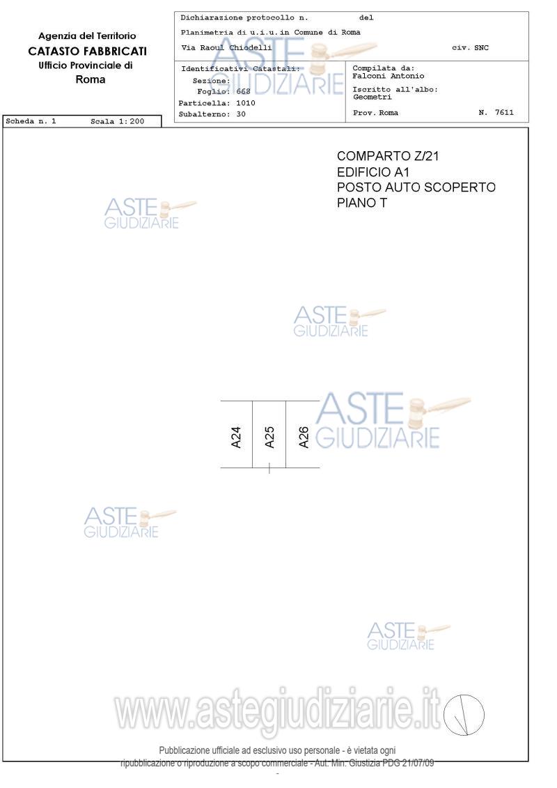 Quota pari a 1/1 del diritto di piena proprietà su:- posto auto al piano terra, int 25 per complessivi mq lordi 12,50. A confine con area di manovra comune, posto auto int A24, piano pilotis comune, posto auto int A26. Censito nel CF del Comune di Roma al foglio 668, particelle 1010, sub. 30 cat C/6, classe 8, rendita € 26,03.
