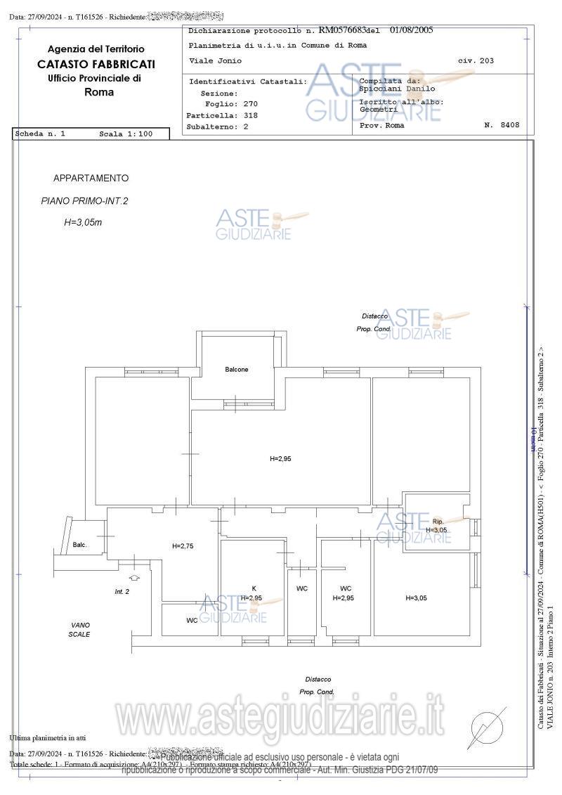 Quota pari a 100/100 del diritto di proprietà su appartamento sito in Roma – Viale Jonio 203,interno 2, piano 1, composto da ingresso; da tre camere; salone doppio; corridoio; cucina;disimpegno; un bagno; due wc di cui uno molto piccolo; un ripostiglio due terrazzi, percomplessivi mq. 143 mq.Dati catastali: Identificato al Catasto Fabbricati del Comune di Roma al foglio n. 240 part. 318sub. 2, Cat. A/2 Cl.3, vani 8, rendita catastale € 2.148.46.Confini: l’appartamento confina con scale condominiali; distacco su spazi condominiali edistacco verso Viale Jonio, salvo altri.Corrispondenza catastale: sussiste corrispondenza tra lo stato dei luoghi e la planimetriacatastale esistente nonché con quanto presente nell’atto di pignoramento. La planimetriacatastale è conforme allo stato dei luoghi.Regolarità Urbanistica – Edilizia: L'immobile risulta regolare per la legge n° 47/1985. Lacostruzione è antecedente al 01/09/1967. Non sono presenti vincoli artistici, storici o alberghieri.Non sono presenti diritti demaniali o usi civici. L'immobile risulta agibile. Costruito in virtù dilicenza edilizia n. 355 prot. 3344/1953 per la quale è stata rilasciata Abitabilità n. 1225 del10/09/1957. Successivamente per l'appartamento in questione in data 21/09/2004 è statapresentata D.I.A. ai sensi degli articoli 22 e 23 del DPR 380/2001 ed in data 09/02/2005 per taleDia è stato protocollato certificato di Collaudo. Stato Conservativo: Lo stato conservativo dell'immobile non è buono per mancanza di adeguatepulizie e di conseguenza risultano deteriorate alcune superficie di pavimentazioni e qualcherifinitura di pittura.Vincoli od oneri condominiali: Sono presenti vincoli od oneri condominiali.Stato di occupazione: occupato dall’esecutato che vi abita (non potrà emettersi l’ordine diliberazione prima del decreto di trasferimento).Il tutto come meglio descritto nell’elaborato peritale depositato in atti, cui integralmente sirimanda