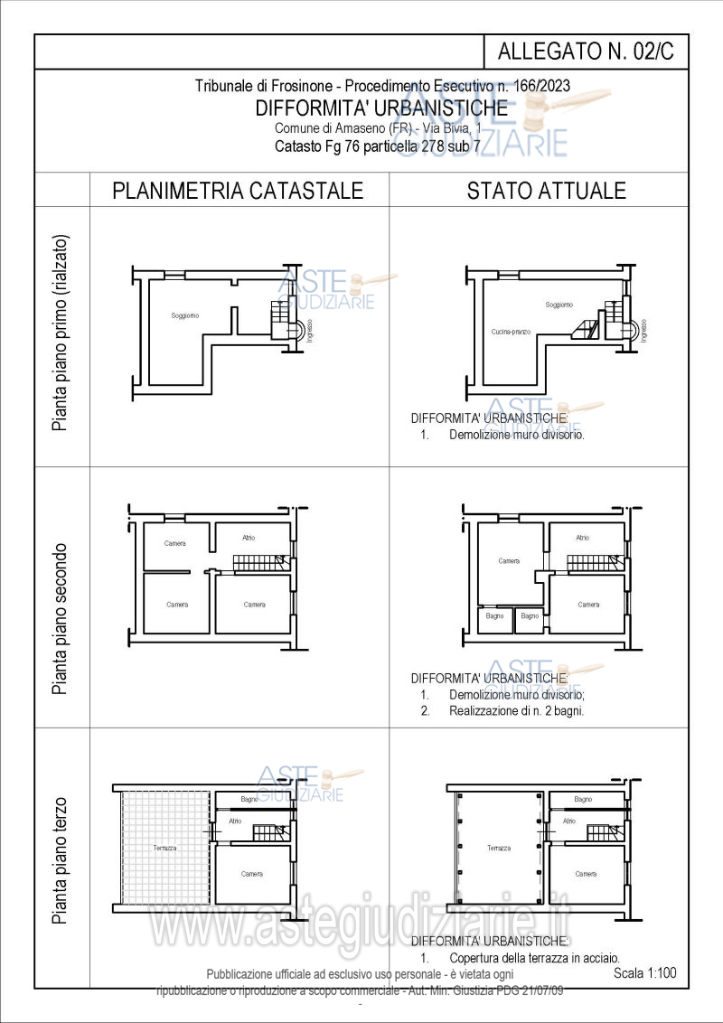 Abitazione su n. 3 livelli sita nel Comune di Amaseno (FR), in Via Bivia, 1. Il bene è ubicato ai piani 1-2 e 3 di una palazzina in muratura di vecchia realizzazione. L'immobile, in buono stato di conservazione, è inserito nel Centro storico ed è caratterizzato da strade piccole per la maggior parte pedonali. Non è climaticamente ben esposto ma presenta all'ultimo piano una gradevole terrazza con vista. Il contesto in cui è situata la palazzina è tranquillo, centrale e dotato di tutti i servizi complementari alla residenza (es. uffici, negozi, ecc..). L'appartamento presenta finiture di buon livello ed è costituito da: Soggiorno, cucina pranzo con camino, n. 2 disimpegni, n. 3 camere, n. 3 bagni ed un'ampia terrazza. Fg. 76, Part. 278, Sub. 7, Categoria A3.
