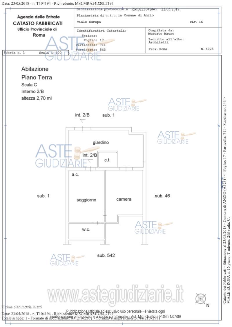 Appartamento ubicato in Anzio (Rm), Viale Europa 16, scala C, interno 2B, piano T, posto al piano terra composto da soggiorno/pranzo con angolo cottura, una camera da letto, un bagno ed una corte pavimentata esterna di proprietà esclusiva. Nello stato di fatto e diritto in cui si trova, occupato da terzi senza titolo.