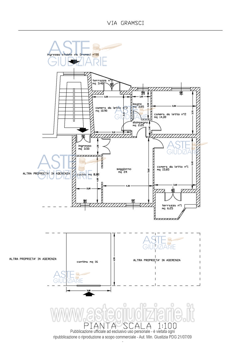 Piena proprietà dell’appartamento per civile abitazione al piano secondo del maggior fabbricato avente accesso dalla Via Gramsci n.20 composto da: ingresso, disimpegno, soggiorno, cucina, tre camere, bagno.