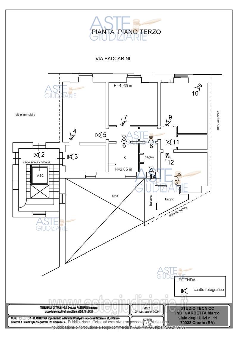 Piena proprietà (quota di 1/1) dell’appartamento ubicato a Barletta (BT) - Via A. Baccarini n. 21, piano terzo, superficie convenzionale complessiva di 131,85 mq, identificato al catasto Fabbricati al Fg. 134, Part. 515, Sub. 34, Categoria A3, classe 5, consistenza 5,5 vani, superficie catastale 135,00 mq, rendita € 667,52, piano 3.