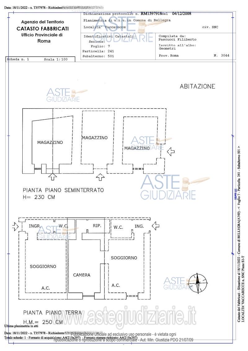 •Area di corte, P.T. censita al NCT al foglio 7 particella 400 di are 01,46 locale di deposito sito in Bellegra (RM), Località Tubano, P.T. Censito al NCEU al foglio 7, particella 385 categoria C/2, Classe 3, consistenza 48,00 mq, superficie catastale totale mq 64,00 rendita Euro 44,62 are 1,310 reddito dominicale 4,74