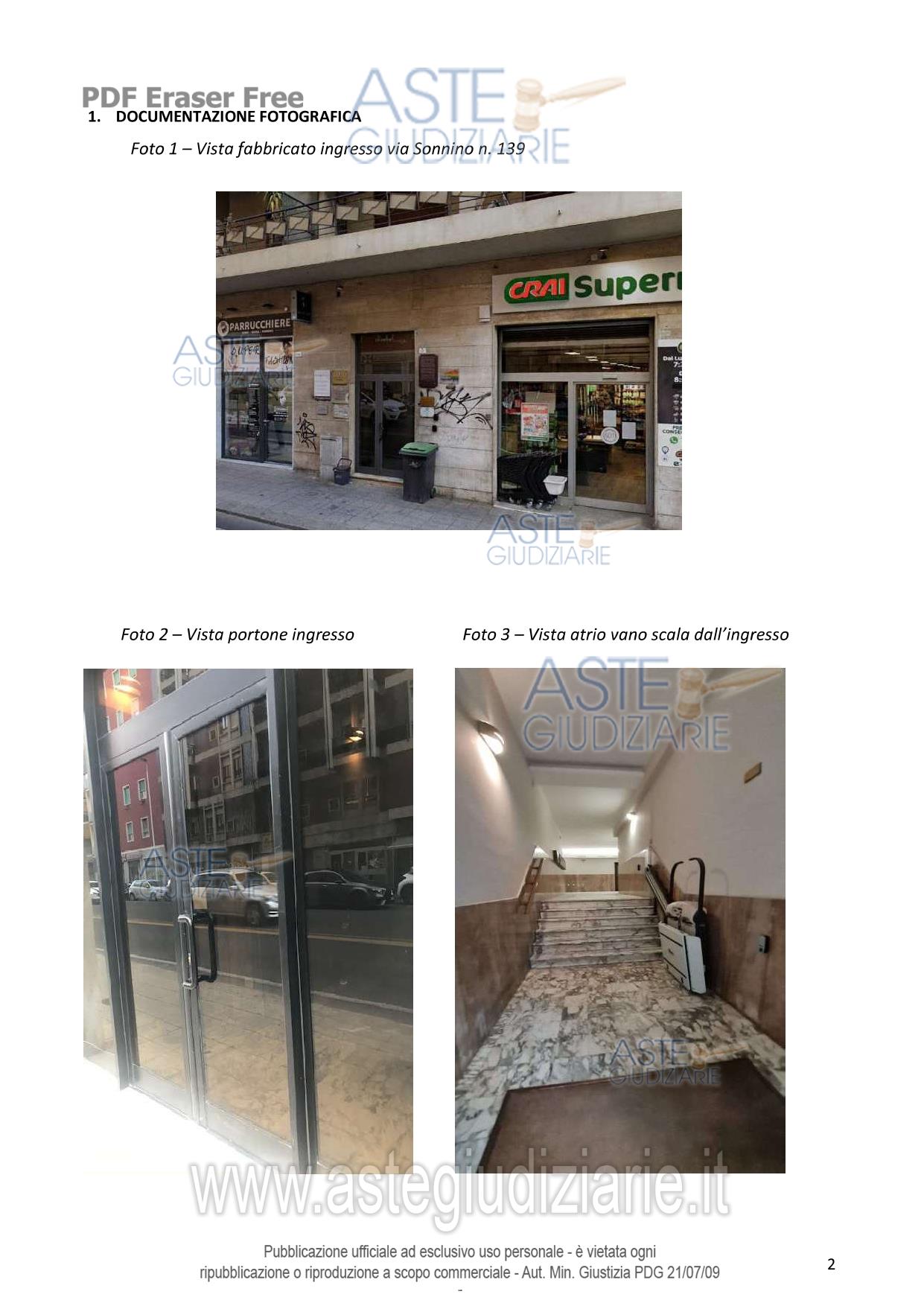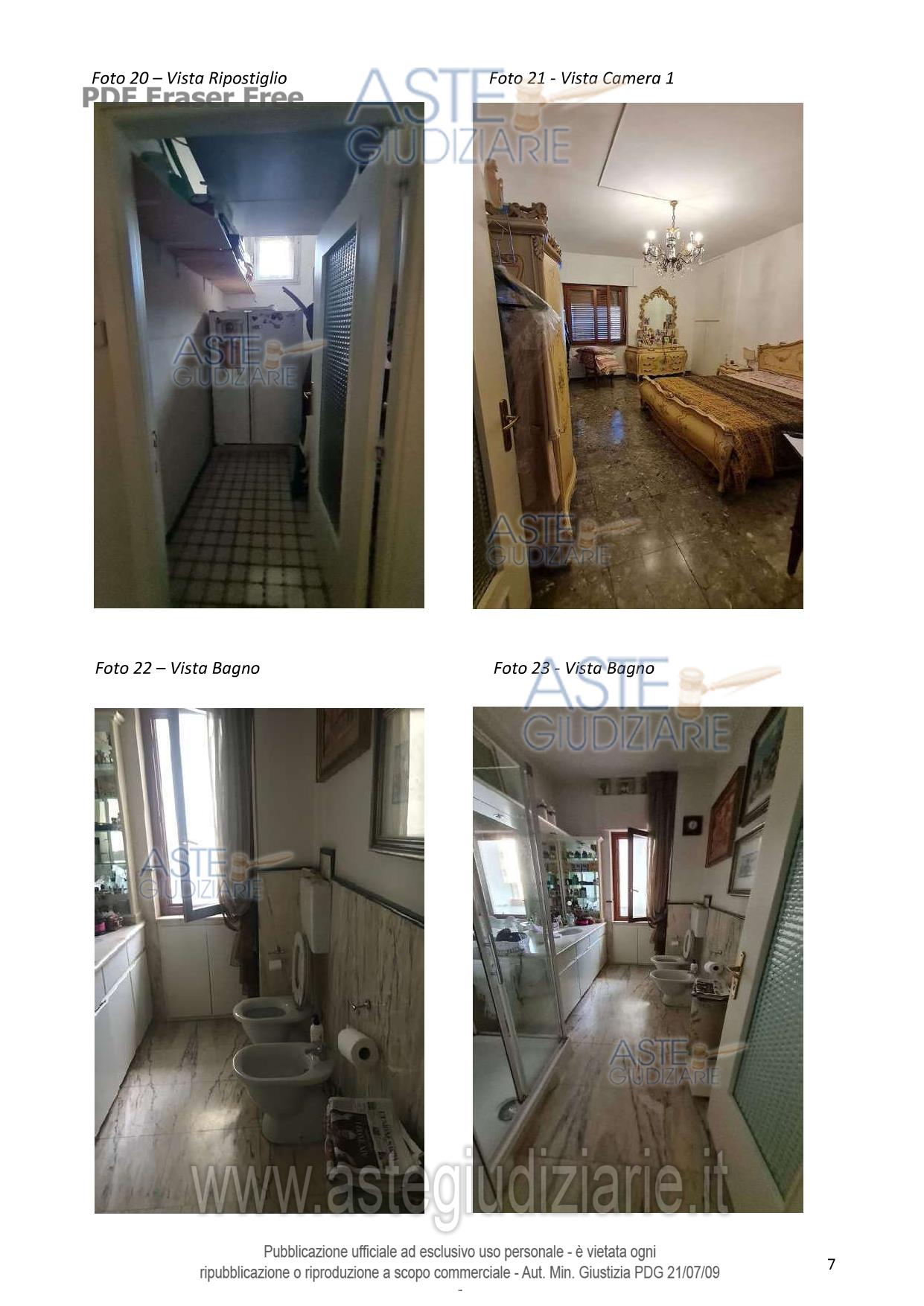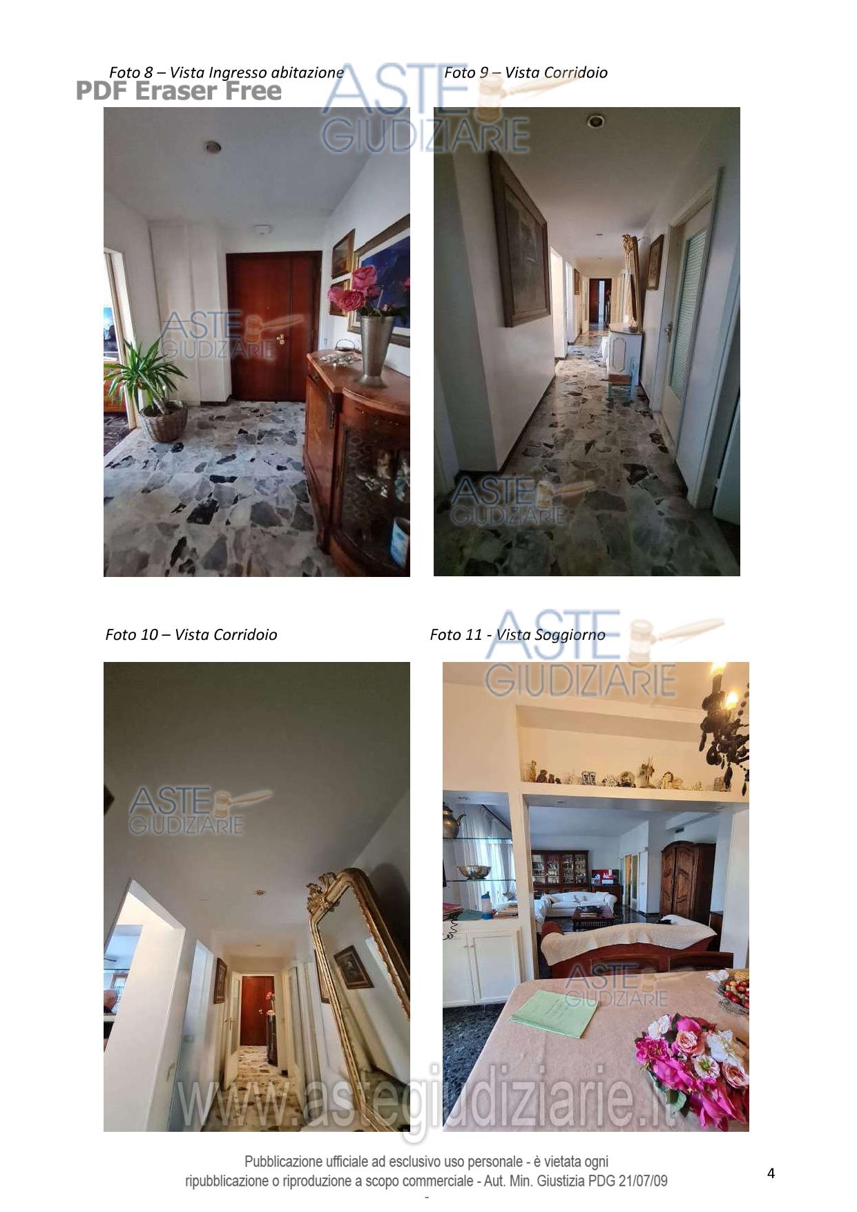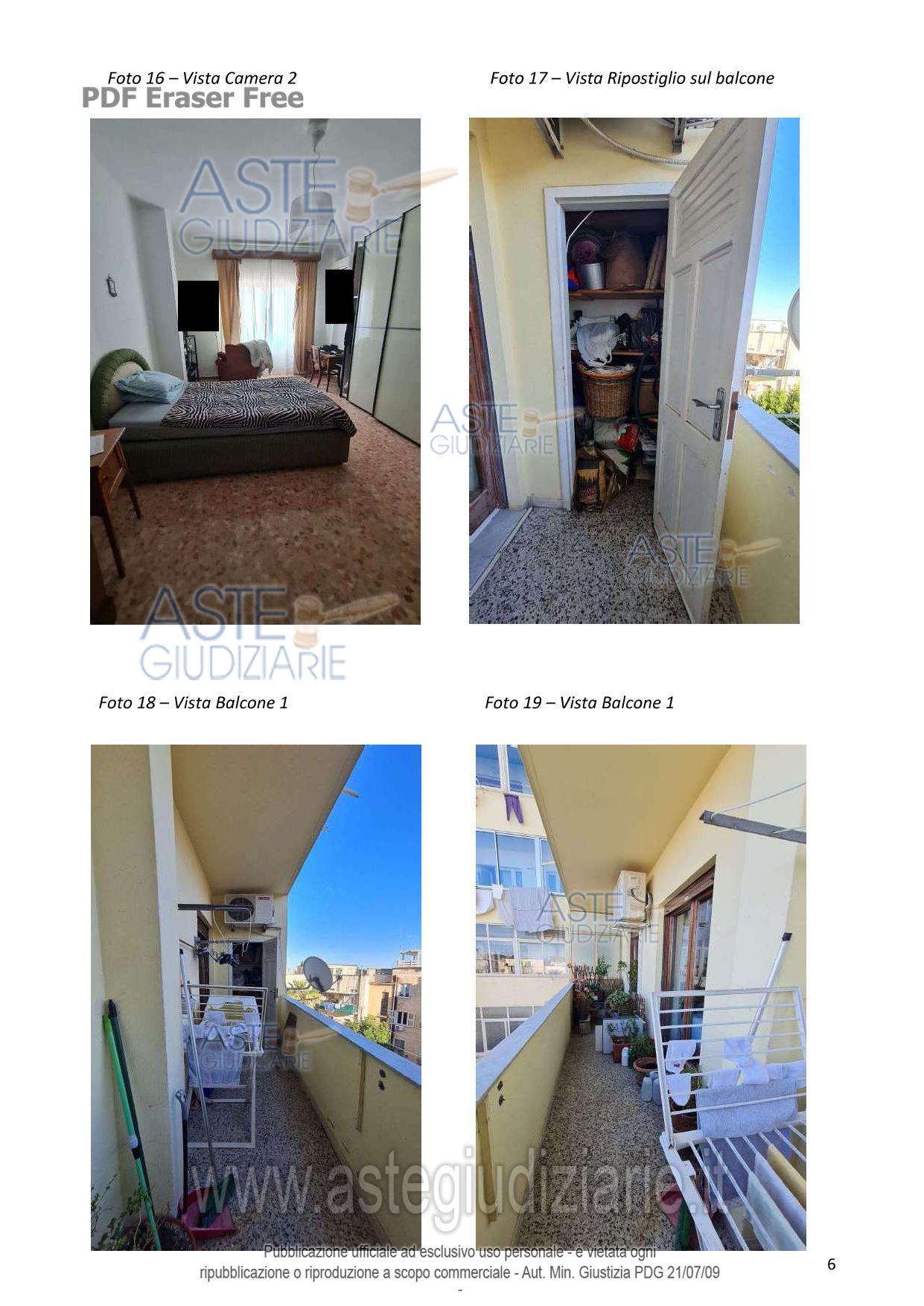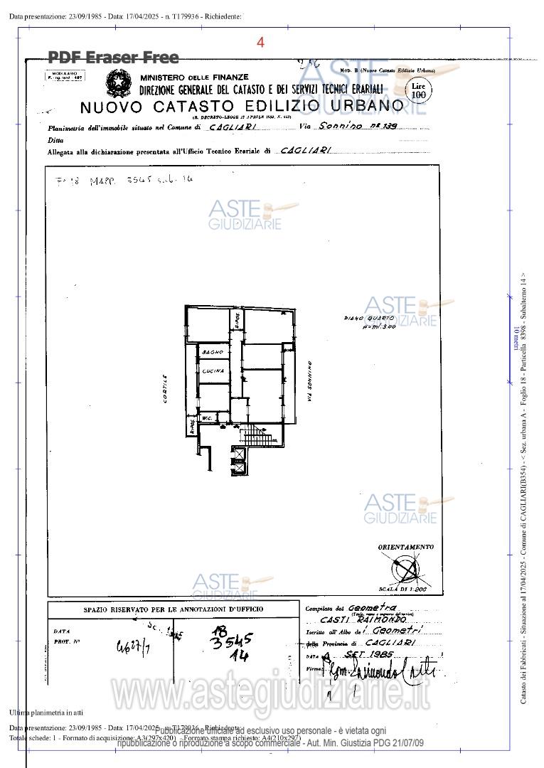 LOTTO UNICO: in Comune di Cagliari, nella Via Sidney Sonnino n. 139 al Piano 4°, quota pari a 1/1 del diritto di proprietà di un fabbricato per civile abitazione costituito da ingresso, pranzo, soggiorno, un ripostiglio, due bagni, un corridoio, tre camere da letto, una cucina, dispensa, oltre a due balconi con ripostiglio e doccia che si affacciano sul cortile interno. L’altezza interna dell’unità immobiliare è pari a m 3,00. Come impianto di riscaldamento e di raffreddamento, sono presenti delle pompe di calore. L’appartamento ha una superficie coperta di circa mq 155,00 circa, una superficie residenziale di mq 133,60 circa e una superficie non residenziale di mq 20,55 circa
