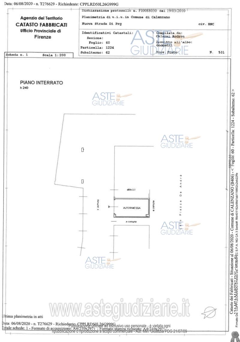 LOTTO A:piena proprietà di unità immobiliari facenti parte del fabbricato ubicato in Comune di Calenzano, avente forma ad elle al quale si accede Piazza F. De Andrè e precisamente l’appartamento con accesso dal vano scale ubicato nell’angolo destro per chi guarda il fabbricato dalla piazza e contraddistinto dal civico 10 di Piazza De Andrè, posto al piano secondo e composto da soggiorno con angolo cottura, disimpegno, due bagni, due camere e terrazzo a loggia. Sono pertinenza del suddetto appartamento:- due cantine posto al piano seminterrato, la prima e la seconda sul lato destro del corridoio condominiale posto a destra per chi esce dall’ascensore;- vano uso autorimessa posto al piano seminterrato, il primo sul lato destro per chi esce dal corridoio condominiale provenendo dal vano scale ed entra nella corsia carrabile di manovra.Al Catasto Fabbricati del Comune di Calenzano quanto in oggetto è rappresentato nel foglio di mappa 60 dalle particelle:- 1224 subalterno 14, categoria A/2, classe 4, vani 5, superficie catastale mq. 94, rendita euro 464,81 (l’appartamento e le due cantine);- 1224 subalterno 62, categoria C/6, classe 4, consistenza mq. 17, superficie catastale mq. 20, rendita euro 107,11 (il vano autorimessa).SERVITU’, ONERI E VINCOLI GRAVANTI I SUDDETTI LOTTI CHE RIMARRANNO A CARICO DEGLI AGGIUDICATARI:- servitù di attraversamento tubazioni di adduzione acqua, costituita con atto ai rogiti del Notaio Palazzo in data 28 febbraio 2007, repertorio n. 59884/9804, trascritto a Prato il 16 marzo 2007 al n. n. 2173 di reg. part.;- vincoli di alienazione previsti nella delibera n. 666 del 7 luglio 2003 pubblicata unitamente al presente avviso; - oneri e vincoli nascenti dalla convenzione edilizia stipulata con il Comune di Calenzano con atto ai rogiti del notaio Volkhart di Prato in data 25 luglio 2006, repertorio n. 15827/4494, trascritta a Prato il 31 luglio 2006 al n. 6677 di reg. part.;- oneri e vincoli nascenti dalla convenzione edilizia stipulata con il Comune di Calenzano con atto ai rogiti del Notaio Palazzo in data 15 novembre 2007, repertorio n. 61478/10512, trascritta a Prato il 5 dicembre 2007 al n. 9531 di reg. part..Relativamente alle due suddette convenzioni edilizie si precisa che con successivo atto ai rogiti del Notaio Palazzo di Pontassieve in data 16 luglio 2010, repertorio n. 67312/13266, trascritto a Prato il 2 agosto 2010 al n. 5246 di reg. part., fermi rimanendo i vincoli contenuti nelle suddette convenzioni, ed in particolare i requisiti generali e specifici dei beneficiari degli alloggi di edilizia agevolata di cui all’art. 4 della suddetta convenzione ai rogiti del Notaio Palazzo in data 15/11/2007 rep. 61478, requisiti riportati nell’allegato pubblicato e che gli aggiudicatari dovranno dichiarare di possedere nell’offerta di acquisto, veniva modificato l’art. 5 della convenzione ai rogiti del Notaio Palazzo del 15 novembre 2007 (prezzo di cessione degli alloggi di edilizia residenziale) che veniva stabilito in euro 2.600,00 al mq. di superficie complessiva con opzione di acquisto in favore del Comune e veniva costituito il vincolo relativo all’impegno della cooperativa fallita a locare i cinque alloggi in oggetto per otto anni a soggetti indicati dal Comune; vincolo trascritto a Prato il 2 agosto 2010 al n. 5246 di reg part..Viene dato atto che la cooperativa ha adempiuto al suddetto obbligo di locare i beni per otto anni.Rimarranno a carico degli aggiudicatari i vincoli e le limitazioni di cui sopra. Si rende noto che la procedura ha già ricevuto un'offerta irrevocabile di acquisto.