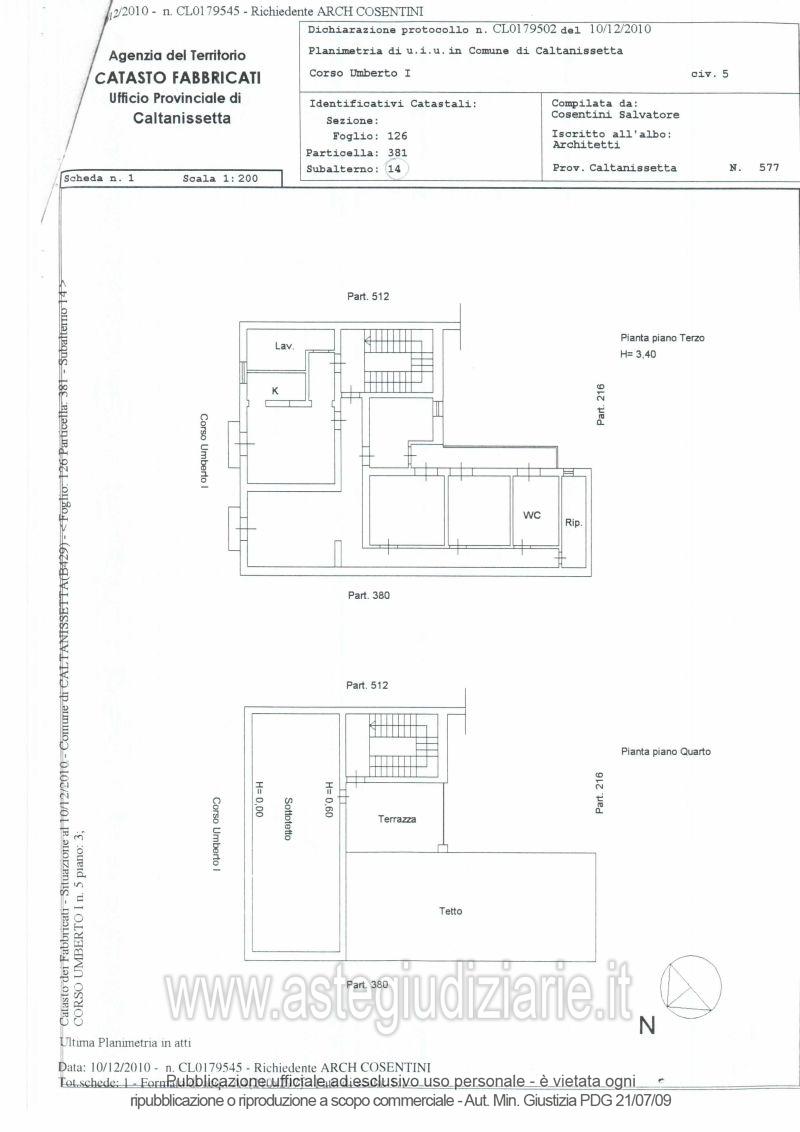 Immobile al terzo piano composto da: cucina, cucina-pranzo, lavanderia, soggiorno, due camere, una camera matrimoniale, bagno, ripostiglio, corridoio e tre balconi, nonché da una terrazza posta al piano soprastante (quarto piano) a cui si accede dal vano scala, da un sottotetto con accesso dalla predetta terrazza e da un'aerea adibita a tetto.