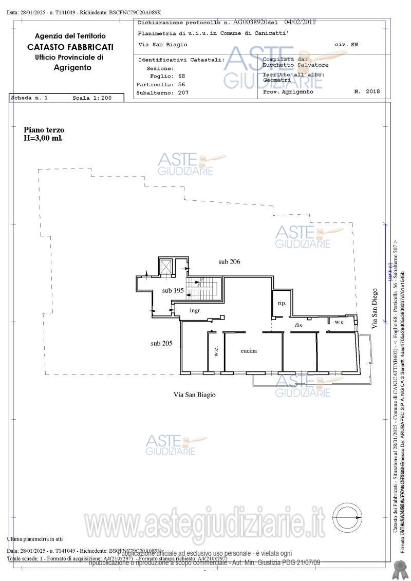 abitazione di tipo civile censita al Catasto Fabbricati del Comune di Canicattì, al foglio 68, particella 56, sub 207, categoria A/2, classe 3, vani 6,5, mq 150, sita al terzo piano del complesso edilizio ubicato al n. 10 di via San Biagio in Canicattì compresa la pertinenza costituita dal box auto posto al piano terra dello stesso edificio, unità immobiliare censita al Catasto Fabbricati del Comune di Canicattì al foglio 68, particella 56, sub 185, categoria C/6, classe 2, piano terra, mq 25