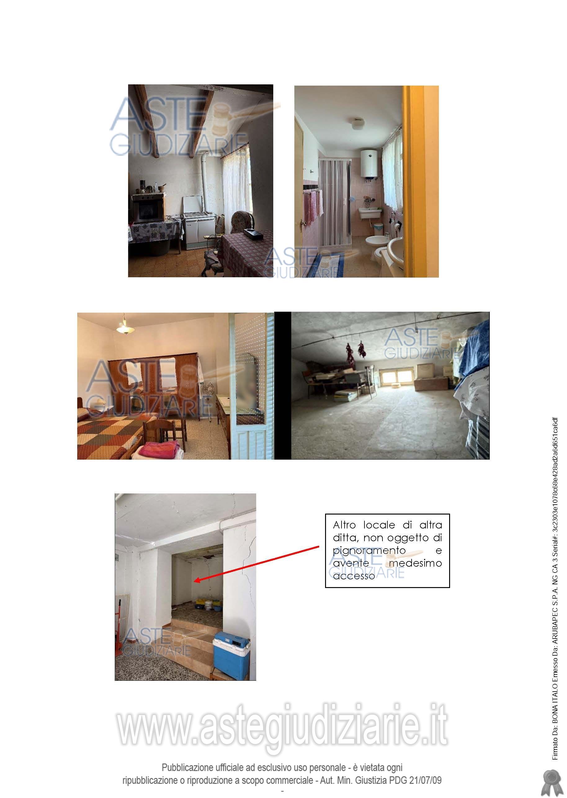 Proprietà 1/1 dell’esecutato di un immobile adibito ad abitazione della superficie commerciale totale di mq 165,00 circa lordo disposto in due livelli composto da un piano terra zona giorno con ingresso, soggiorno-cucina, locali cantina, W.C. mentre esternamente, alla sinistra dell’ingresso, è presente un ulteriore locale cantina; piano primo con due camere, un bagno e un ripostiglio, più soffitta. Con autorimessa e terreno circostante.