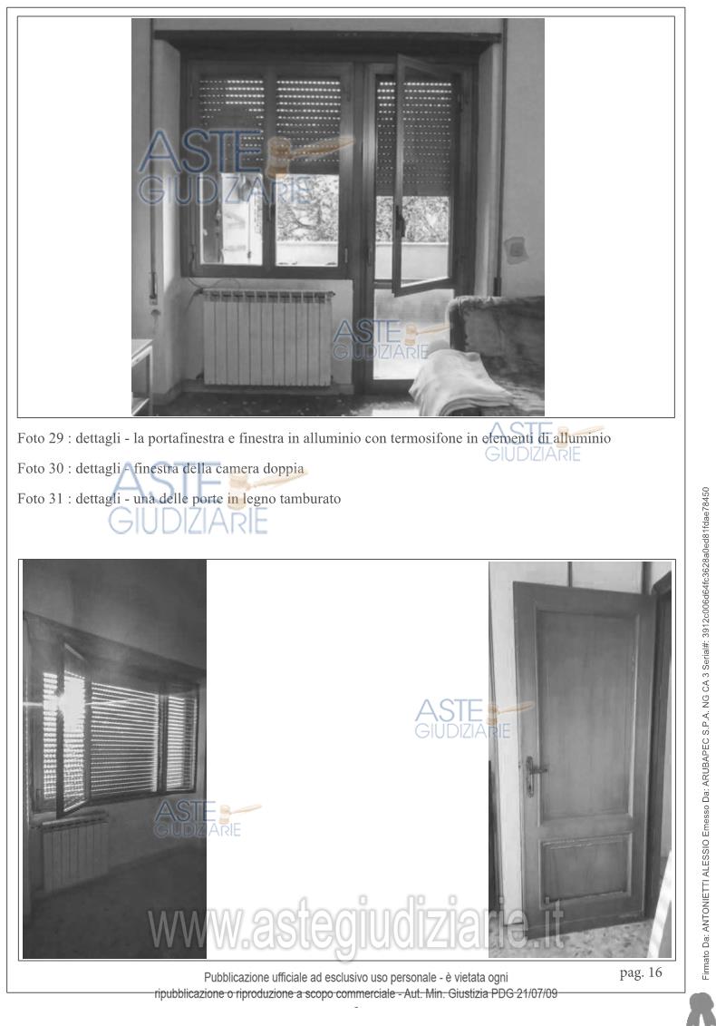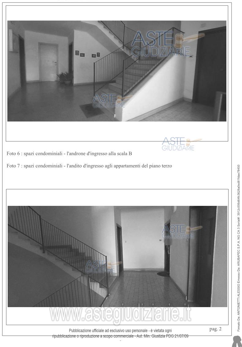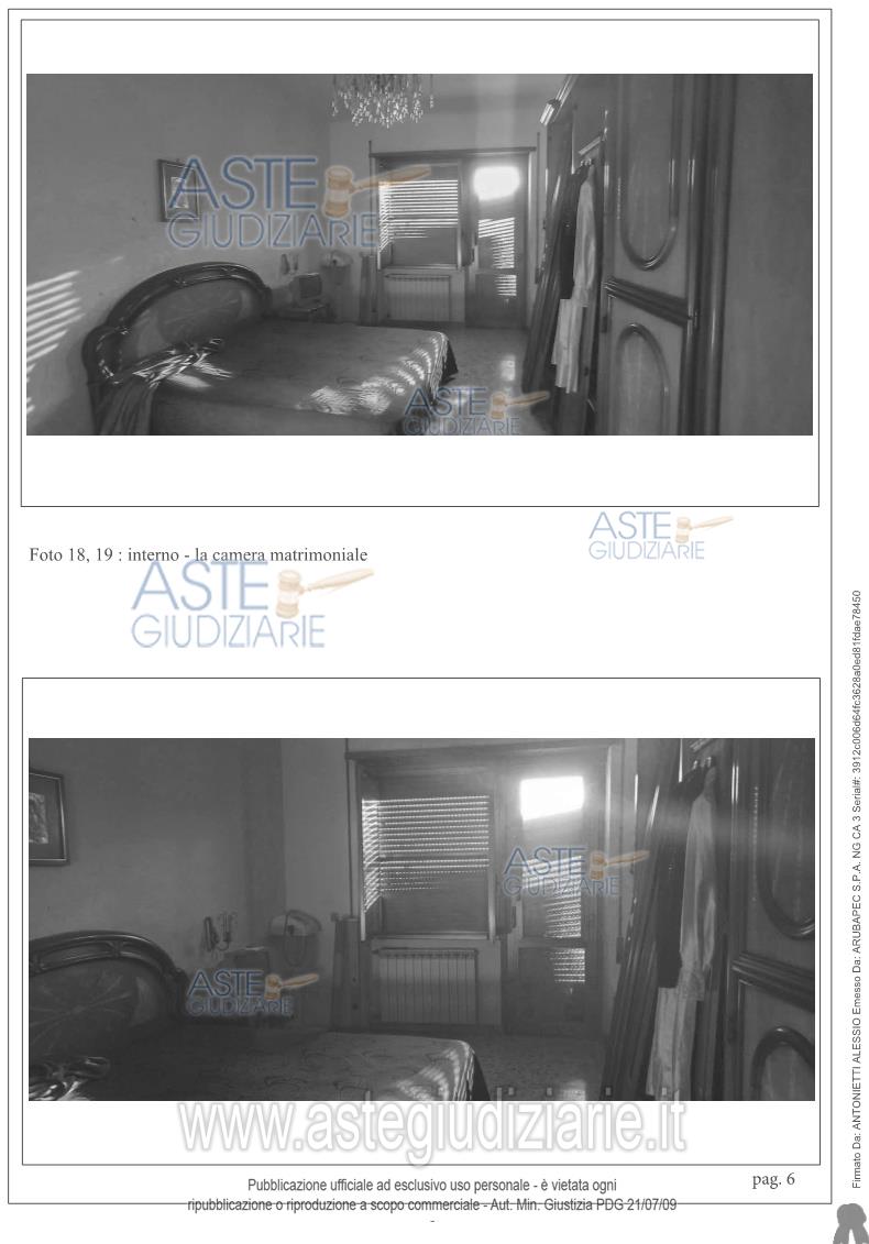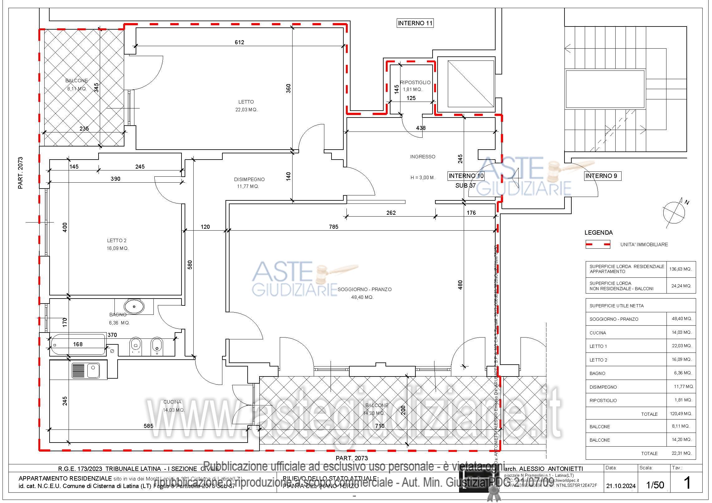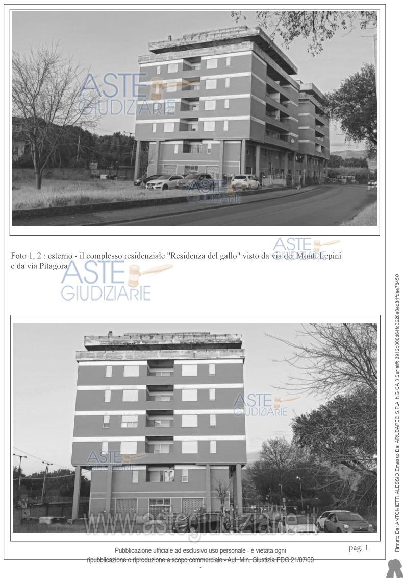 Appartamento a destinazione residenziale, facente parte del complesso immobiliare denominato “Residenza del Gallo” situato nella zona periferica del versante EST del Comune di Cisterna di Latina. L’ambito territoriale è urbanizzato ma non sono disponibili nel raggio di 500 m. i negozi e servizi di prima necessità (farmacia, poste, chiesa, alimentari, tabacchi, edicola, ecc…) che si trovano invece nei quartieri limitrofi “San Valentino” e proseguendo verso il centro urbano lungo la Via dei Monti Lepini ad una distanza di circa 800 m. - 1 km. La viabilità permette un agevole collegamento sia con il centro di Cisterna di Latina distante 1,5 km che l’immissione sulla strada statale S.S. n. 7 Appia in direzione Roma e Terracina. Si rileva nelle immediate vicinanze la presenza della fermata autobus del servizio di trasporto pubblico comunale ed il Parco denominato “Filetto”. L’accesso al complesso immobiliare di cui fa parte l’appartamento avviene dall’area cortilizia di distacco dalla strada via dei Monti Lepini. Sono disponibili nel cortile condominiale degli stalli di parcheggio non sufficienti a coprire il fabbisogno degli abitanti e pertanto attualmente sono utilizzati gli spazi di sosta lungo il tratto della limitrofa via Pitagora e l’area del terreno adiacente il fabbricato sul versante OVEST. L’appartamento collocato al piano terzo si sviluppa su un unico livello con una superficie lorda residenziale totale di circa 136,63 mq. ed una superficie lorda non residenziale dei n. 2 balconi di circa 24,24 mq. La distribuzione dei locali comprende un ampio soggiorno-pranzo con balcone di affaccio sulla via dei Monti Lepini, una cucina abitabile, disimpegno, bagno, la camera da letto matrimoniale con balcone affacciante sul versante SUD-OVEST, una camera da letto doppia ed un ripostiglio. La superficie utile netta dell’appartamento risulta di circa 120,49 mq. La superficie utile netta non residenziale dei balconi di circa 22,31 mq. L’esposizione dei locali è sul versante SUD-OVEST, SUD-EST. Le pavimentazioni dei locali di soggiorno, disimpegno e camere da letto sono in marmittoni di colore rosso e beige, mentre i rivestimenti e le pavimentazioni della cucina e bagno sono in ceramica in vari formati e colori con motivi ornamentali. Pareti e soffitti sono tinteggiati di bianco. Gli infissi esterni in alluminio a vetro singolo e tapparelle avvolgibili in pvc. Le porte interne sono realizzate in legno tamburato color noce. Relativamente all’impianto termico risulta che sia di tipo centralizzato con i radiatori di riscaldamento posizionati in tutti i locali abitativi. Per la produzione di acqua calda sanitaria è installato uno scaldabagno che risulta sia funzionante. Dalle informazioni ricevute dalla proprietaria durante il sopralluogo non risulta che sia stata redatta l’A.P.E., né il libretto d’impianto, né un valido rapporto di efficienza energetica dell’impianto termico. L’alimentazione del gas cucina avviene per mezzo di bombola gas posizionata all’interno della cucina. Sono inoltre presenti e funzionanti gli impianti: elettrico, idrico-sanitario, telefonico, antenna TV e citofonico. L’ingresso all’androne della scala condominiale del fabbricato avviene per mezzo di una rampa di scale esterna. Gli ambiti di ingresso, i corridoi e pianerottoli della scala sono ampi e luminosi, ed è fornito di ascensore.