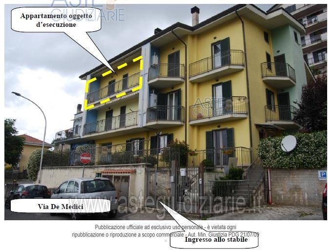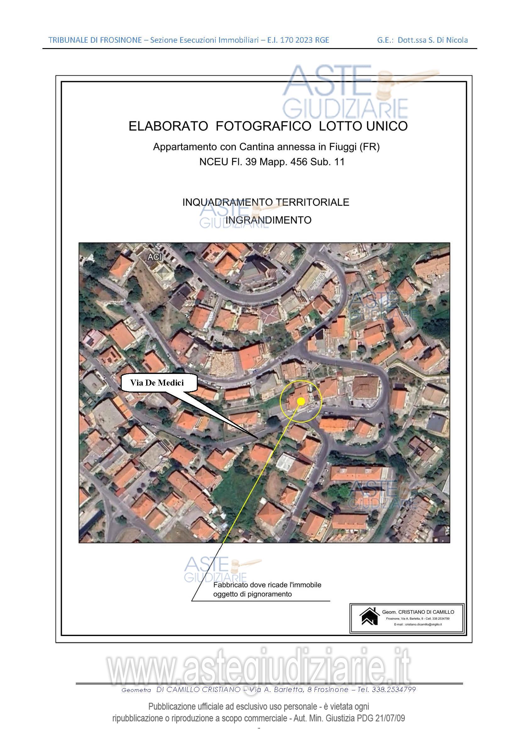 Appartamento ubicato a Fiuggi (FR) - Via De Medici, 35, interno 4, piano 2, condominio "Valle Viva", composto da cucina, soggiorno, camera da letto, studio/camera da letto, disimpegno, bagno, balcone, ripostiglio esterno , cantina. L'abitazione ha una superficie utile di circa mq. 53,40, oltre a mq. 12,30 di balcone.