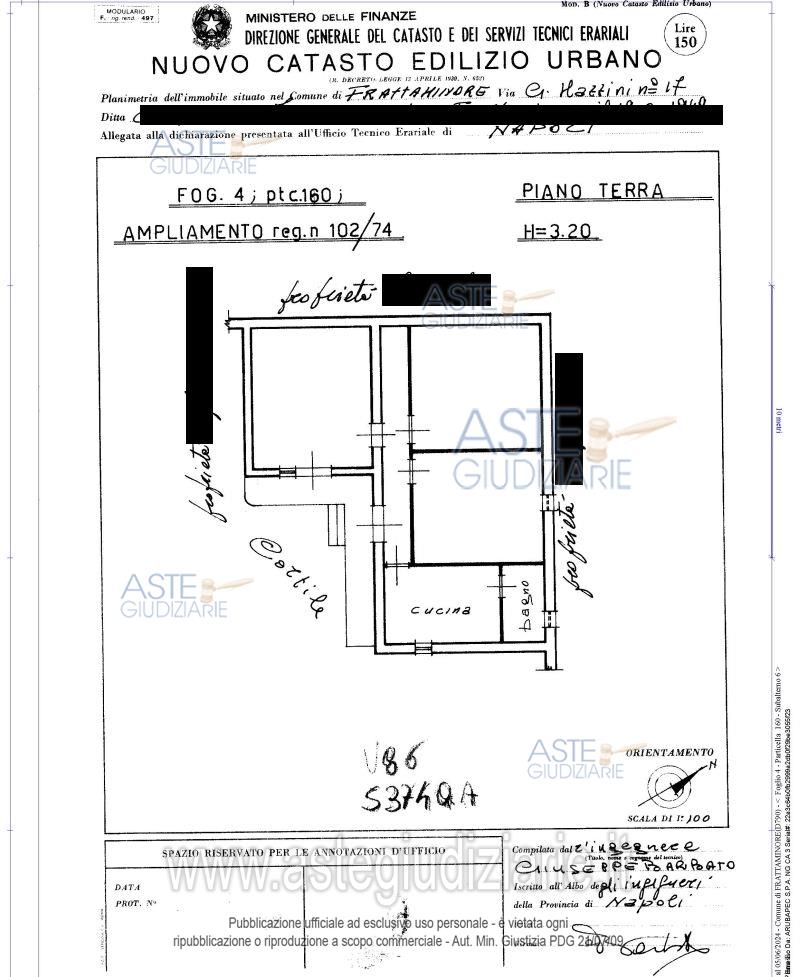 Piena ed intera proprietà di un’abitazione al piano terra di un fabbricato ubicato nel Comune di Frattaminore, via Mazzini n.26 (ex 17). L’appartamento è composto da sala pranzo con angolo cottura, cucina, tre bagni, disimpegno, due camere, ballatoio. È distinto al N.C.E.U. al Foglio 4 Particella 160 Subalterno 6 cat. A/4, consistenza 4,5 vani.