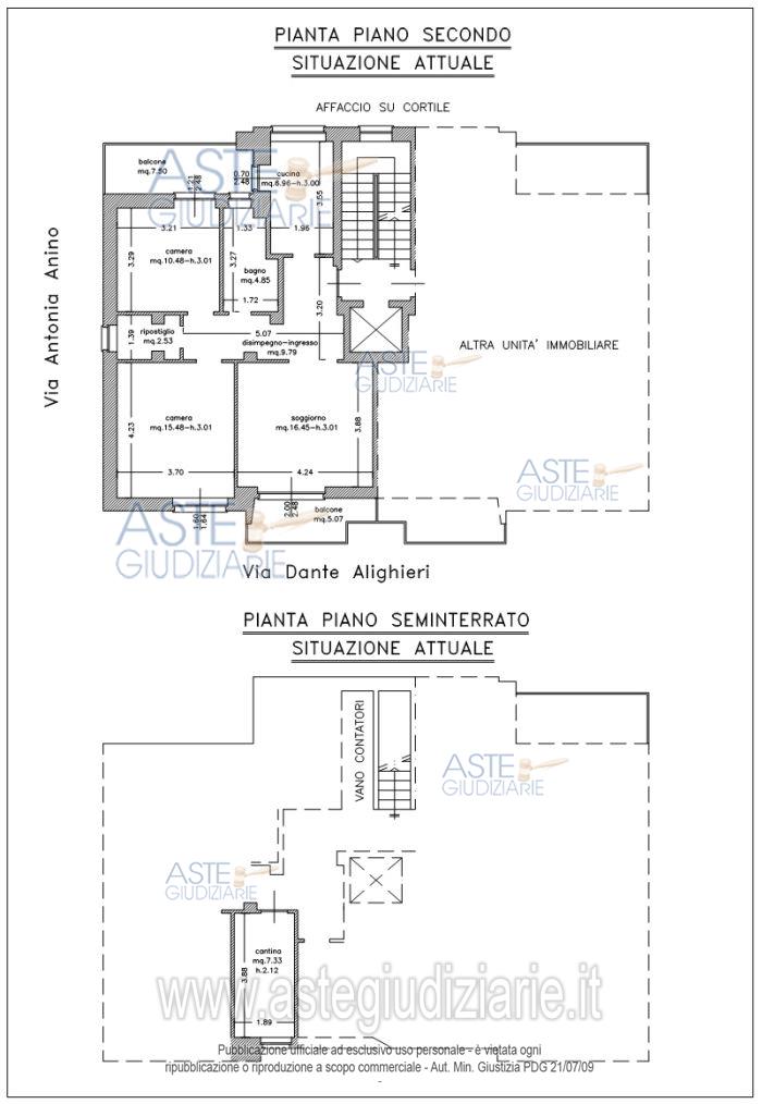 Bene 1:Appartamento si colloca al piano secondo costituito da ingresso-disimpegno, bagno, ripostiglio, due camere, soggiorno e cucina Via Dante Alighieri 42. Bene 2: garage Via Antonia Anino 21 e cantina.