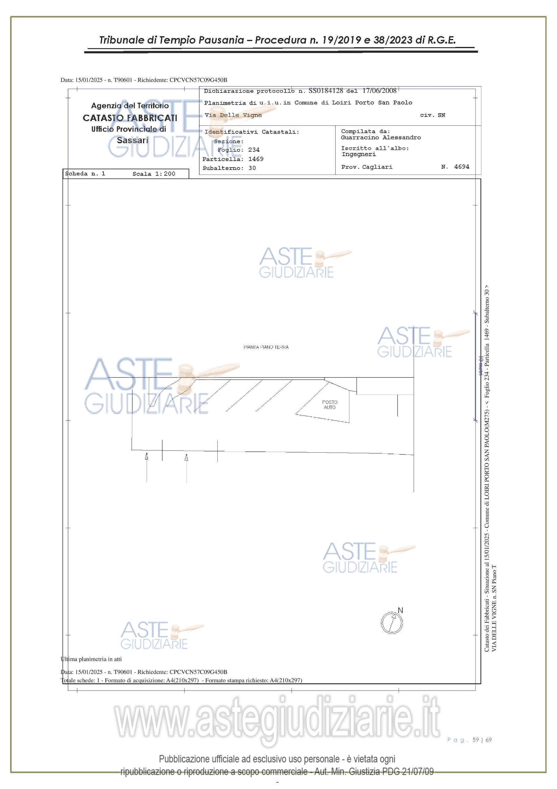 appartamento, in Via delle Vigne snc, Comune di Loiri Porto San Paolo (SS), nel complesso denominato “Residenza LaPiscina, piano primo, composto da ingressopranzo-cucina confinante con disimpegno, due camere da letto ed al bagno;al N.C.E.U. al foglio 234, mappale 1469, sub 35, Cat. A/2, superficie catastale mq 64, escluse aree scopertemq. 59 e altezza di mt 2.70, nonché posto auto coperto composto da un singolo locale