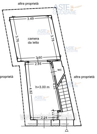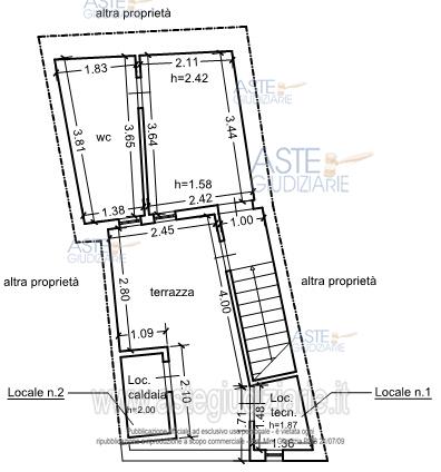 Immobile su tre piani. PT: stanza con affaccio sulla via, camera da letto e wc; P1: camera con affaccio sulla via e stanza da pranzo. P2: disimpegno e wc. Terrazza con accesso da pianerottolo scala con locale caldaia e altro vano tecnico. Pavimenti in scaglie di marmo, WC PT con pareti rivestite in legno, WC P2 pareti con piastrelle di ceramica. Stanze intonacate. Infissi in legno. Struttura in muratura con solai in latero-cemento intonacato. No impianto di riscaldamento. Superficie commerciale 124 mq