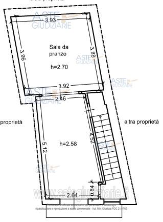 Immobile sito a Mineo in via Sotto Blangiardi n. 12-14. L’abitazione si sviluppa su tre piani (piano terra, piano primo, piano secondo). Ad essa si accede tramite un ingresso posto al piano terra di via Sotto Blangiardi n. 12. La casa presenta al piano terra tre stanze: una stanza con affaccio su via Sotto Blangiardi, una camera da letto e un wc. Al piano primo sono presenti due stanze: una camera con affaccio su via Sotto Blangiardi e una stanza da pranzo. Al piano secondo sono presenti due stanze: un disimpegno e un wc. Dal pianerottolo del corpo scala si accede alla terrazza prospiciente la pubblica via, sulla quale sono presenti due volumi tecnici: uno con funzione di locale caldaia e uno come vano tecnico accessorio allegato 6-planimetrie dello stato di fatto). I pavimenti sono in scaglie di marmo, il WC del piano terra ha le pareti rivestite in legno mentre quello del piano secondo ha le pareti in parte rivestite con piastrelle di ceramica. Le pareti delle altre stanze sono intonacate. Gli infissi di balconi e finestre sono in legno. La struttura è in muratura portante con solai in latero-cemento intonacato. Non esiste un impianto di riscaldamento. La superficie utile interna calpestabile è pari a 77 mq, mentre la superficie totale delle terrazze e balconi è pari a 14,30 mq, la superficie commerciale pari a 124 mq.