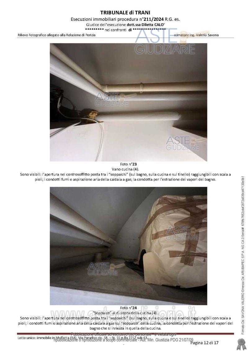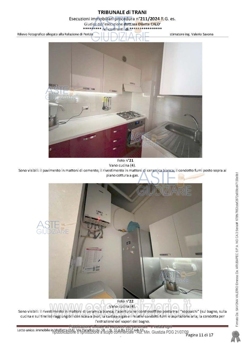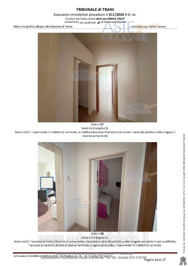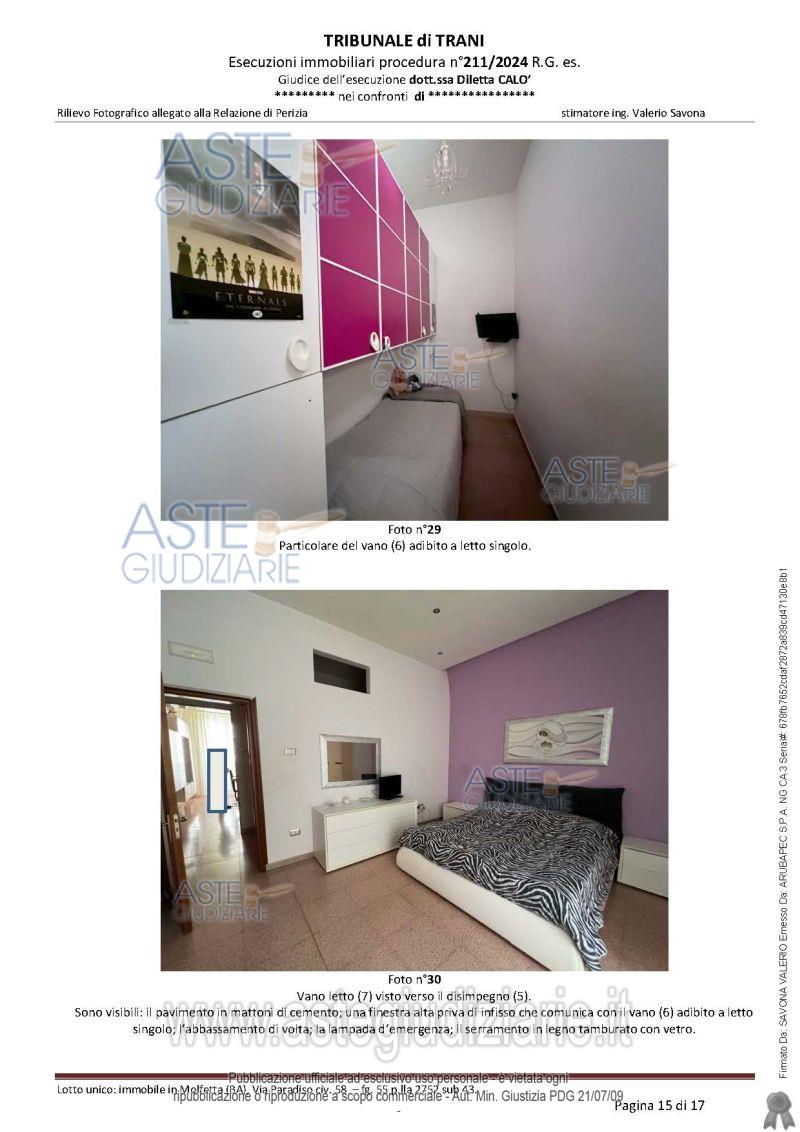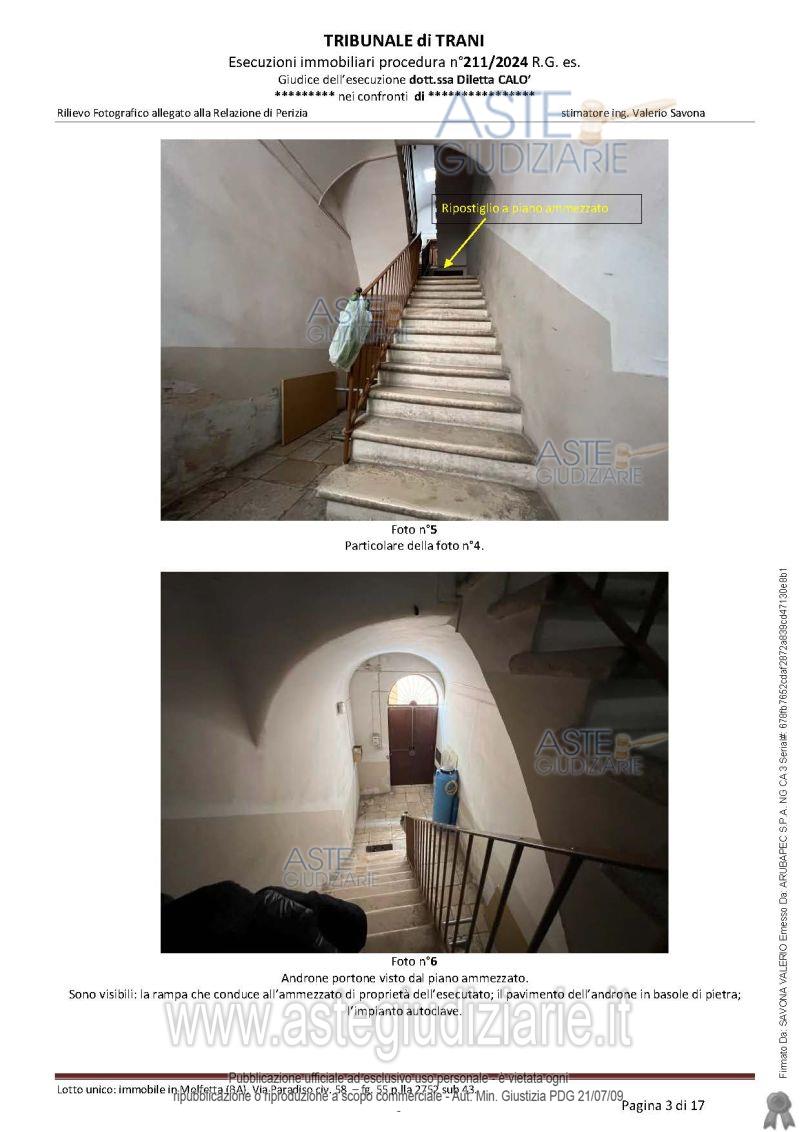 Piena proprietà per 1000/1000 dell’appartamento sito al primo piano di una palazzina di due piani ubicata in Molfetta alla via Paradiso n.58, angolo Via d’Azeglio (zona semicentrale, compresa tra la ferrovia ed il mare) costituito da ingresso, tinello, cucinino, disimpegno, vano utilizzato come camera da letto singolo, camera da letto matrimoniale e servizio igienico, della superficie catastale di mq. 60 (superficie convenzionale 67,98 mq), confinante a nord con il vano scala, ad est con Via Paradiso, a sud con eredi xxx, e ad ovest con atrio interno, salvo altri. Costituisce pertinenza dell’appartamento un ripostiglio posto nel vano scala, a piano ammezzato, antistante il primo pianerottolo che si incontra per chi sale le scale dall’androne.