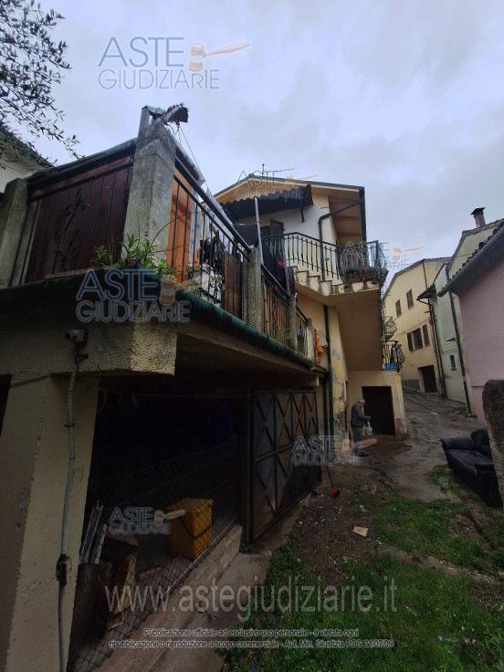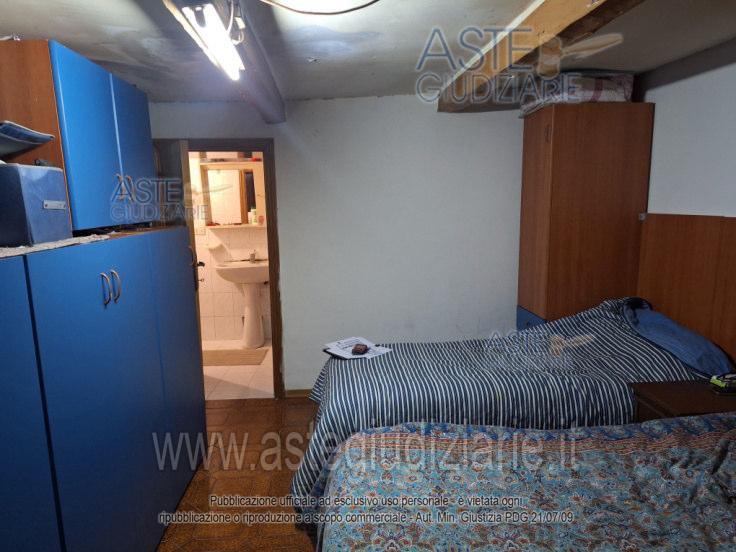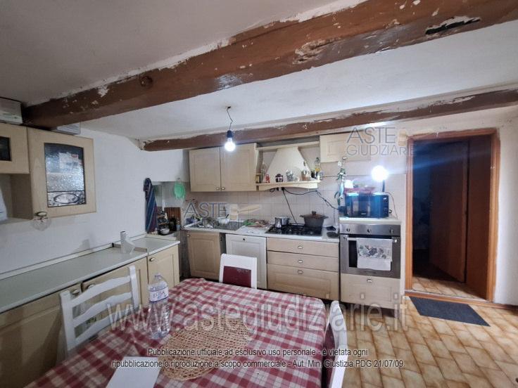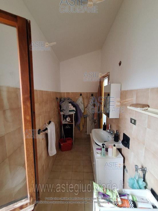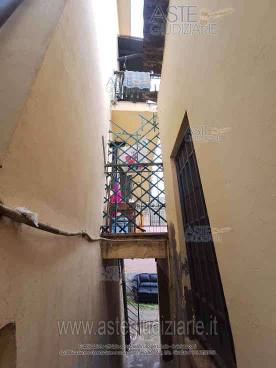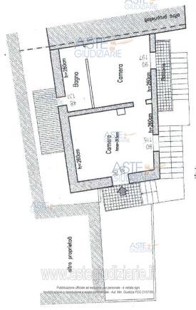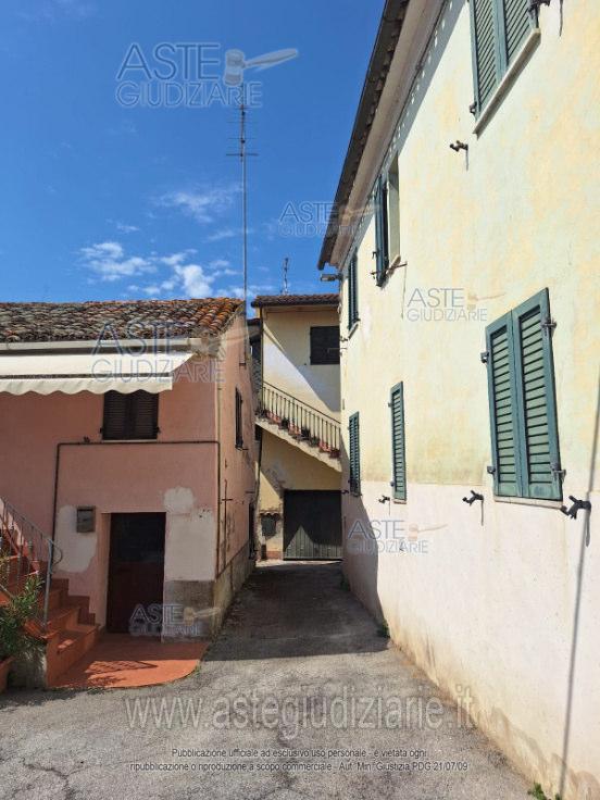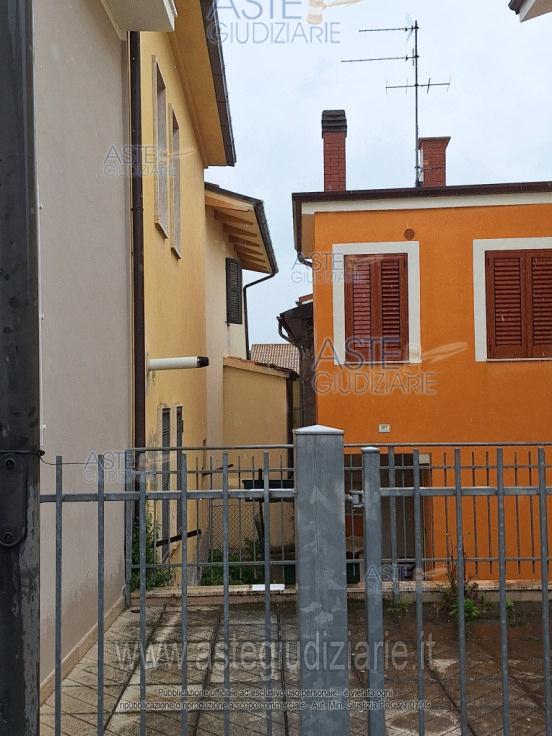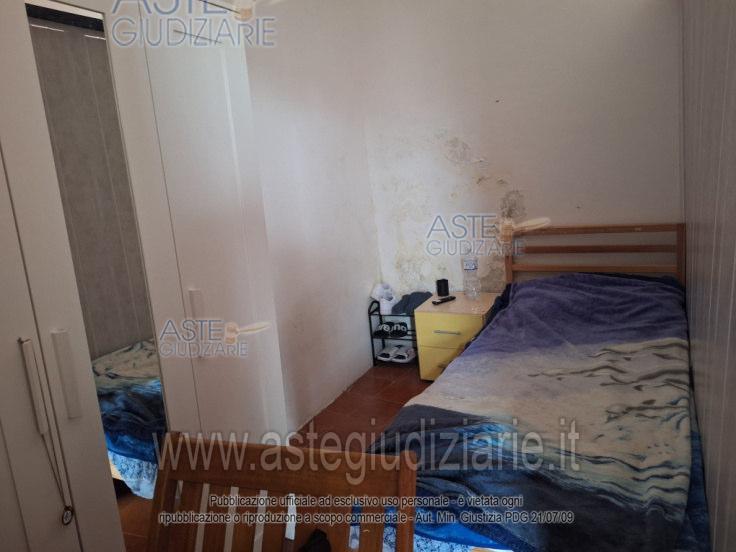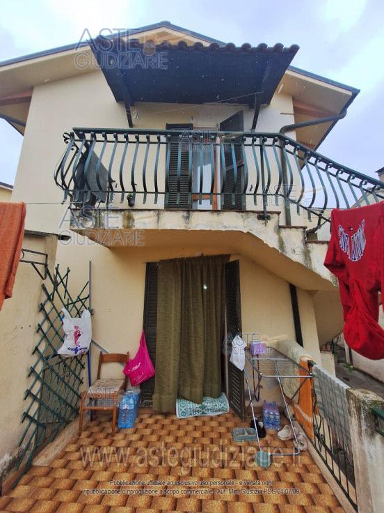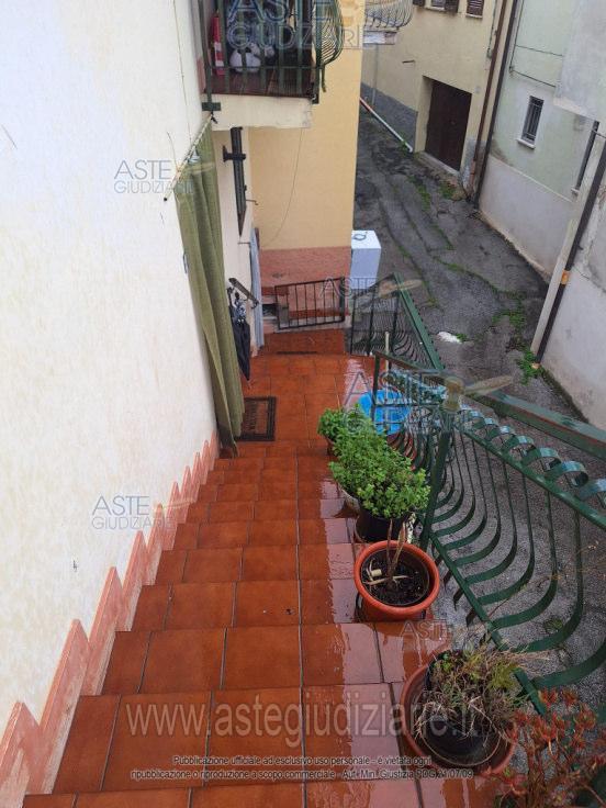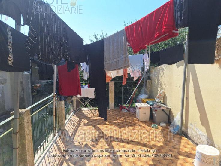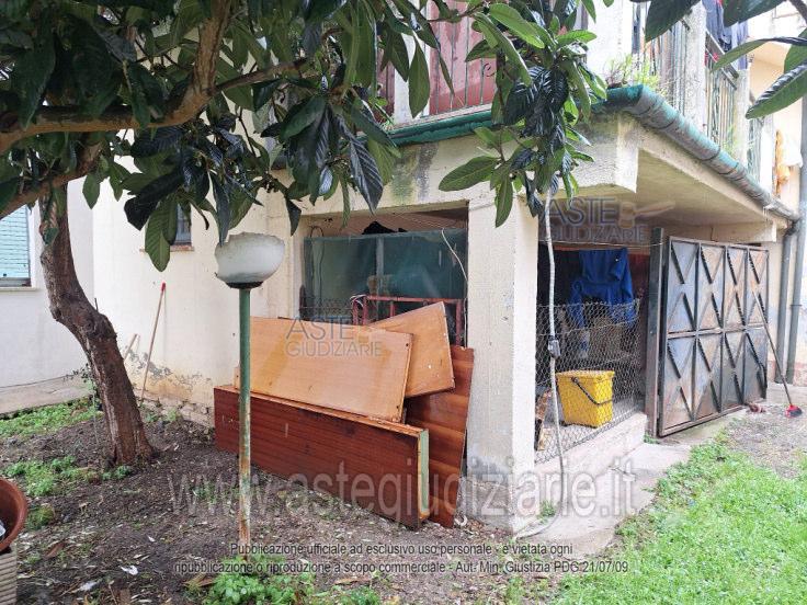 Unità abitativa compresa tra cielo e terra, con l’abitazione che si articola tra il piano primo esecondo con due locali sgombero al piano terra, sempre al piano terra è presente un portico con soprastante terrazzo a livello ad uso del piano primo e corte esclusiva; una scala esterna, aperta sui lati senza copertura e protezione da pioggia e altri agenti atmosferici, collega il piano terra, il primo e il secondo.L’abitazione è formata al primo piano da un vano cucina/pranzo dal quale, attraverso una porta finestra, si accede al terrazzo (di circa 17 mq.) e da una camera da letto con bagno; al piano superiore si trovano due camere, un bagno e un balcone.Al piano terra vi sono due locali sgombero non comunicanti tra loro, il primo con accesso da porta posta all’inizio della scala esterna, l’altro è accessibile attraverso una serranda in lamiera verniciata basculante.L’unità abitativa non è dotata di posto auto.