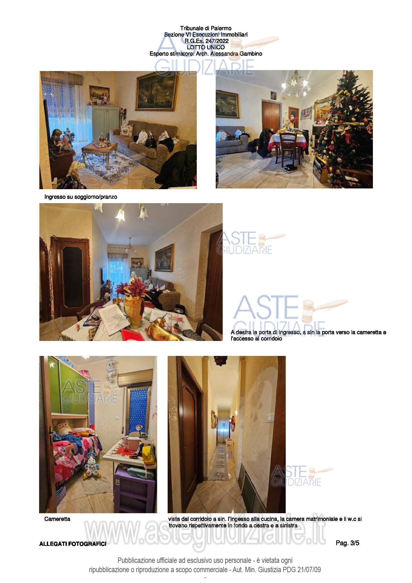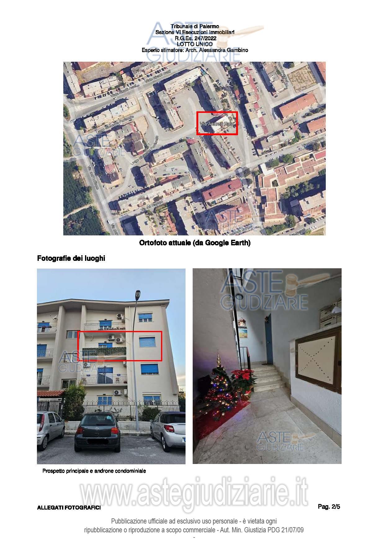 piena proprietà di immobile per civile abitazione (appartamento) ubicato in Palermo, via Andrea Raia n. 5, piano secondo, scala A, int. 6, senza ascensore. Composto da 4,5 vani catastali per una superficie commerciale pari a mq 89,07, composto da salone/pranzo, cucina abitabile con verandina annessa, una camera matrimoniale, una cameretta, un w.c. con doccia e ripostiglio. Censito al C.F. del Comune di Palermo al fg. 83, p.lla 1026, sub 6, vani 4,5, cat. A3, superficie catastale mq.89 Rendita di Euro 255,65