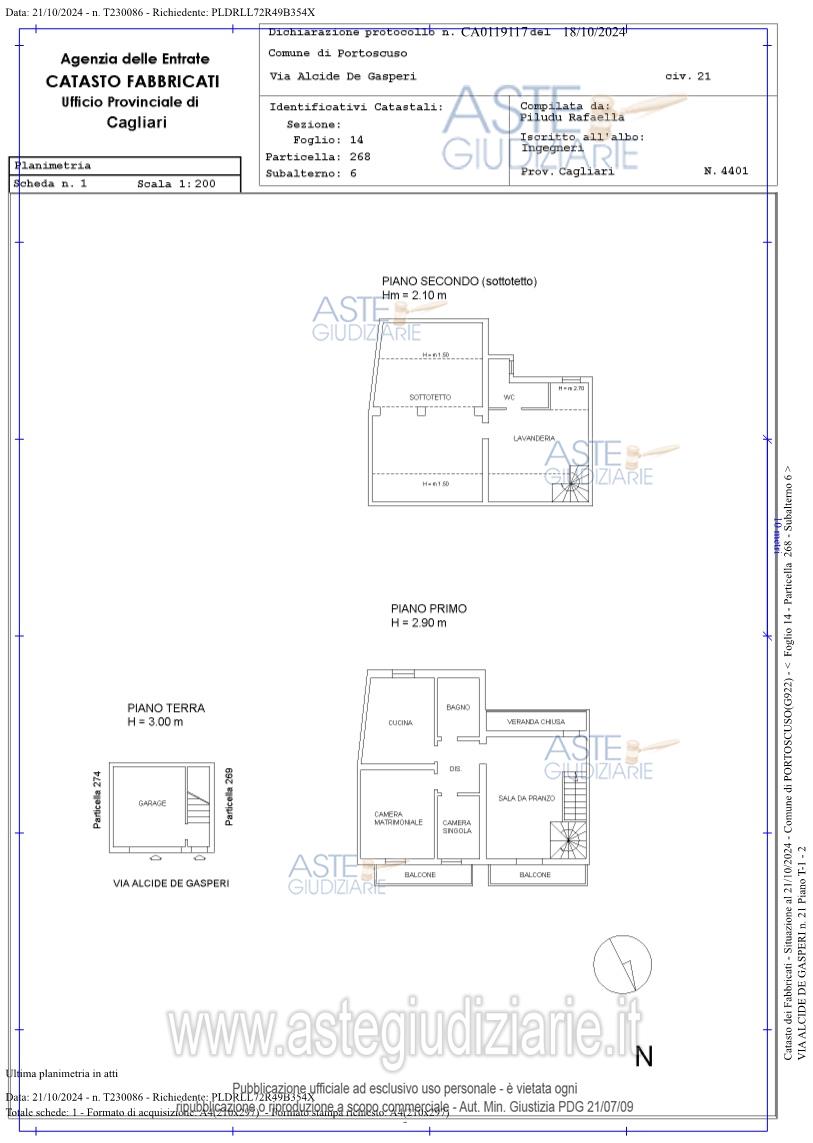 Unità indipendente ad uso civile abitazione su tre piani, sita in Comune di Portoscuso (SU), Via Alcide de Gasperi n. 21, composta al piano terra da garage e scala di accesso ai successivi piani, al piano primo da salone, bagno, disimpegno, ripostiglio, due camere da letto con due balconate ed al piano secondo da zona lavanderia e stenditoio.