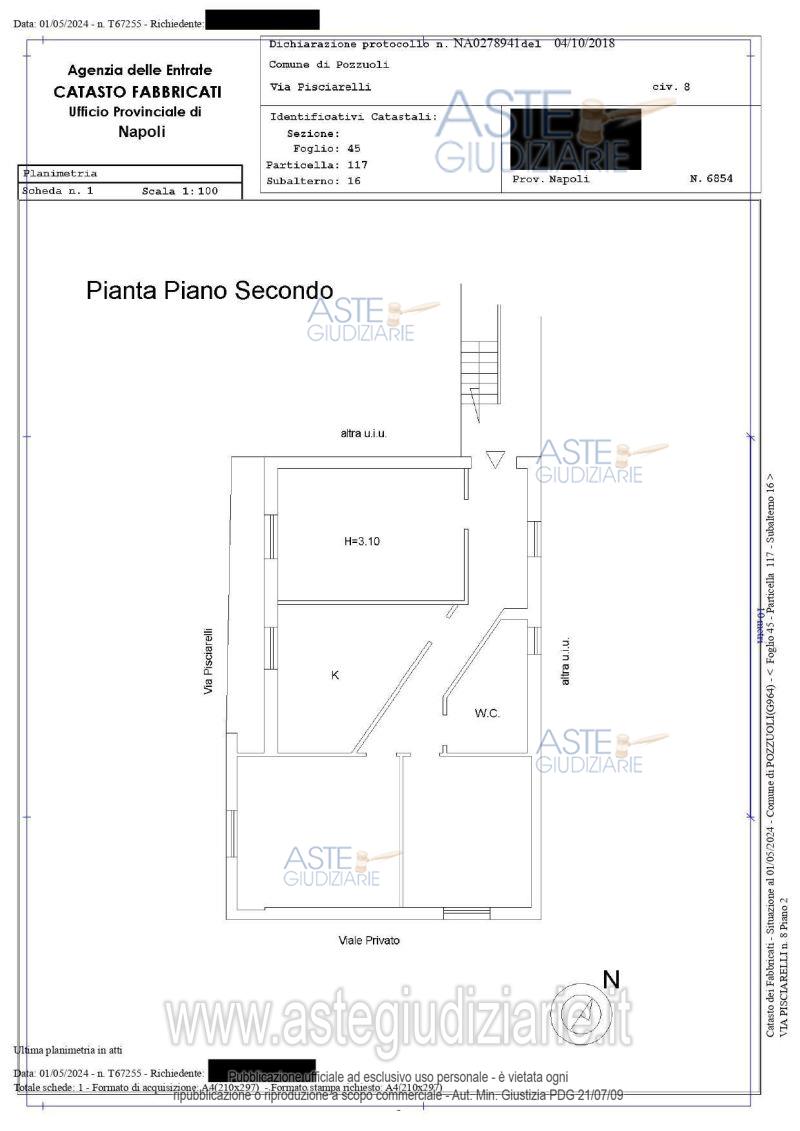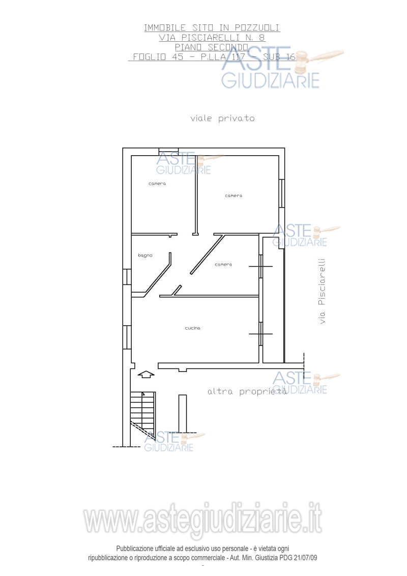 Piena ed intera proprietà di appartamento sito in Pozzuoli (NA) alla Via Pisciarelli n.8/A, piano secondo, composto da cucina, corridoio, bagno e tre camere, con soprastante lastrico solare di copertura.