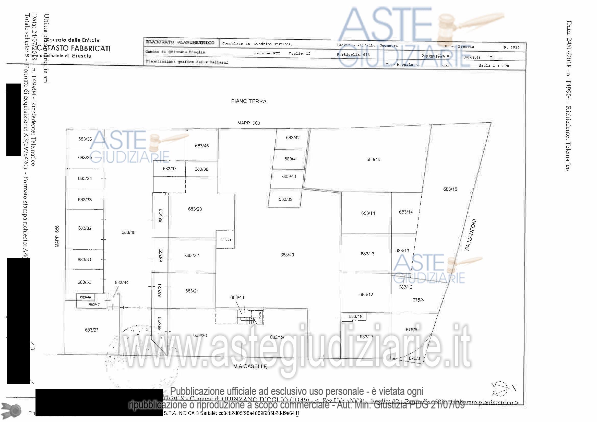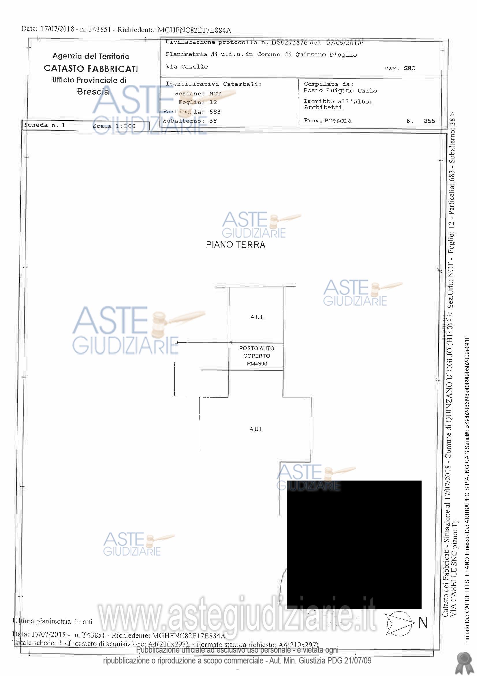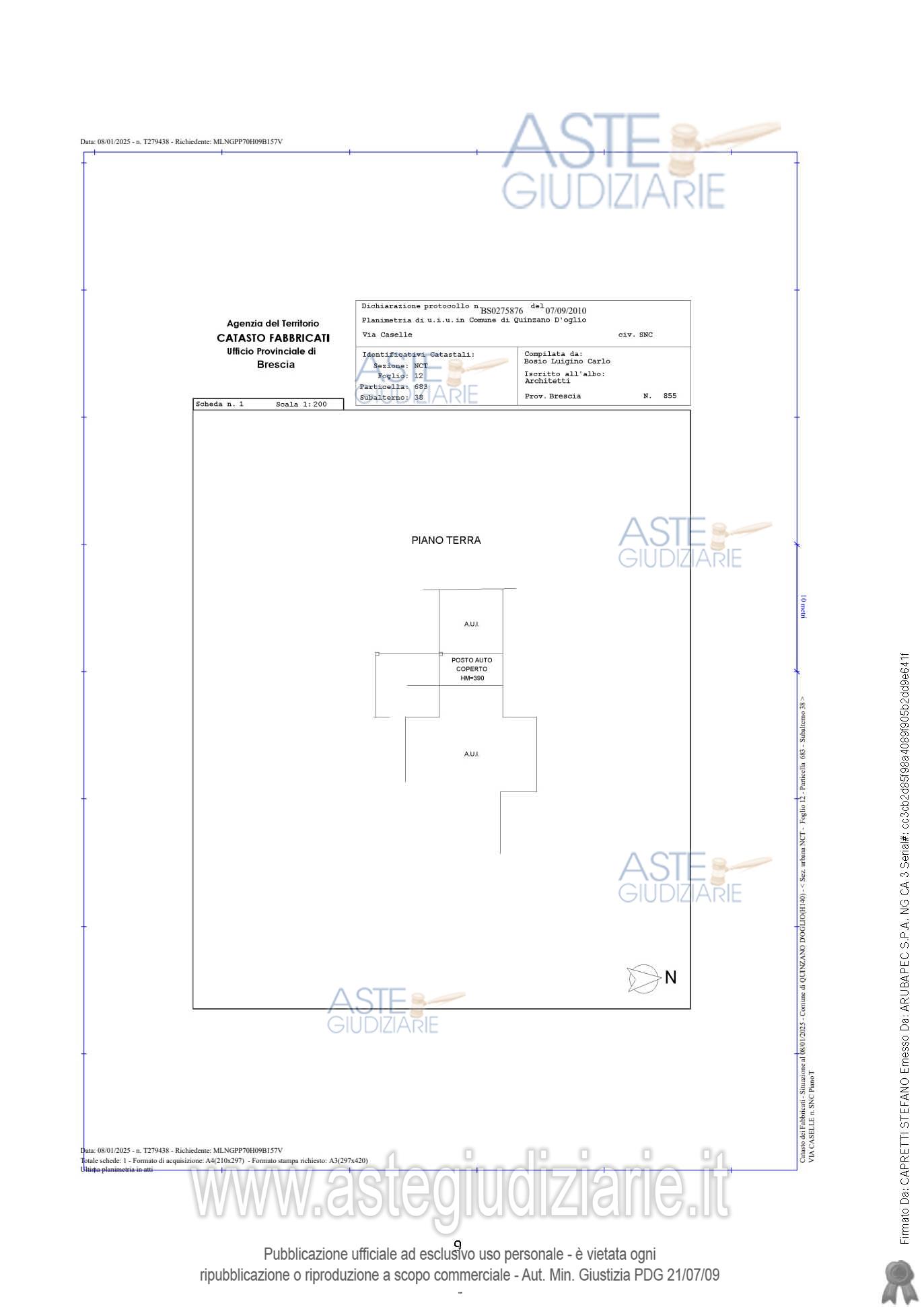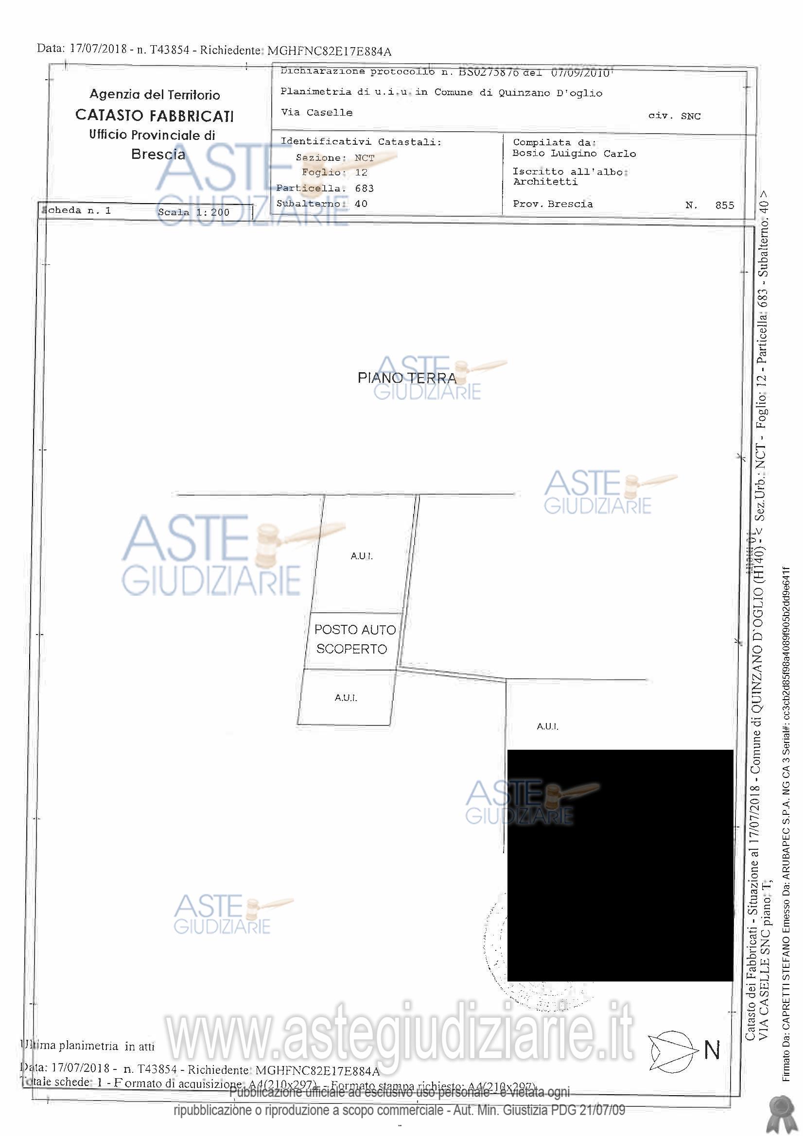 piena proprietà Appartamento al primo piano con posto auto scoperto e posto auto coperto il tutto censito al Catasto Fabbricati di detto Comune, Sez. NCT Fg. 12 mapp. 683 sub 48 – P. T-1 - cat. A/2 - cl. 4 – 3 vani - R.C. Euro 178,18 mapp. 683 sub 38 – P. T - cat. C/6 - cl. 2 – 13 mq - R.C. Euro 15,44 mapp. 683 sub 40 – P. T - cat. C/6 - cl. 1 – 15 mq - R.C. Euro 14,72 Oltre alle proporzionali quote sulle parti comuni dell’edificio