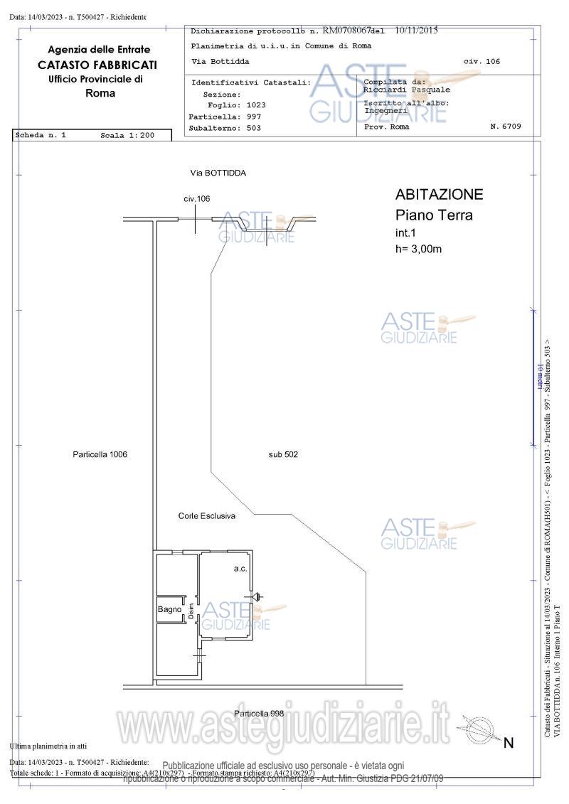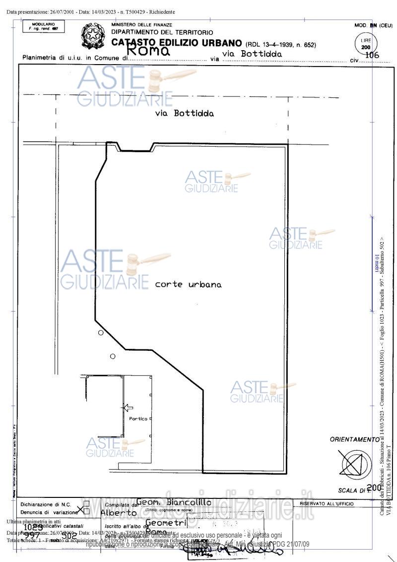 Quota pari a 1/1 del diritto di piena proprietà sulle seguenti porzioni immobiliari site in Roma (RM) in Via Bottidda n°106 e precisamente: -Abitazione in villino, sita al piano terra, distinta con l’interno 1, composta da soggiorno-pranzo con angolo cottura, due camere, disimpegno, bagno e corte esclusiva della superficie di mq. 260 (duecentosessanta) circa nell’insieme a confine con Via Bottidda, particella 1006, particella 998, salvo altri.Detta porzione immobiliare è censita al catasto dei fabbricati del comune di Roma al foglio 1023, particella 997, sub. 503, z.c. 6, cat. A/7, cl.4, vani4, superficie catastale mq. 58, Via Bottidda n° 106, P. T, int. 1, rendita catastale euro 599,09 -Ente urbano di mq. 740 (settecentoquaranta) circa a confine con Via Bottidda, il villino sub. 503, particella 998, salvo altri. Detta porzione immobiliare è censita al catasto dei fabbricati del comune di Roma al foglio 1023, particella 997, sub. 502, cat. F1, senza rendita. L'immobile è stato edificato senza titolo edilizio, poi condonato con concessione edilizia in sanatoria n° 9912 del 24/10/1996, relativa alla domanda di condono n.0048070 del 22/03/1986. Il villino presenta alcune difformità rispetto alla planimetria allegata alla domanda di condono del 1986. In particolare, sono stati modificati i prospetti e la distribuzione degli spazi interni, ed è stata realizzata una tettoia sul prospetto Sud Ovest. Per regolarizzare le difformità sopra elencate, sarà necessario presentare una pratica SCIA in sanatoria per opere eseguite senza titolo.L'area Urbana risulta in parte ingombra da manufatti ad uso magazzino, realizzati senza titolo edilizio. Si stima in € 8.000,00 il costo per il rispristino dell'area, la demolizione dei manufatti e il trasporto alla discarica autorizzata dei materiali di risulta.Certificato di agibilità non rilasciato Formalità pregiudizievoli: pignoramento trascritto a Roma 1 in data 16/02/2015 al n°10858 di formalità. Si tratta di pignoramento relativo ad una procedura estinta che non potrà essere cancellato a cura del G.E. con il decreto di trasferimento. La cancellazione dovrà essere curata a cura e spese dell’aggiudicatario. Stato di occupazione: L’immobile è occupato dai debitori esecutati e potrà essere liberato all’emissione del decreto di trasferimento.Il tutto come meglio descritto nell’elaborato peritale depositato in atti.