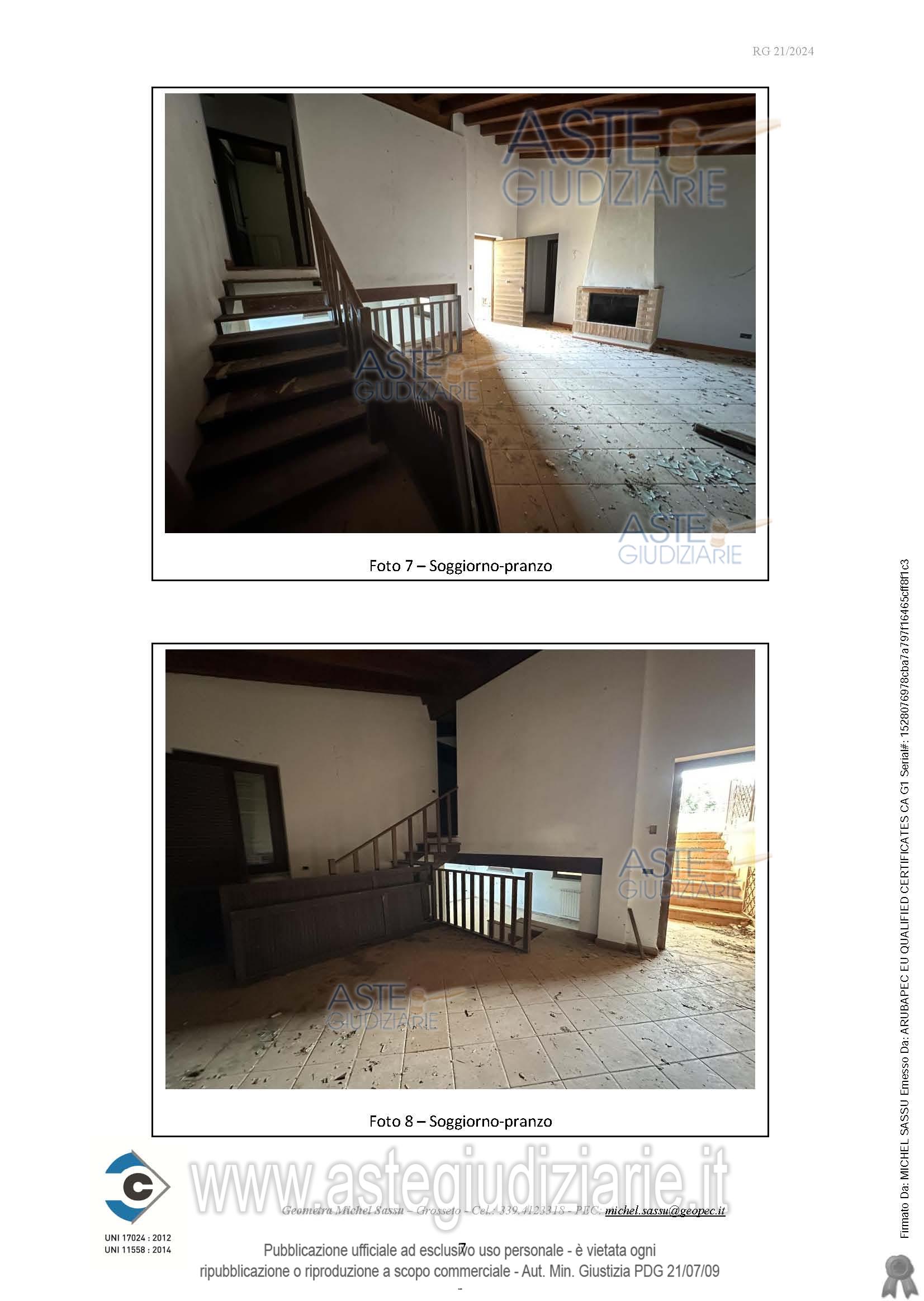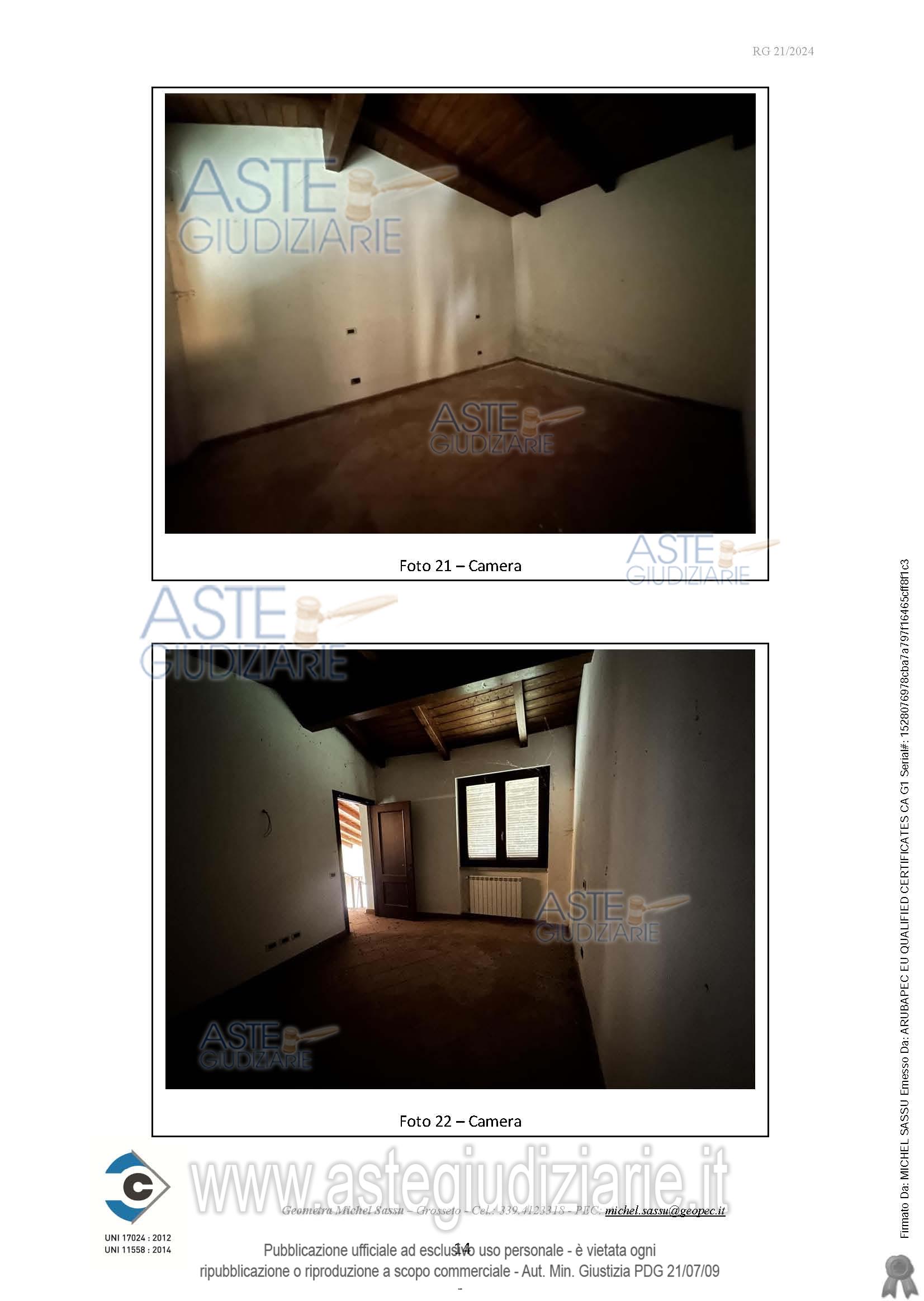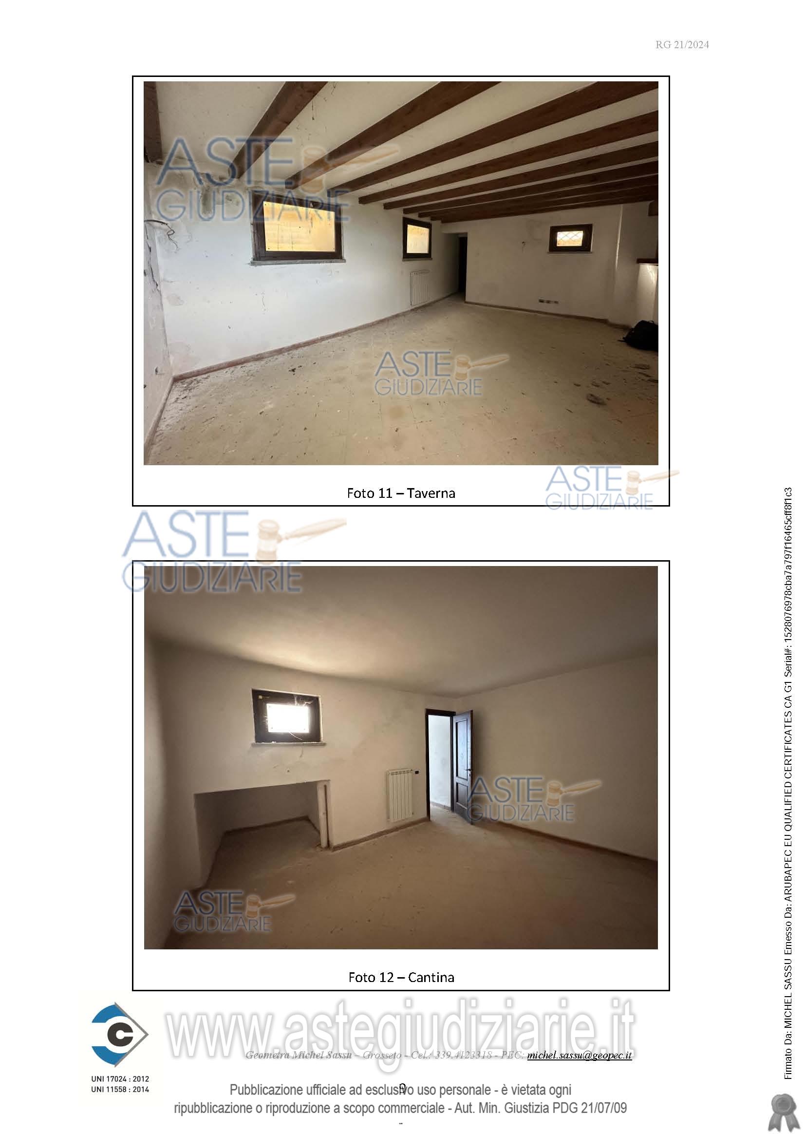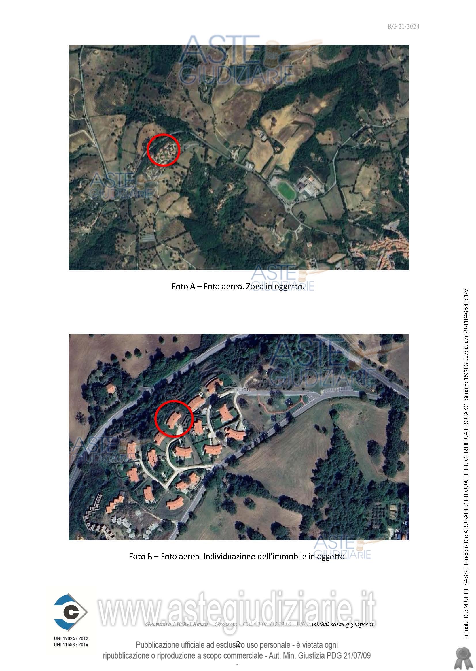 Quota pari a 1/1 della piena proprietà di appartamento con destinazione turistico-ricettiva (CAV), sito in Località Le Valentine n. 37 in Scansano (GR), piano seminterrato, terra e primo, composto da pranzo-soggiorno, camera e un bagno al piano terra, due camere e un bagno al piano primo e una taverna, una cantina e un bagno al piano seminterrato, oltre a un portico al piano terra, di superficie lorda pari a 134,73 mq di abitazione e 13,90 mq di portico, oltre a una corte esclusiva di 2.060,00 mq.Identificato al Catasto Fabbricati del Comune di Scansano al Foglio 189, Particella 412, Subalterno 2.Confina con Particella 412 Subalterno 1, Particella 413 e Particella 424, salvo altri. Costruito in virtù di: Concessione Edilizia n.22 del 17/06/2004.Si accerta che l’immobile è stato completato nelle strutture e nel rustico, così come nelle finiture interne e negli impianti, mancando solamente la caldaia ad il relativo allaccio all’approvvigionamento energetico.Non risulta essere stata depositata la Fine Lavori e non risulta essere presente l’Attestazione di Agibilità.Non risultano essere presenti certificazioni di conformità degli impianti.L’immobile è stato realizzato tramite un Piano di Lottizzazione in zona territoriale omogenea “Zona Turistico Ricettiva”, sottozona “T1”, di cui all’art. 28 delle N.T.A. allegate al P.R.G. del Comune di Scansano.N.B.: È stato stretto accordo tra il Condominio e il Comune di Scansano per cui c’è la possibilità della redazione del Piano Attuativo in variante al Piano Operativo Comunale per l’ottenimento del cambio di destinazione d’uso degli immobili facenti parte il condominio (Allegato A05).Formalità pregiudizievoli: nessunaStato di occupazione: libero.Descrizione dell’immobile dato in pignoramento:L’immobile oggetto di stima è un appartamento accessibile tramite una scala esterna che conduce al piano intermedio e posto a mezzacosta, sotto il piano di campagna principale, costituito da un pranzo-soggiorno, una camera e un bagno posti al piano terra, due camere e un bagno al piano superiore e una taverna, una cantina e un bagno al piano seminterrato, oltre ad un portico al piano strada ed una corte esclusiva sul retro.Il soggiorno non presenta impianti predisposti per un angolo cottura, che però si trovano nella taverna al seminterrato.L’immobile è dotato di corte esclusiva pianeggiante nella zona circostante il fabbricato e scoscesa nella parte frontale.All’appartamento è stata attribuita classe energetica “G”.Il tutto come meglio descritto nell’elaborato peritale depositato in atti.