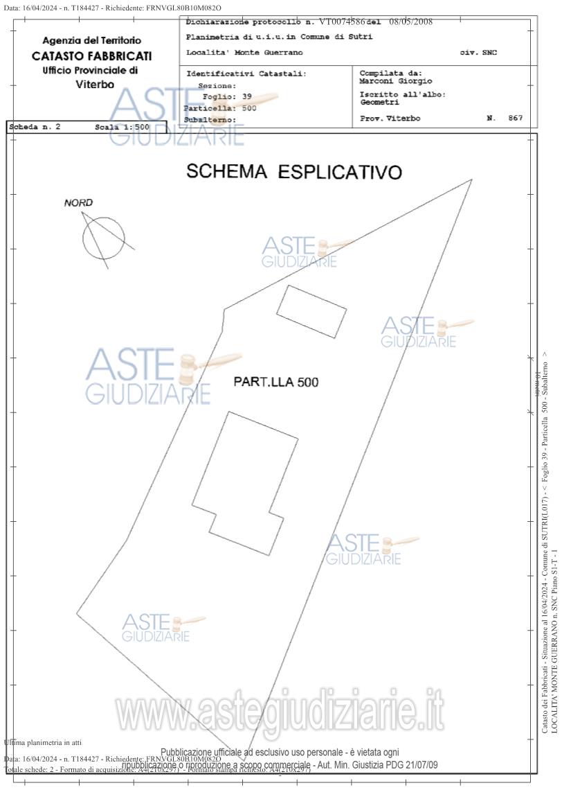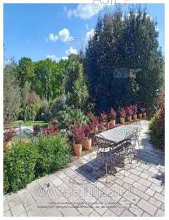 Nel Comune di Sutri (VT), Loc. Monte Guerrano , Via Dei Boschi diritto di piena proprietà sul compendio pignorato costituito da unità immobiliare destinata a villa su tre piani (piano seminterrato, piano terra e piano primo) con piscina e corte urbana circostante di pertinenza; completano il lotto altri terreni agricoli adiacenti e pertinenziali alla villa suddetta. Quest’ultima si presenta generalmente in buone condizioni seppur necessitano degli interventi di manutenzione ordinaria nella facciata e nelle persiane delle finestre e porte finestre ed ha una superficie di circa 600 mq che comprende un ampio garage al piano seminterrato con svariati locali tecnici servizi igienici e locali di servizio. Una scala interna collega al piano terra e al pia-no primo. Nel piano terra è presente un grande disimpegno su cui si accede ad una zona giorno caratterizzata da una veranda, un ampio salone/ biblioteca, un’ ampia cucina e un vano destinato a studio e ad una zona notte caratterizzata da due ampie camere da letto e un bagno. Il piano primo è caratterizzato da un ampio disimpegno su cui è presente l’accesso ad un ampia camera da letto/ studio e ad un ampio bagno. La villa,come già sopra specificato, è servita da una corte circostante di mq 3175 circa destinata a parco, su cui al proprio interno è presente una piscina di forma rettangolare. Infine la proprietà oggetto di trasferimento e costituente il presente lotto unico è caratterizzata da alcuni terreni a destinazione agricola adiacenti la corte di cui sopra e destinati anch’essi a parco a servizio esclusivo della villa stessa per un’estensione complessiva di circa mq 29.541. Sono presenti difformità non dichiarate nell’ultima documentazione urbanistica agli atti, non sanabili e destinate alla demolizione riguardanti interventi di ampliamento per la realizzazione al piano terra di una tettoia con struttura portante in legno in adiacenza alla cucina principale e tamponata perimetralmente, parte in muratura e parte con vetrate a vista sotto forma di veran-da. Altra difformità accertata al momento del sopralluogo è la realizzazione di una scala esterna che dal piano seminterrato conduce all’ ingresso principale della villa al piano terra. Risulta aperta un’istanza di condono per difformità riguardanti il cambio di destinazione d’uso da magazzino ad abitazione e l’ampliamento di superficie utile residenziale relativamente alla tamponatura di una veranda al piano terra, per la quale, risultano essere stati già corrisposti interamente sia l’oblazione dovuta sia gli oneri concessori e di aver provveduto alle necessarie variazioni catastali anche per le finalità delle imposte dovute; il Comune di Sutri all’attualità non ha ancora rilasciato la Concessione in Sanatoria , seppur quest’ultima non risulta dolosamente infedele.In Catasto Fabbricati: Foglio 39, Particella 500: cat. A/8 (appartamento in villa P-S1-T - 1); corte urbana di pertinenza di mq. 3175 con presenza su di essa di Piscina (CT foglio 39 particella 500 cat. ente urbano)In Catasto Terreni : Foglio 39, Particella 5, 229, 230, 233, 234, 245, 246, 265, 499I terreni identificati con le p.lle 5, 233, 234 e 265 del Foglio 39, a seguito di accertamenti detta-gliati da parte di un consulente perito demaniale incaricato dal ctu sono risultati NON gravati da uso civico.Spese stimate per regolarizzare difformità urbanistiche: -13.000,00 €Probabili spese necessarie alla definizione pratica di condono già agli atti : -10.000,00 €Stato detentivo: la villa e corte di pertinenza sono interessati da regolare contratto di locazio-ne ad uso abitativo stipulato il01.04.21, con una durata di quattro anni, con rinnovo tacito sal-vo formale comunicazione di disdetta da parte di una delle parti interessate .La vendita, stante la natura giuridica della società esecutata, potrebbe essere soggetta ad applicazione iva.