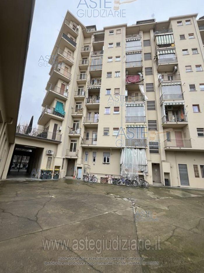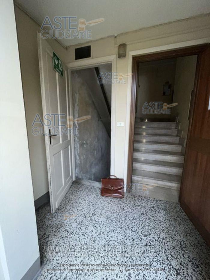 Alloggio al piano primo (2° f.t.) composto di ingresso, ripostiglio, tinello con cucinino, camera e servizio igienico ed annessa cantina al piano interrato. All'alloggio compete la proprietà esclusiva del balconcino verso cortile posto nell'interpiano tra il piano terreno e il piano primo