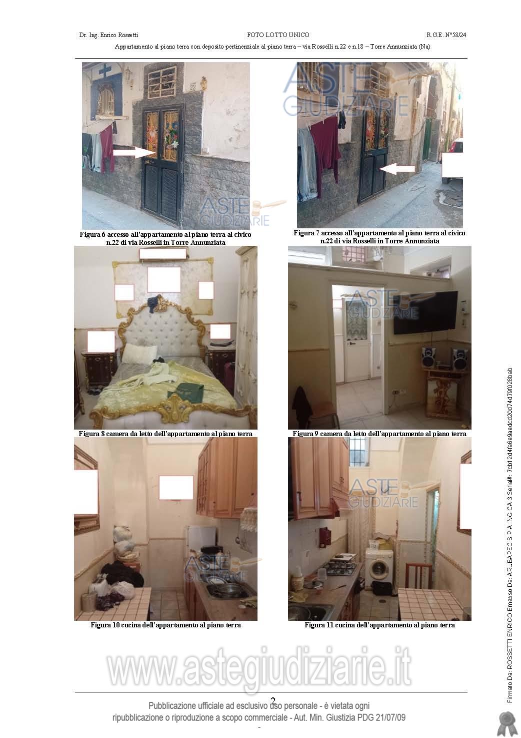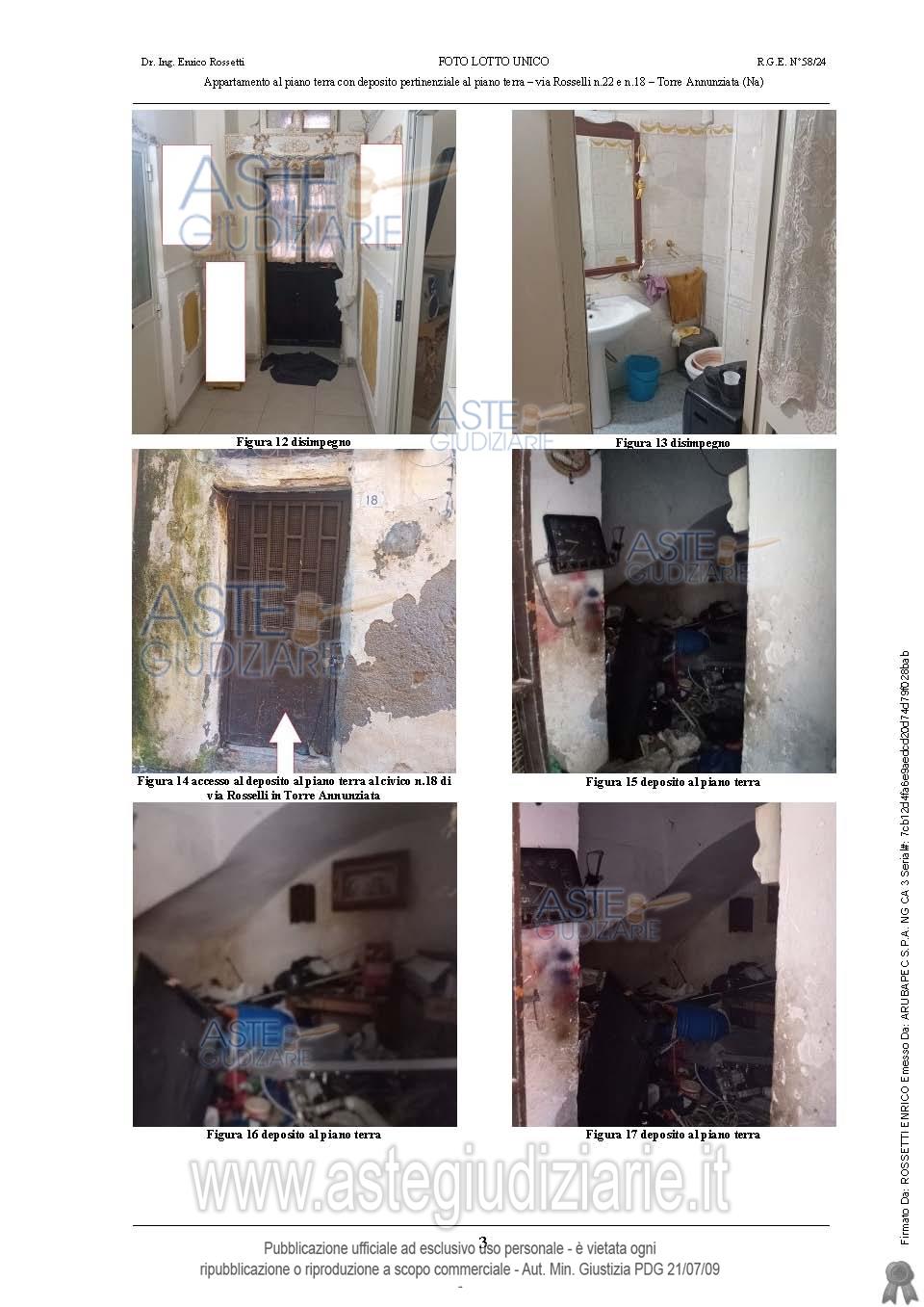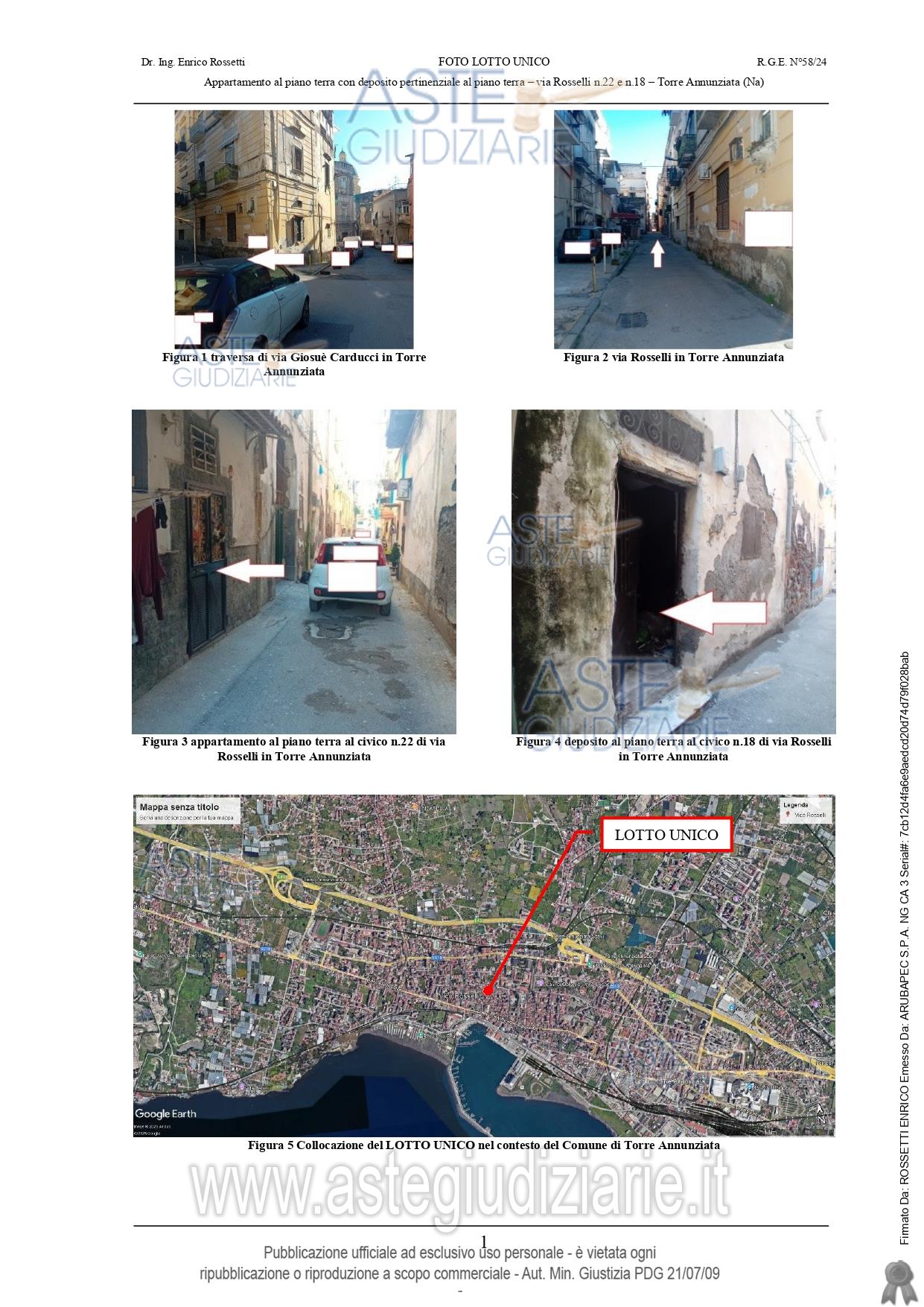 Piena ed esclusiva proprietà di: appartamento al piano terra identificato al Catasto del Comune di Torre Annunziata al foglio 6, p.lla 218 sub 37, via Rosselli n. 22 e n. 18 in Torre Annunziata (Na),- deposito pertinenziale al piano terra identificato al Catasto del Comune di Torre Annunziata al foglio 6, p.lla 218 sub 40, con accesso diretto da via Rosselli n. 22 e n. 18 in Torre Annunziata (Na), L’appartamento ha un’altezza utile interna massima di 4,50 m con soffitti a volta ed è composto da una camera da letto, una cucina, un disimpegno, un bagno avente l’altezza utile interna di 2,30 m e da un deposito pertinenziale accessibile solamente da via Rosselli n.18; l’appartamento confina a sud con via Rosselli, ad est con l’androne ed ad ovest con un’altra unità immobiliare; il deposito confina a sud con via Rosselli, ad ovest con l’androne ed ad est con un’altra unità immobiliare.