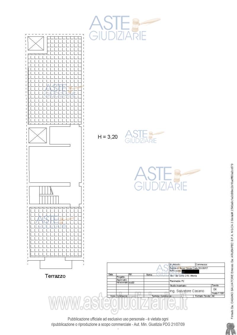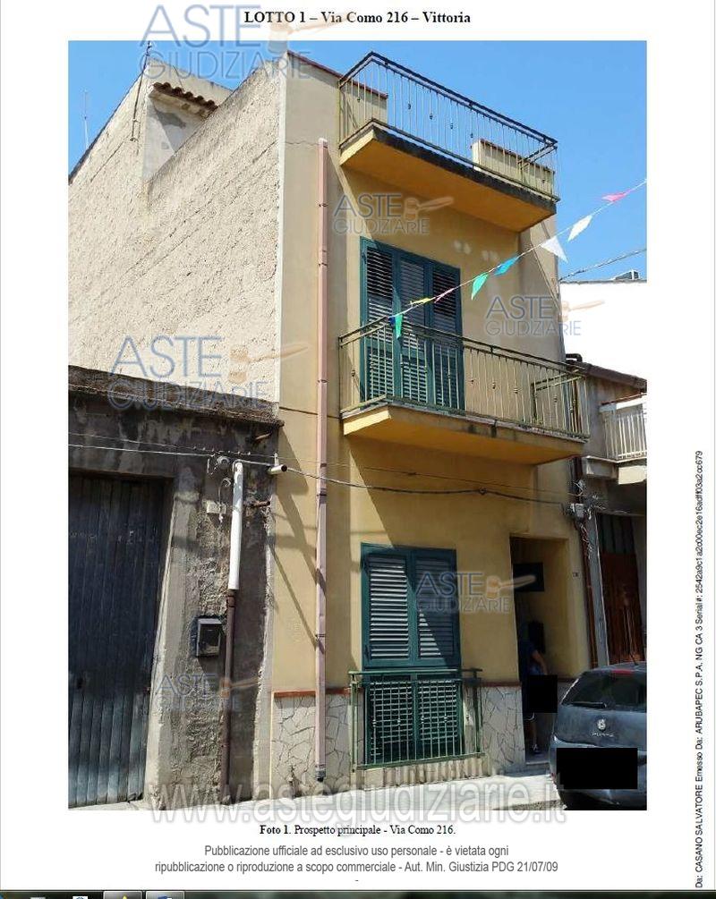 Piena proprietà di immobile residenziale ubicato in Vittoria (RG) in via Como 216, composto da piano terra, primo piano e secondo piano in cui sono presenti solo un deposito ed il lastrico solare, censiti al N.C.E.U del Comune di Vittoria al F. 210 part.lla 6234 sub 1, piano T, zona cens. 1, cat. A/4, classe 3, vani 5, superf. catastale totale 78 mq., RC € 218,46 e F. 210 part.lla 6234 sub 2, piano 1, zona cens. 1, cat. A/4, classe 3, vani 5, superf. catastale totale 77 mq., RC € 218,46.