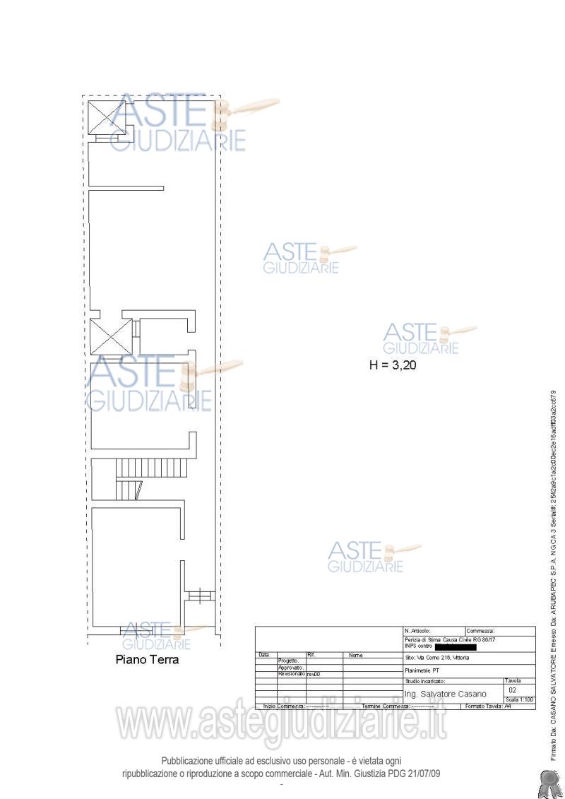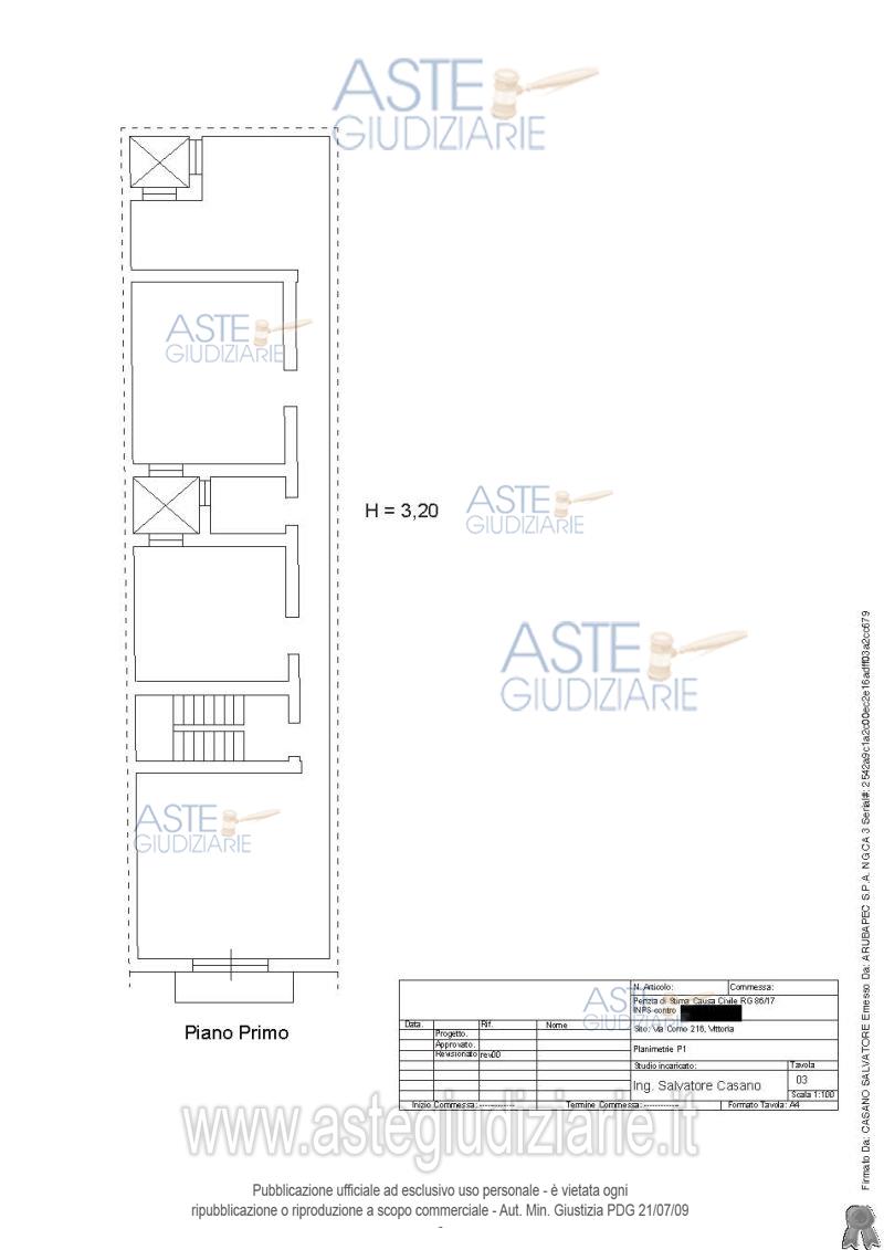 Piena proprietà di immobile residenziale ubicato in Vittoria (RG) in via Como 216, composto da piano terra, primo piano e secondo piano in cui sono presenti solo un deposito ed il lastrico solare, censiti al N.C.E.U del Comune di Vittoria al foglio 210 particella 6234 sub 1 (ex particella 146 sub 1), piano T, zona cens. 1, cat. A/4, classe 3, vani 5, superficie catastale totale 78 mq., Rendita Catastale € 218,46 e foglio 210 particella 6234 sub 2, piano 1, zona cens. 1, cat. A/4, classe 3, vani 5, superficie catastale totale 77 mq., Rendita Catastale € 218,46.