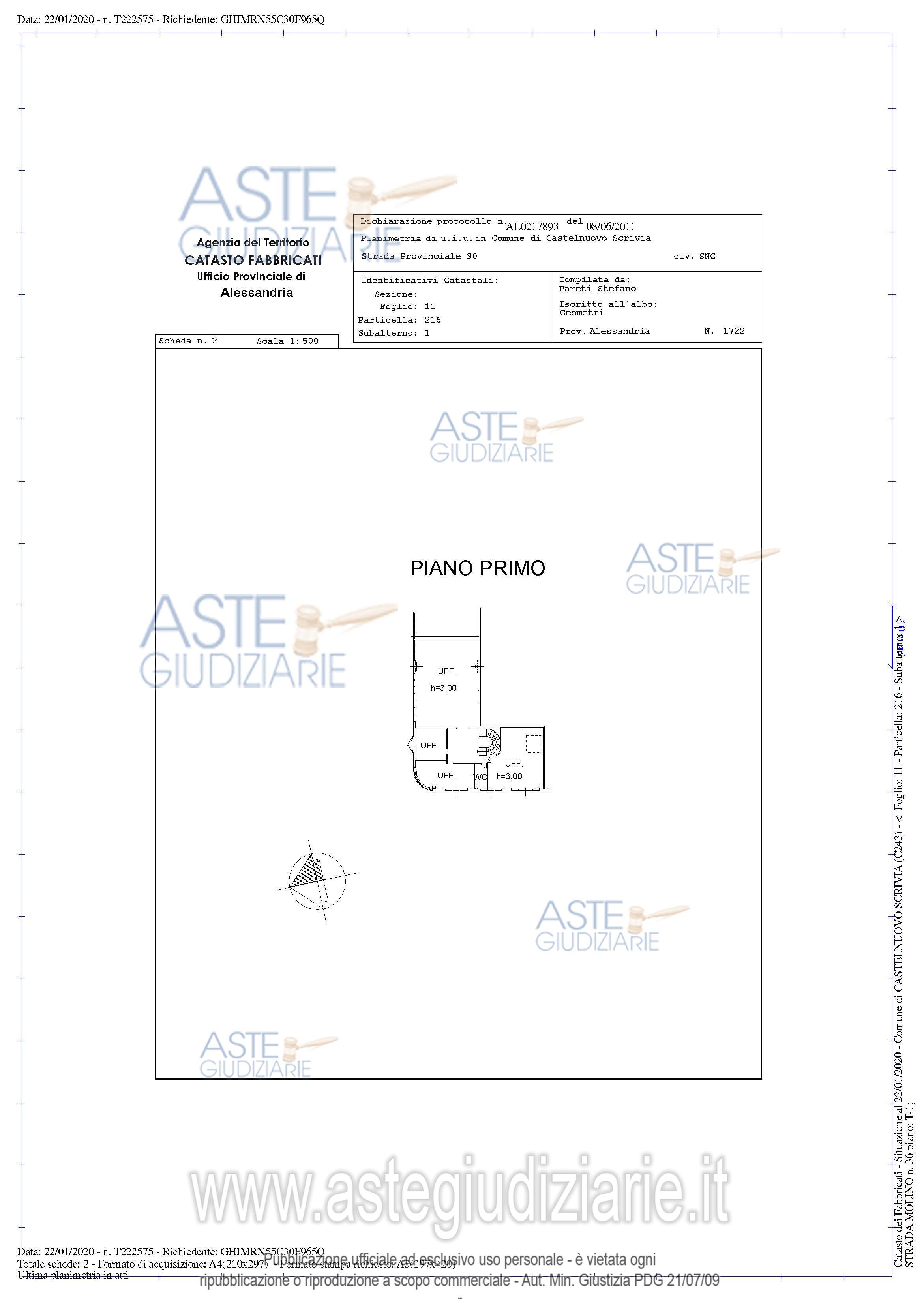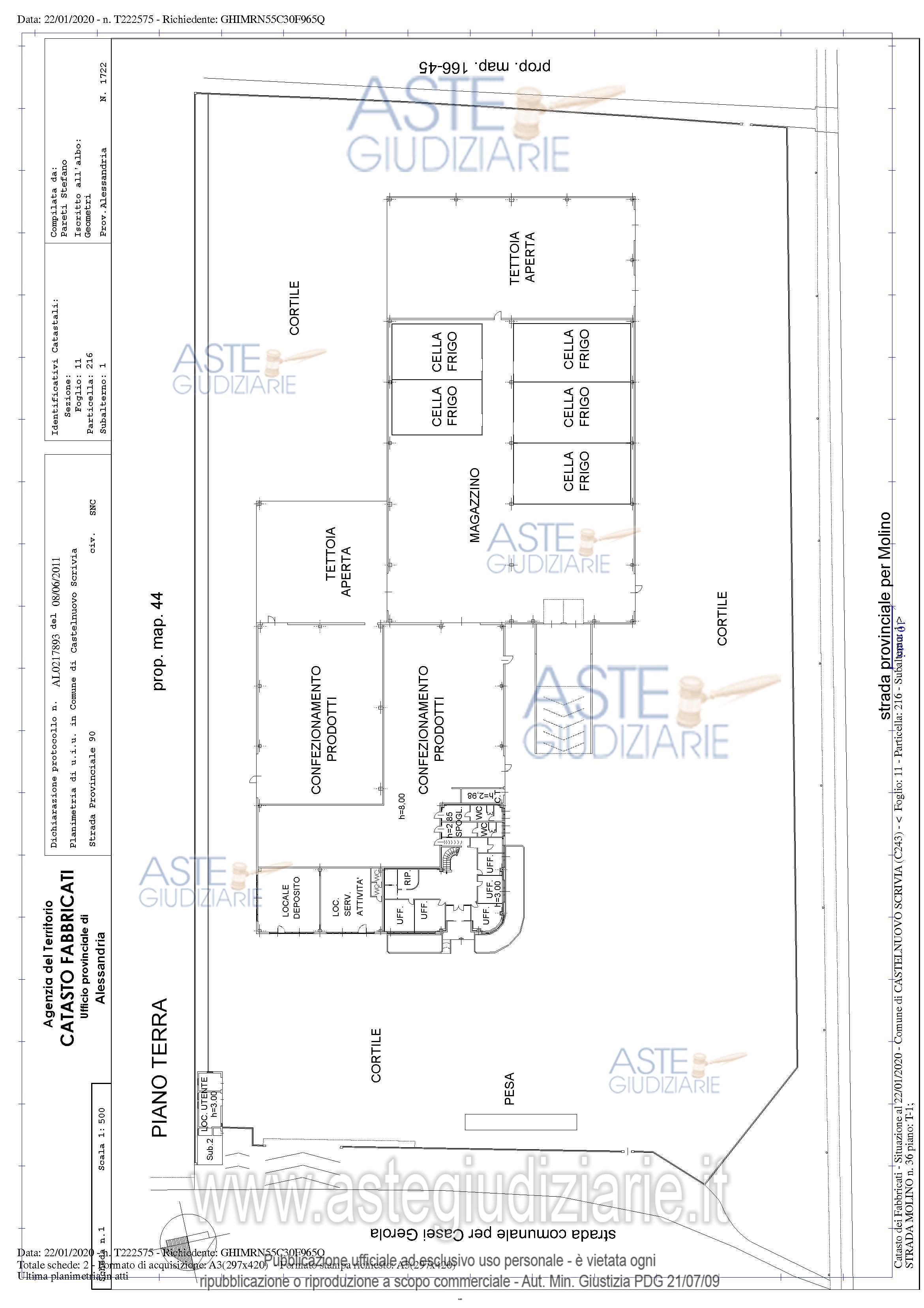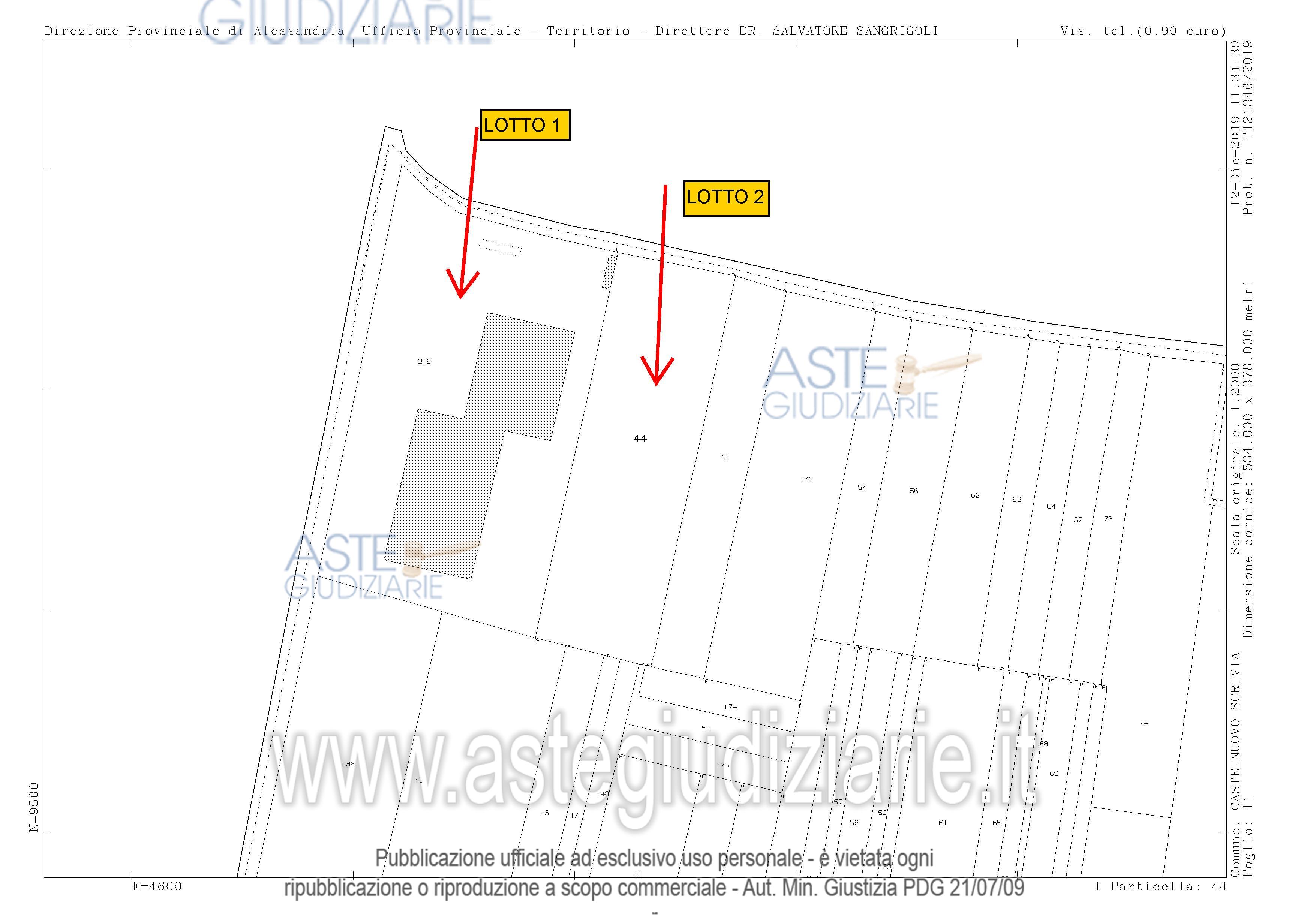 Piena proprietà di fabbricati per attivita’ agricole [D10] e opifici (D1) siti in Castelnuovo Scrivia (AL), strada Molino n.36 (in realtà strada prov. per Molino de'Torti n.36). Beni composti da un edificio principale con un locale "utente" ed una “Cabina ENEL”, capannone di mq. complessivi 5.536 oltre a cortile pertinenziale cintato e cabina enel.