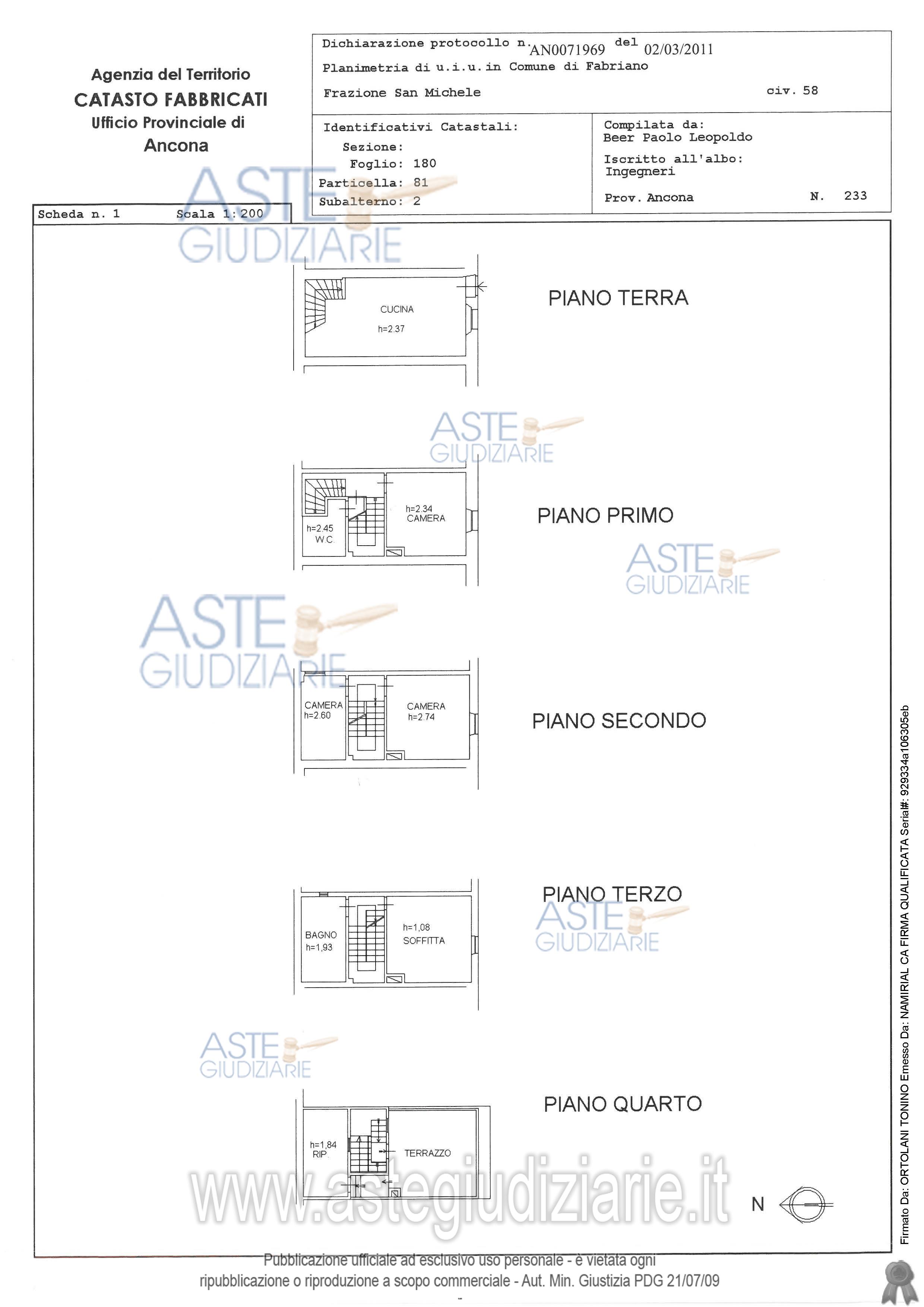 Fabbricato di civile abitazione ubicato a Fabriano (An) Frazione San Michele n 58 dislocato su 4 piano fuori terra, così composto: P.t. soggiorno-cucina; P 1° camera e bagno; P 2° camera e cameretta; P 3° bagno e sottotetto, P. 4° terrazza e ripostiglio.
