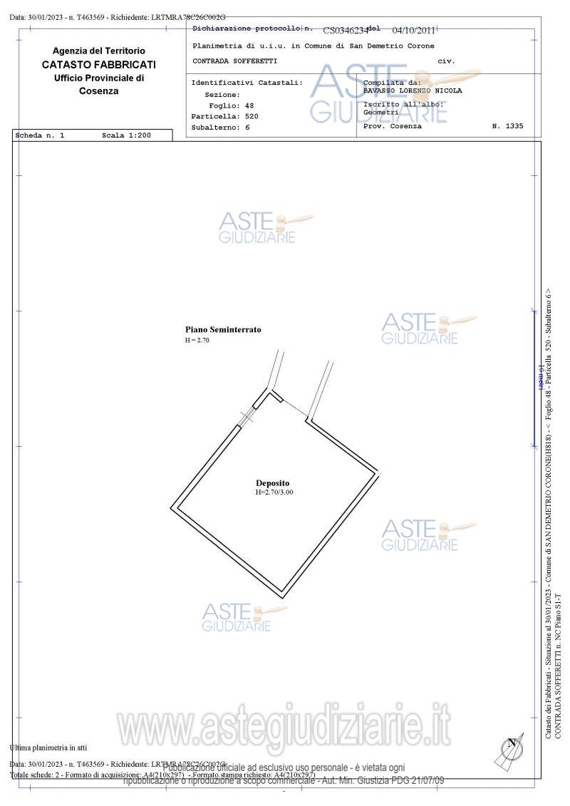 unità immobiliari, identificate nel N.C.E.U. al fg. 48, p.lla 518 sub 1 (locale deposito, sito a San Demetrio Corone, contrada Sofferetti della superficie commerciale di 23,28 mq, composto da un va...