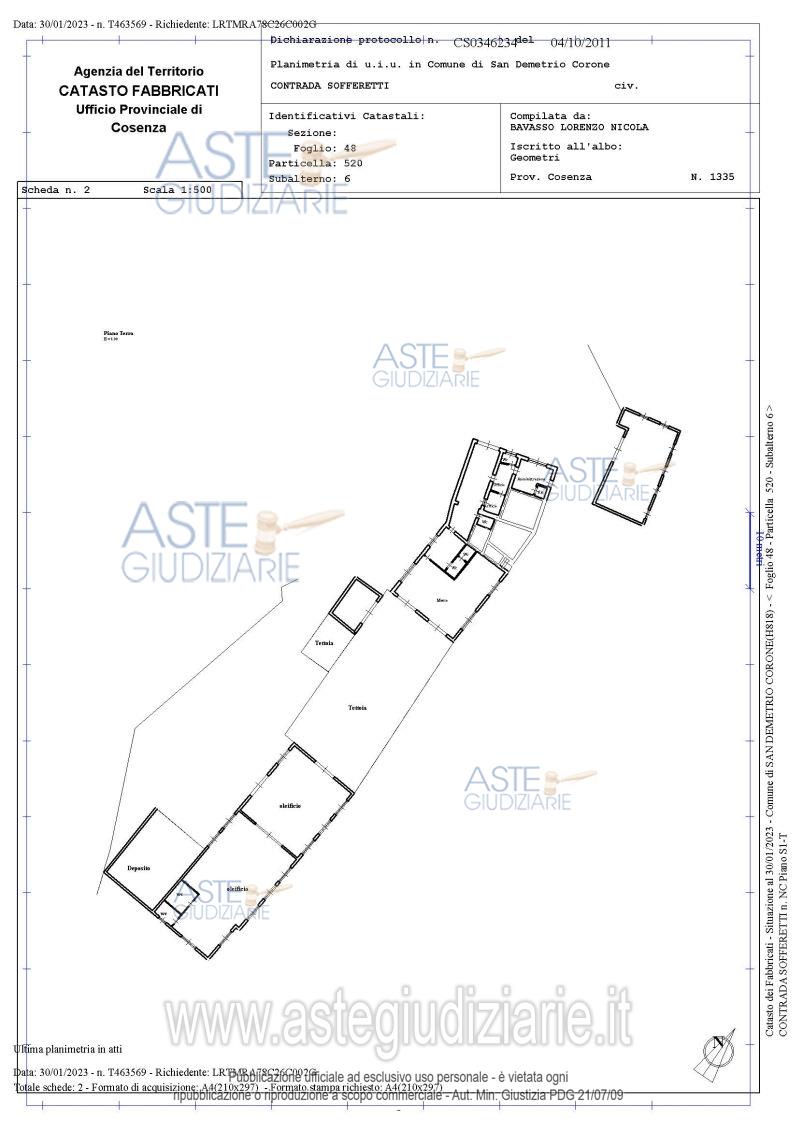 unità immobiliari, identificate nel N.C.E.U. al fg. 48, p.lla 518 sub 1 (locale deposito, sito a San Demetrio Corone, contrada Sofferetti della superficie commerciale di 23,28 mq, composto da un vano, cat. C/2, cl. U, cons. 62 mq, rendita € 80,05– trattasi di immobile abusivo e non sanabile), fg. 48, p.lla 519 sub 3 (fabbricato rurale a due piani, ubicato nel comune di San Demetrio Corone, contrada Sofferetti della superficie commerciale di 220,40 mq, cat. D/10, rendita € 2.912,00 – trattasi di immobile abusivo e non sanabile), fg. 48, p.lla 520 sub 6 (capannone industriale adibito a frantoio, sito a San Demetrio Corone, contrada Sofferetti, della superficie commerciale di 1.115,20 mq, cat. D/1, rendita € 6.939,10), 7 (appartamento sito a San Demetrio Corone contrada Sofferetti della superficie commerciale di 56 mq, posto al p.t. di un fabbricato di maggiore consistenza, articolato su un unico livello, con accesso unico esterno, costituito da: soggiorno-pranzo con angolo cottura, camera da letto matrimoniale, bagno e ripostiglio (ricavato nel sottoscala), cat. A/3, cl. 1, cons. 2,5 vani, rendita € 58,10) e 9 (unità immobiliare composta da due appartamenti, definiti “Appartamento A” ed “Appartamento B”, siti nel comune di San Demetrio Corone, contrada Sofferetti, della superficie commerciale di 242,88 mq, cat. A/3, cl. 1, cons. 5,5 vani, rendita € 127,82) e terreni di natura agricola, identificati nel N.C.T. al fg. 48, p.lle: 20, 24, 43, 45, 46, 127, 145, 162, 192, 193, 194, 195, 210, 213, 214, 215, 382, 383, 385, 517, siti nel comune di San Demetrio Corone e terreni identificati nel N.C.T. al fg. 15, p.lle: 86 , 87 ed 88, siti nel comune di San Cosmo Albanese.