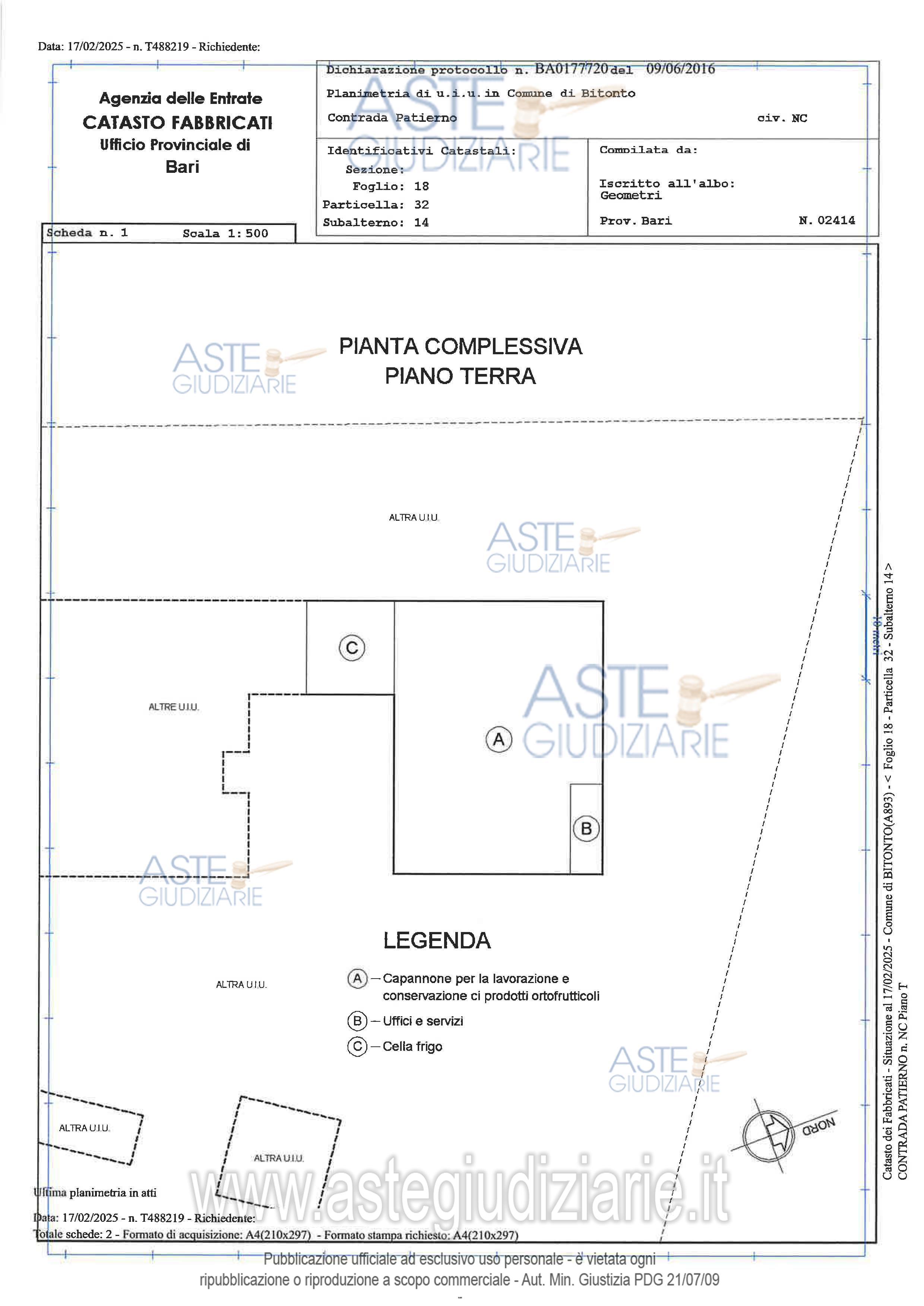 Piena e perfetta proprietà di un capannone industriale al piano terra, ubicato in Zona Agricola, in Contrada Patierno, con accesso dalla via Patierno composto di: un unico ambiente della superficie di metri quadri 750 circa adibito alla lavorazione e conservazione di prodotti ortofrutticoli con annessa cella frigorifera di metri quadri 118, una zona ufficio-spogliatoio-bagno di mq. 43.