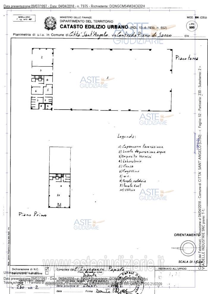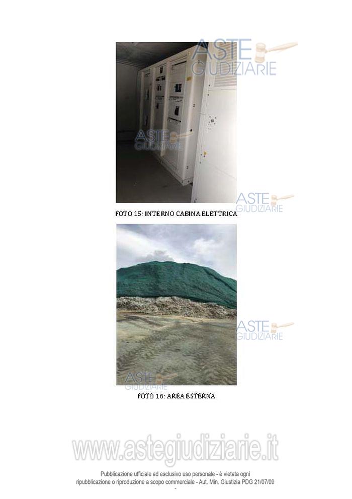 Piena proprietà di opificio industriale destinato al trattamento dei rifiuti; il capannone è realizzato in struttura prefabbricata monopiano in cemento armato, la cui dimensione in pianta è di ml 60 x 30; la palazzina uffici, con dimensione in pianta di ml. 30 x 10, realizzata in opera in cemento armato, è composta da un piano terra destinato a locali magazzino e locali di servizio e da un piano primo destinato ad uffici ed alloggio di eventuale custode; l’intero lotto è completamente recintato; l’intero complesso industriale è costituito da opifici di mq. 2.120, abitazione del custode di mq. 285,25, cortile (individuato con le particelle 230 e 255) di mq. 8.000, balcone di mq. 14,02.