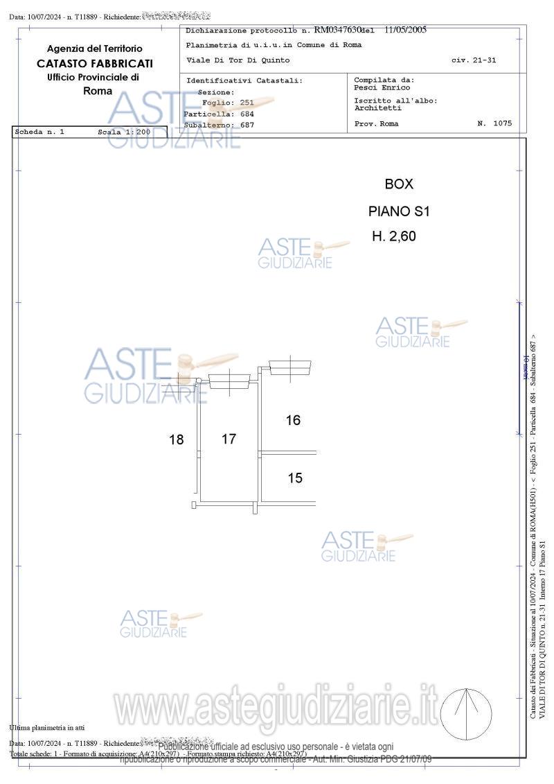 Quota pari a 100/100 del diritto di proprietà su box auto sito in Roma in Viale di Tor di Quinto 21 - 31, int. 17 piano S1, con accesso carrabile (e pedonale) dal civico 21 di viale di Tor di Quinto. Identificato al Catasto Fabbricati del Comune di Roma al foglio 251, part. 684, sub 687, rendita € 326,30, zona cens.4, cat. C/6 classe 7, consistenza 39 mq, superficie 43 mq, dalla forma sufficientemente regolare ed in ottimo stato d’uso. Confina con area di manovra – subalterni 686 e 688- salvo altri. Il box auto – come riportato in perizia – è dotato di impianto di illuminazione e l’accessibilità carrabile è valida. L’immobile è oggetto di un contratto di locazione ad uso diverso da abitativo tra l’esecutata e altra società, atto registrato a Viterbo il 12/12/2022 e trascritto a Roma 1 il 13.12.2022 al n. 114401 reg. part. e 161272 reg.gen., opponibile alla procedura. La singola porzione immobiliare è sublocata ad altro conduttore in virtù atto di sublocazione. Costruito in virtù di 1) concessione di licenza edilizia n. 2939 del 25.03.1997 (commissario ad acta); 2) concessione edilizia (variante e cambio destinazione d’uso n. 17/c del 09.01.2000; 3) concessione edilizia (variante in corso d’opera) n. 479/c del 18.04.2001; 4) concessione edilizia (variante in sanatoria) n. 56/cs del 27 marzo 2002; 5) DIA (presentata al IX dipartimento) per opere interne al n. 18629 del 24.03.2005; 6) ) DIA (presentata al IX dipartimento) per opere interne al n. 15784 del 22.04.2004. Certificato di agibilità richiesto in data 05.02.2007 al n. QI/2007/7915 e non ancora rilasciato. Stato di occupazione: occupato con titolo opponibile (contratto di locazione con scadenza al 31.12.2032); di fatto l’immobile è occupato dal subconduttore. Il tutto come meglio descritto nell’elaborato peritale depositato in atti.