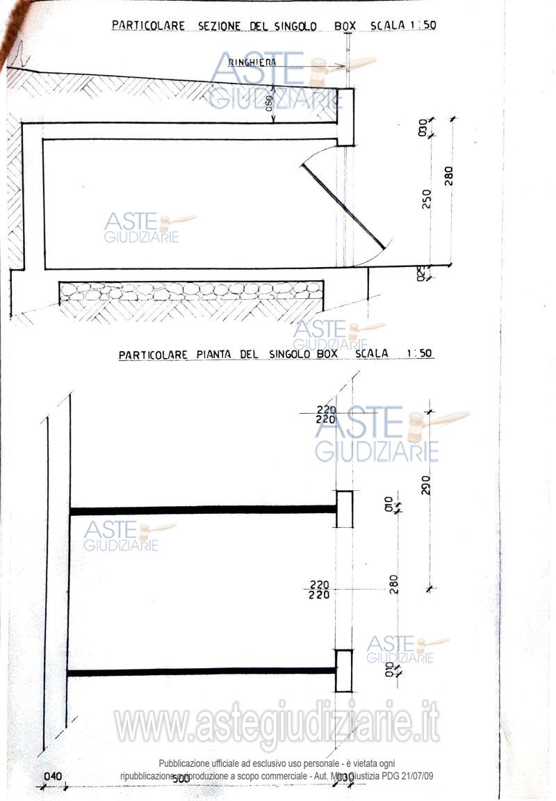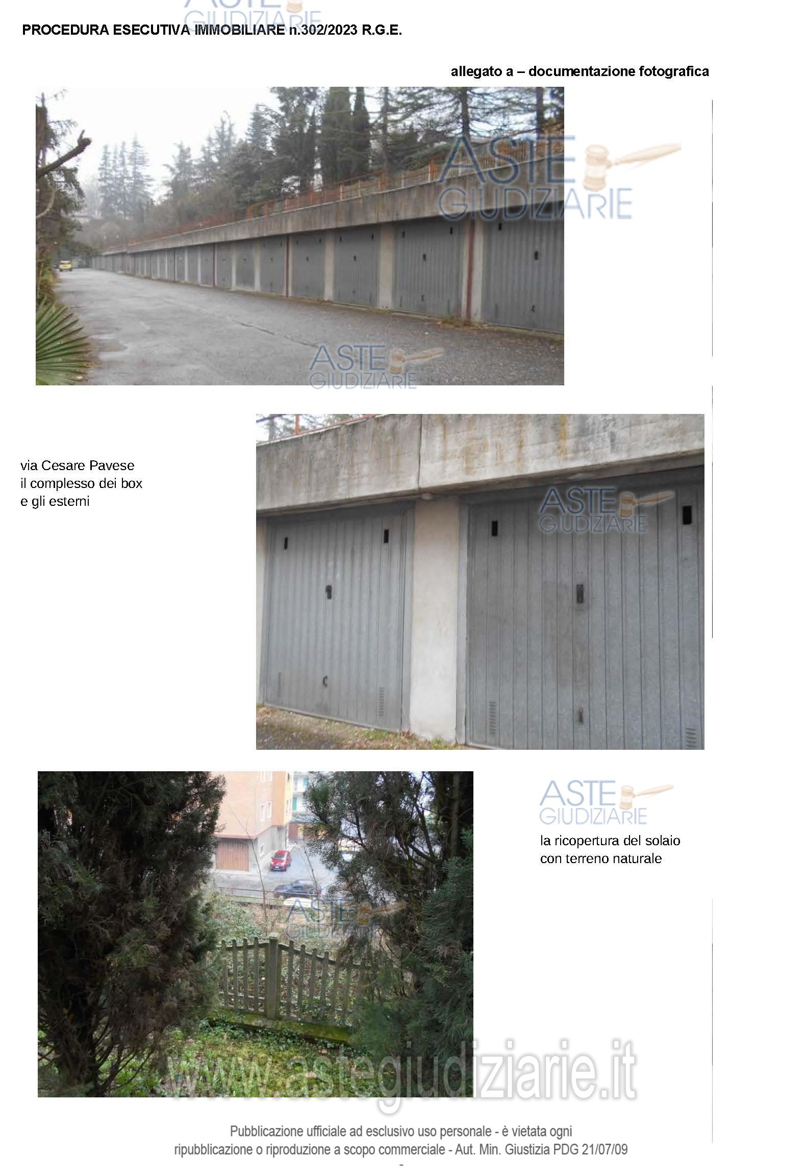 Box auto in comune di Serravalle Scriva (AL) – Via Cesare Pavese, facente parte di una serie di 37 elementi, tra loro identici, completati il 02.03.1987; ulteriori 10 elementi, nessuno dei quali incluso in procedura, sono stati successivamente realizzati a completare lo stato attuale.Il complesso dei 47 box, collocato sul retro di tre edifici residenziali preesistenti, è seminterrato al piede della collina e direttamente accessibile dal piano terreno.La struttura portante verticale, che costituisce anche la separazione dei singoli elementi, è in c.a. gettato in opera; la copertura è realizzata con un solaio a lastre di tipo “pradelles”, impermeabilizzato con guaina gommobituminosa e ricoperto da uno strato di terreno naturale su cui è cresciuta una vegetazione di arbusti ed alberi di medio fusto.La pavimentazione è in battuto di cls e le porte basculanti in metallo.Lo stato di conservazione ha un degrado più che altro estetico, connaturato all’età del calcestruzzo ed alla sua esposizione agli agenti atmosferici.Le pareti contro terra ed il solaio di copertura, prive di intonaco, presentano segni id infiltrazioni, causate dall’apparato radicale della vegetazione e dalla vetustà delle impermeabilizzazioni su solaio e muri contro terra, che non pregiudicano l’utilizzo del bene.Stato di manutenzione generale: sufficiente.Condizioni generali dell’immobile: adeguato alla sua destinazione d’uso.L’immobile risulta libero.