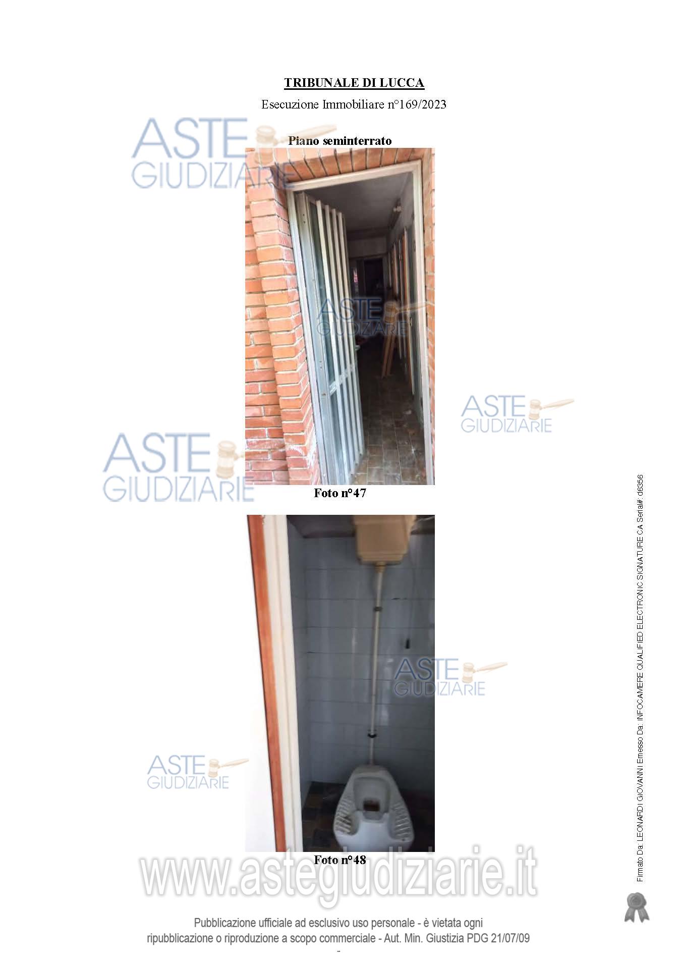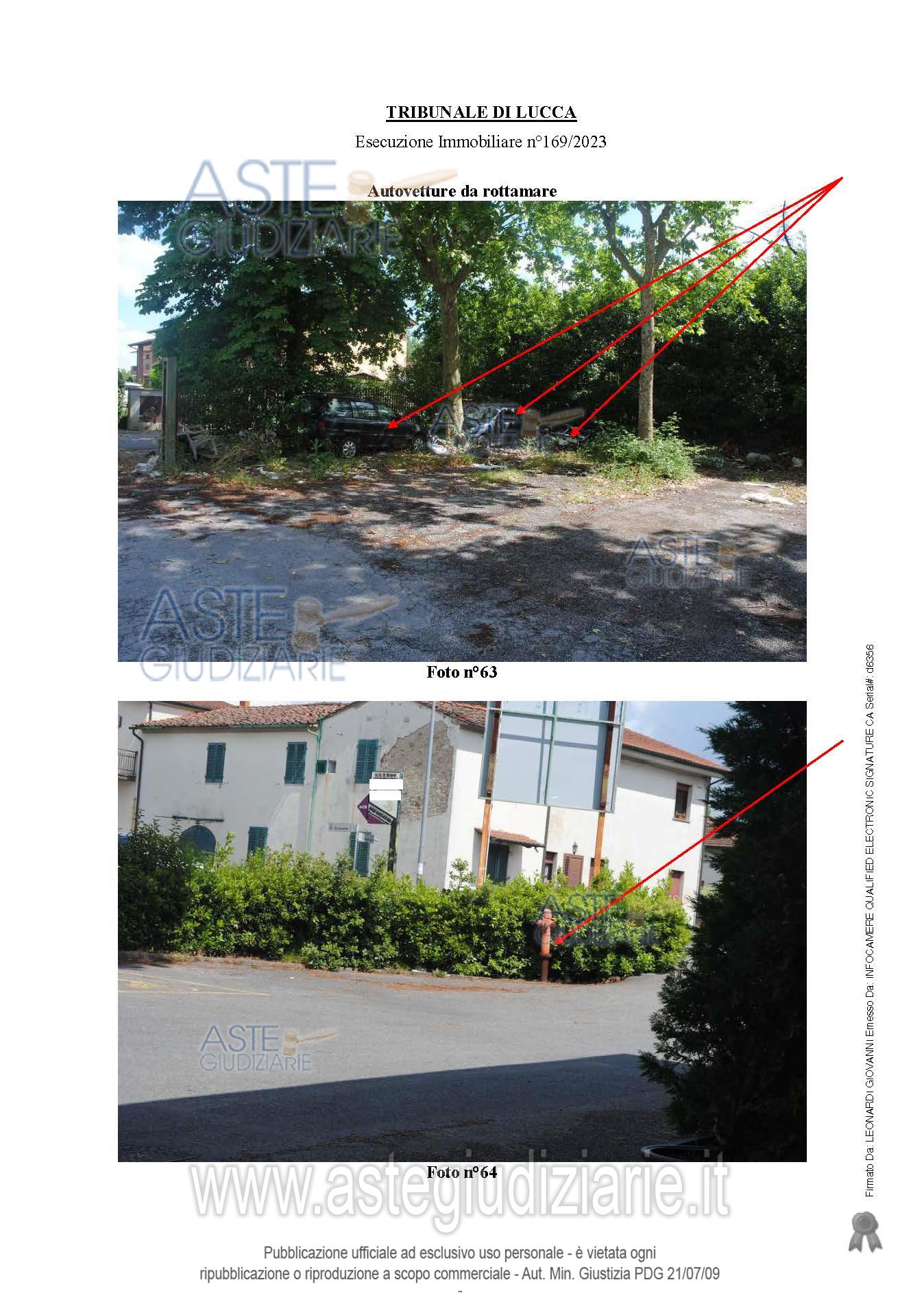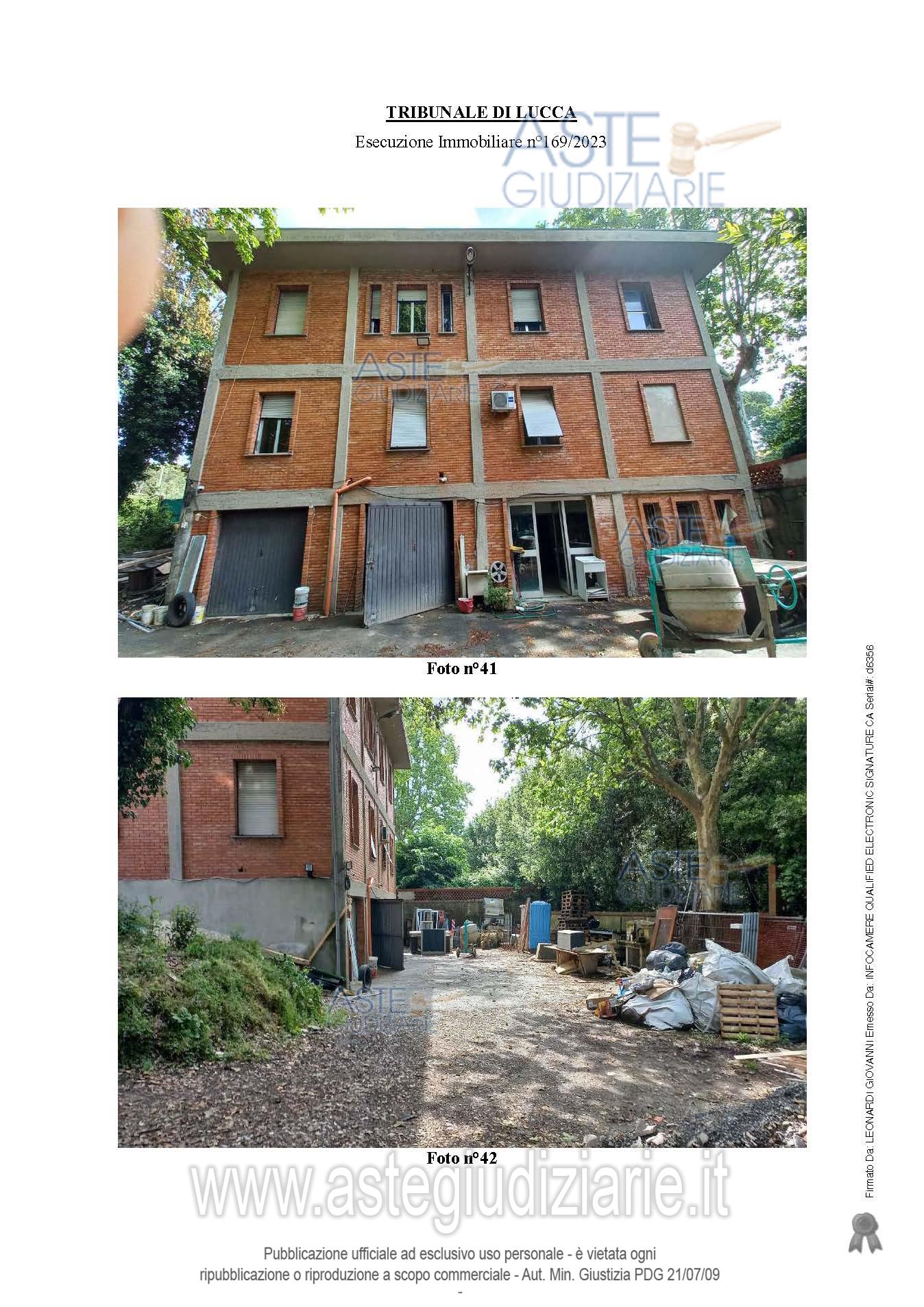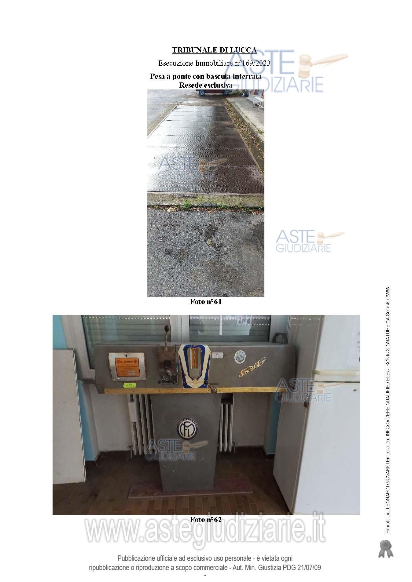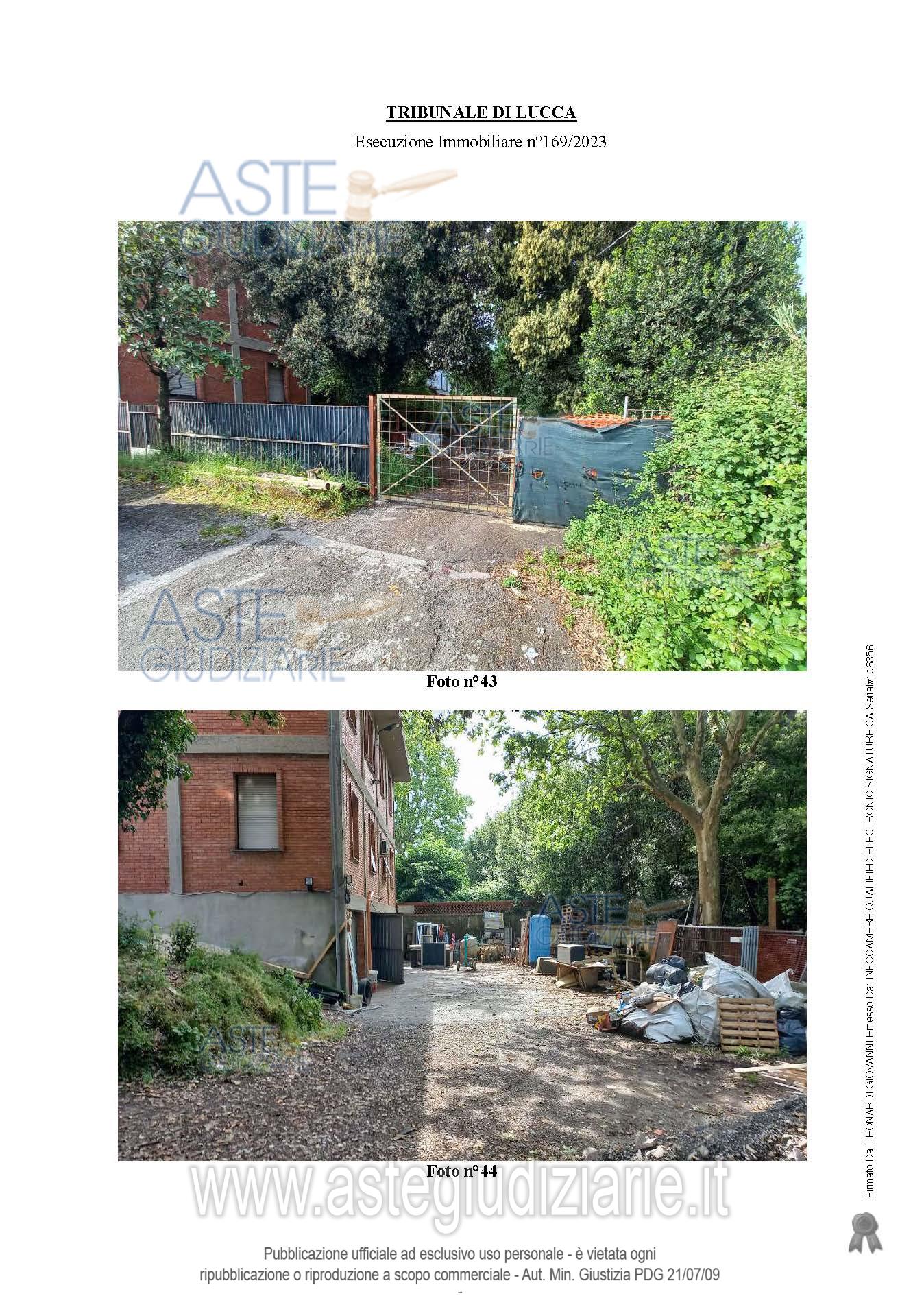 LOTTO QUATTRO. La piena proprietà per la quota di 1/1 su fabbricato da terra a tetto ad uso Uffici, magazzino e servizi igienici, elevato su due piani fuori terra, oltre piano seminterrato, corredato da ampia resede esclusiva su due lati, sulla quale insistono le rampe di accesso, nonché piccola resede sul fronte principale dove è collocata la pesa a ponte con bascula interrata, oltre resede comune a servizio anche degli altri immobili che insistono sullo stesso lotto di terreno, posto nel Comune di ALTOPASCIO (LU), Via Francesca Romea n.131(Foto dal n°39 al n°46). La palazzina, con la superficie commerciale di circa mq.389, è composta: -al piano seminterrato, con altezza di circa ml. 2,48, da locale per garage con portone basculante, due locali per magazzino e servizi igienici(Foto dal n°47 al n°50); -al piano terra, con altezza di circa ml.3,18, da atrio con rampa scale per raggiungere il piano superiore, tre locali per uffici, ripostiglio, disimpegno e servizio igienico(Foto dal n°51 al n°56); -al piano primo, con altezza di circa ml.3,20, da atrio di arrivo, locale segreteria, locale direzione, sala riunioni, spogliatoio, disimpegno e due servizi igienici(Foto dal n°57 al n°60).
