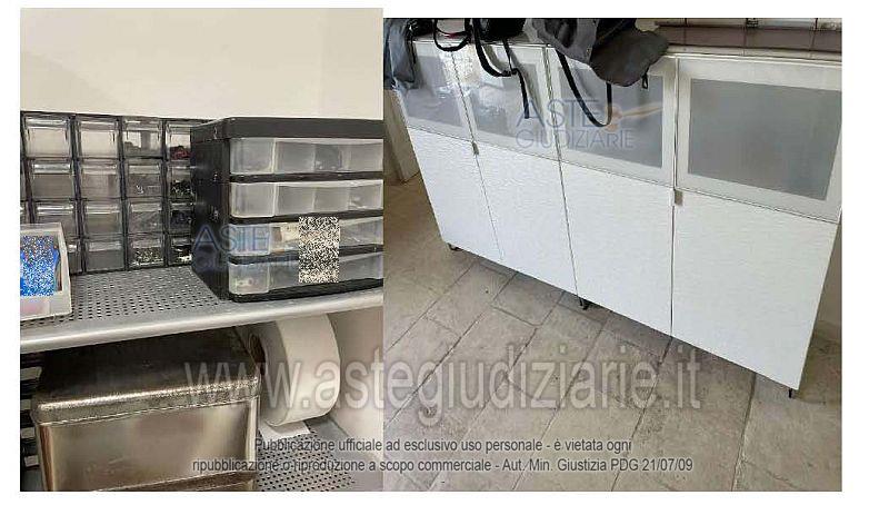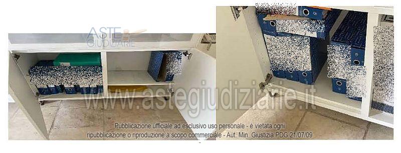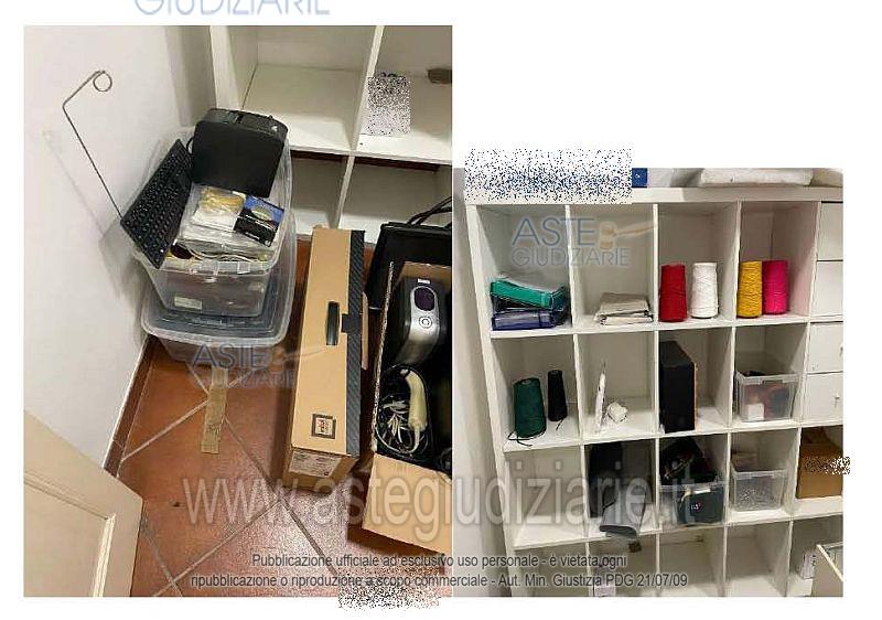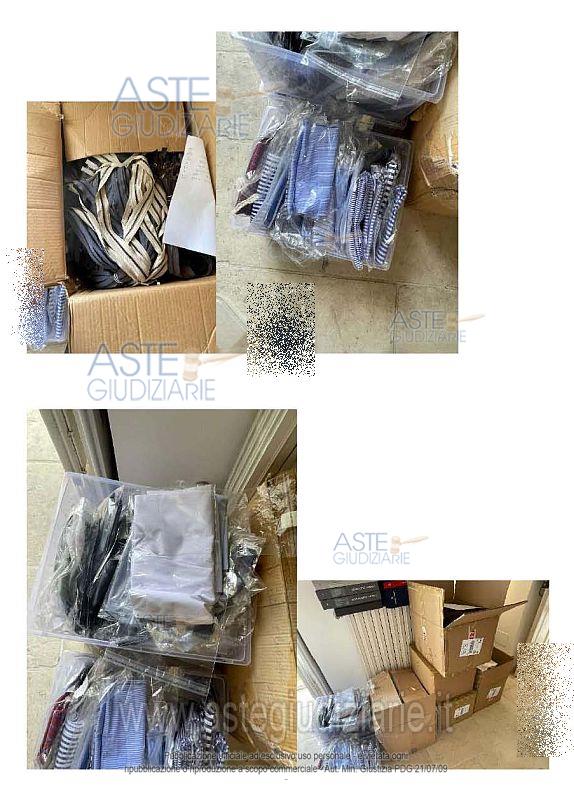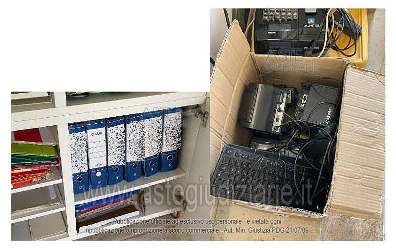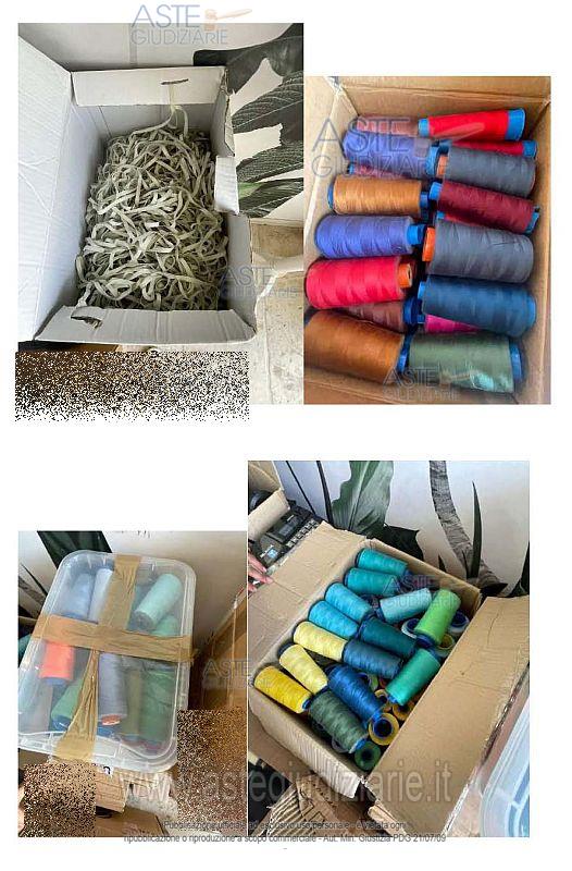 N. 1 scrivania in ferro e legno; N. 1 sedia da ufficio; N. 1 lampada; N. 1 cassettiera in legno a 3 cassetti; N. 1 lampada da scrivania; N. 1 tavolino IKEA modello Lack; N. 2 brandine singole; N. 1 libreria in legno; N. 1 pc sprovvisto di monitor; N. 4 rocchetti di cotone da merceria; N. 1 mobile basso bianco in legno a 8 ante; N. 1 mobile basso bianco in legno a 4 ante; N. 1 tagliacarte; Materiale vario di cancelleria; N. 2 etichettatrici; N. 4 registratori di cassa; N. 1 scatola contenente vari nastri 2 da merceria; N. 12 scatole contenenti rocchetti di cotone colorati; N. 5 scatole contenenti complessive 4680 cerniere da merceria; N. 2 scatole contenenti scampoli di tessuto; N. 11 book contenenti campioni di tessuto.