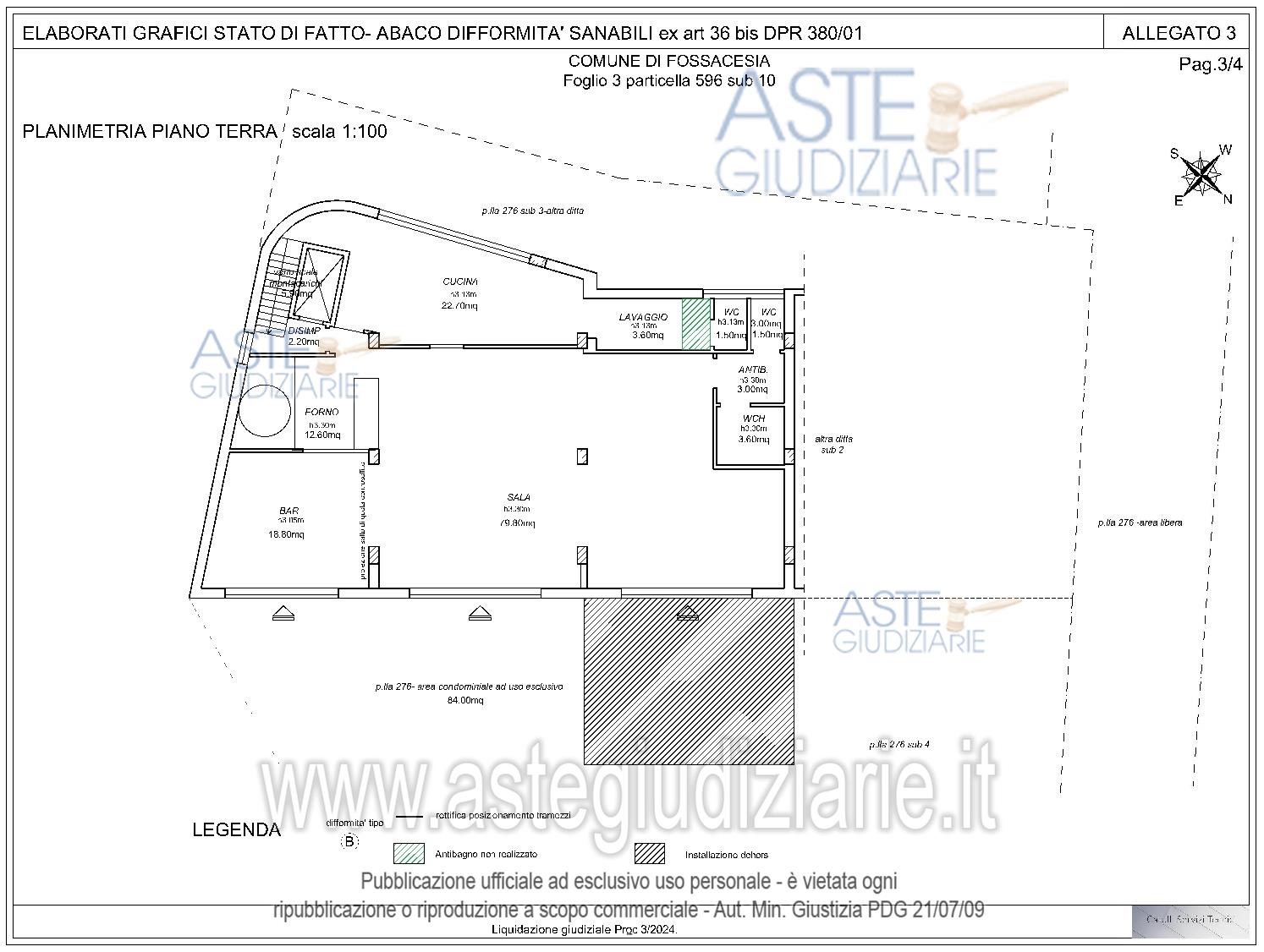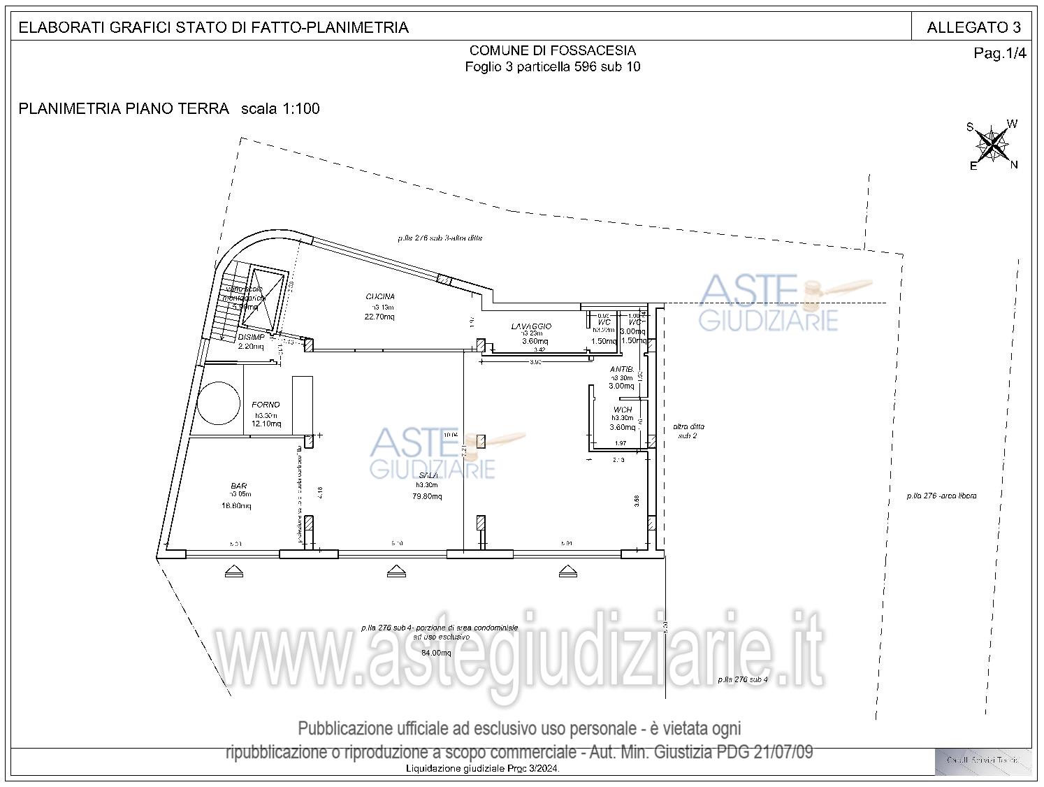 Diritti di piena proprietà su locale commerciale sito nel Comune di Fossacesia, in via Levante n. 2. L’immobile si trova all’interno di un fabbricato con ulteriori due piani destinati a civile abitazione. Il fabbricato affaccia su un piazzale adibito a parcheggio e passaggio riferito alla particella 276, con ingresso da Via Levante immediatamente nei pressi dell’incrocio con la Strada Statale 16 Adriatica.