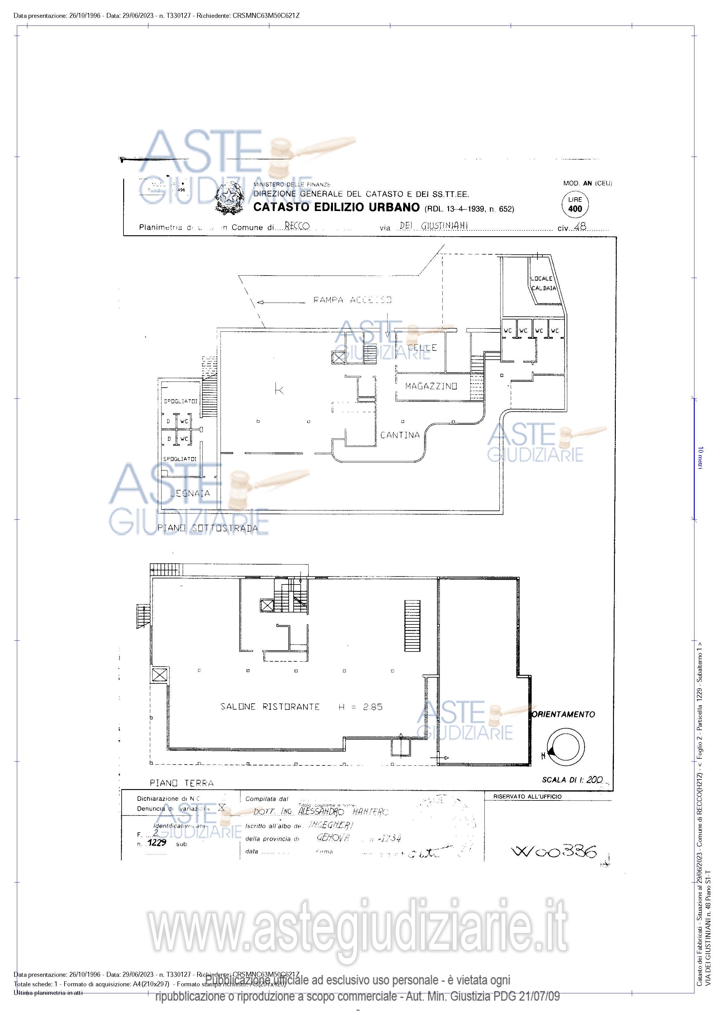 locale ristorante in Recco, Via dei Giustiniani 48, edificio 1. Il ristorante con locale veranda è sito al piano terra del fabbricato, al primo pano sotto strada è ubicato il locale cucina, la cantina, il magazzino, gli spogliatoi, i servizi igienici, la legnaia e uno spazio attrezzato con tavolini per la ristorazione.