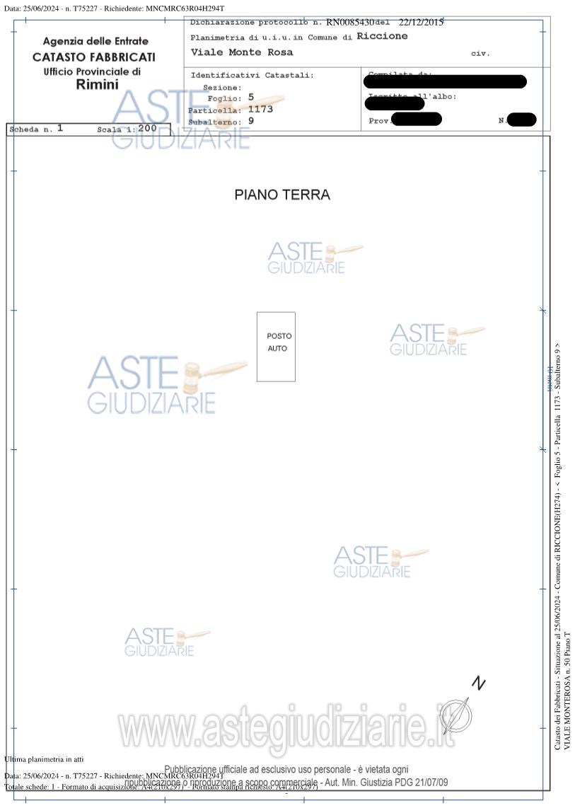 Piena proprietà per la quota di 1/1 su POSTO AUTO SCOPERTO al piano terra, ubicato in Piazzale 2 Giugno senza n.c. e con accesso da Viale Monte Rosa (in prossimità del fabbricato urbano in regime condominiale, denominato “Residenza Viale Emilia“), sito in Comune di RICCIONE (RN), Viale Emilia dal civico n. 12 al civico n. 18 angolo Viale Monte Rosa, sviluppa una superficie lorda complessiva di circa mq 13 (tredici), confinante con Piazzale 2 Giugno, Subalterni 8 e 10, salvo altri.