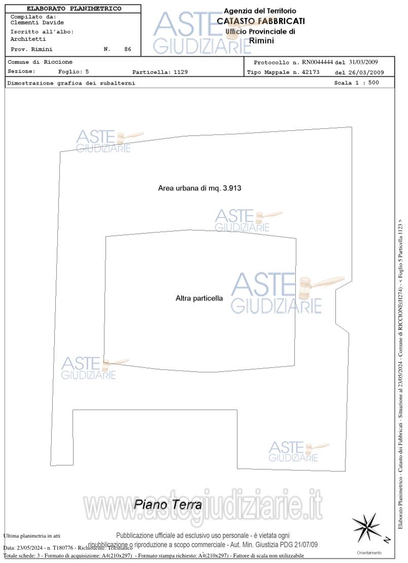 Piena proprietà per la quota di 1/1 su porzioni di fabbricato urbano in regime condominiale, denominato “Residenza I Pini“, ad uso civile abitazione, ufficio, autorimesse e posti auto scoperti, disposto su sei piani (interrato-terra-primo-secondo-terzo-quarto) sito in Comune diRICCIONE (RN), Viale Monte Rosa civico n. 50, e precisamente:? POSTO AUTO SCOPERTO al piano terra,confinante con i subalterni 44, 46 e 52, salvo altri;? AREA URBANA al piano terra,confinante con i subalterni 45, 52 e Particella 1127, salvo altri;? AREA URBANA al piano terra,confinante con Part. 1123 Subb. 44, 52 e Particella 1177, salvo altri.Sviluppano una superficie lorda complessiva di circa mq 22 (ventidue) di cui circa mq 13 (tredici) il posto auto scoperto e circa mq 9 (nove) le aree urbane.